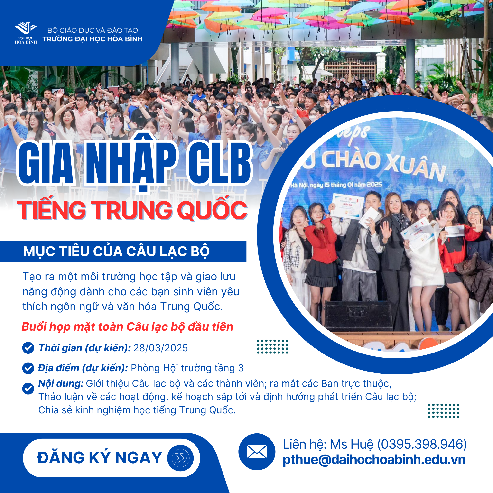 Nhằm tạo ra sân chơi lành mạnh, bổ ích cho sinh viên trong việc học tập và trao đổi ngôn ngữ, văn hóa Trung Quốc, Khoa Tiếng Trung Quốc, Trường Đại học Hòa Bình chính thức thành lập Câu lạc bộ Tiếng Trung Quốc.