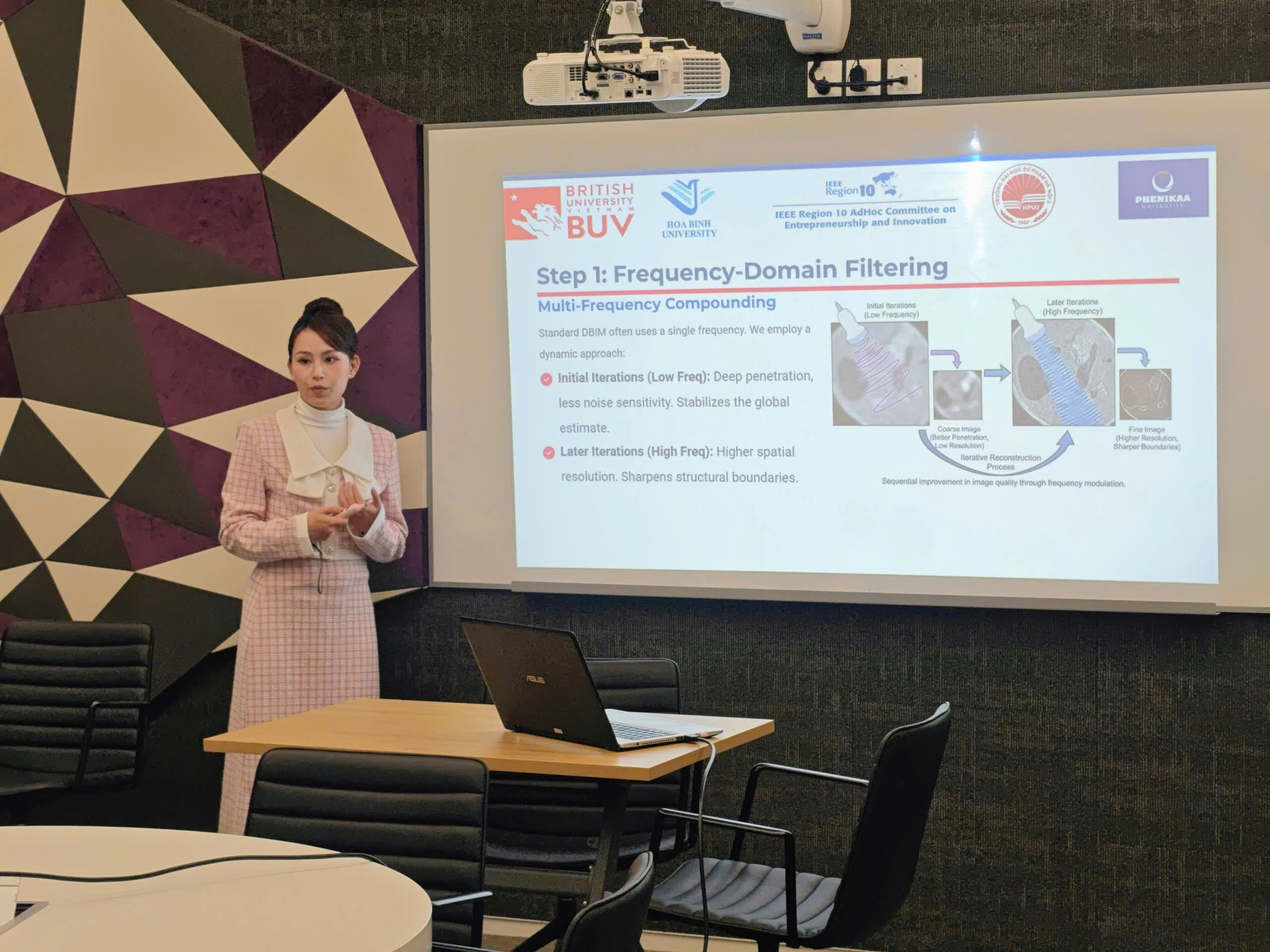 Tại phiên báo cáo kỹ thuật chiều ngày 12/12 (mã số phiên: Presentation Session 1), sinh viên Tạ Bích Hồng, lớp 524 YCT02, ngành Y học cổ truyền, Trường Đại học Hòa Bình – đại diện nhóm nghiên cứu trình bày đề tài “Lọc lai trong miền tần số và không gian nhằm tăng cường độ bền vững cho thuật toán DBIM trong chụp cắt lớp siêu âm” (“Hybrid Filtering in Frequency and Spatial Domains for Robust DBIM Ultrasound Tomography“) dưới sự hướng dẫn của TS. Lương Thị Thêu, Phó Trưởng Khoa Kinh tế và Khoa học cơ bản.