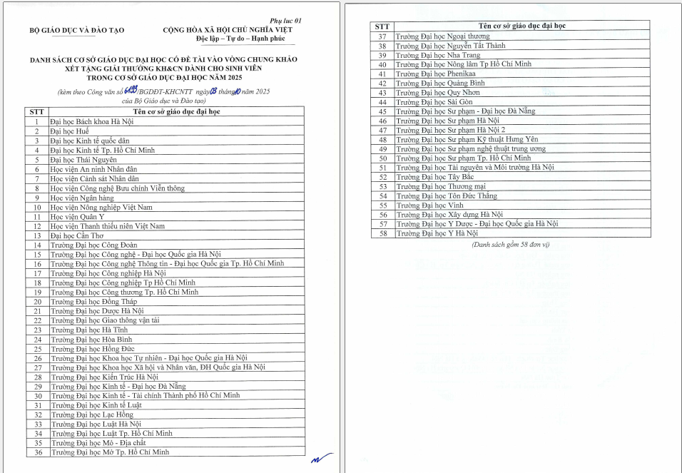 Giải thưởng Khoa học và Công nghệ dành cho sinh viên được tổ chức nhằm vinh danh các công trình nghiên cứu khoa học và công nghệ xuất sắc của sinh viên trên toàn quốc. Bộ Giáo dục và Đào tạo cho biết, vào chung khảo năm nay có 125 đề tài nghiên cứu được lựa chọn từ 58 cơ sở giáo dục đại học cả nước, với những tên tuổi như: Đại học Bách khoa Hà Nội, Đại học Huế, Đại học Kinh tế quốc dân, Học viện An ninh nhân dân, Trường đại học Nha Trang, Trường đại học Sư phạm Hà Nội, Trường đại học Y Hà Nội, Trường đại học Xây dựng, Học viện Công nghệ Bưu chính viễn thông,… thuộc 6 lĩnh vực chính: Khoa học Tự nhiên, Khoa học Kỹ thuật và Công nghệ, Khoa học Y-Dược, Khoa học Nông nghiệp, Khoa học Xã hội, và Khoa học Nhân văn.