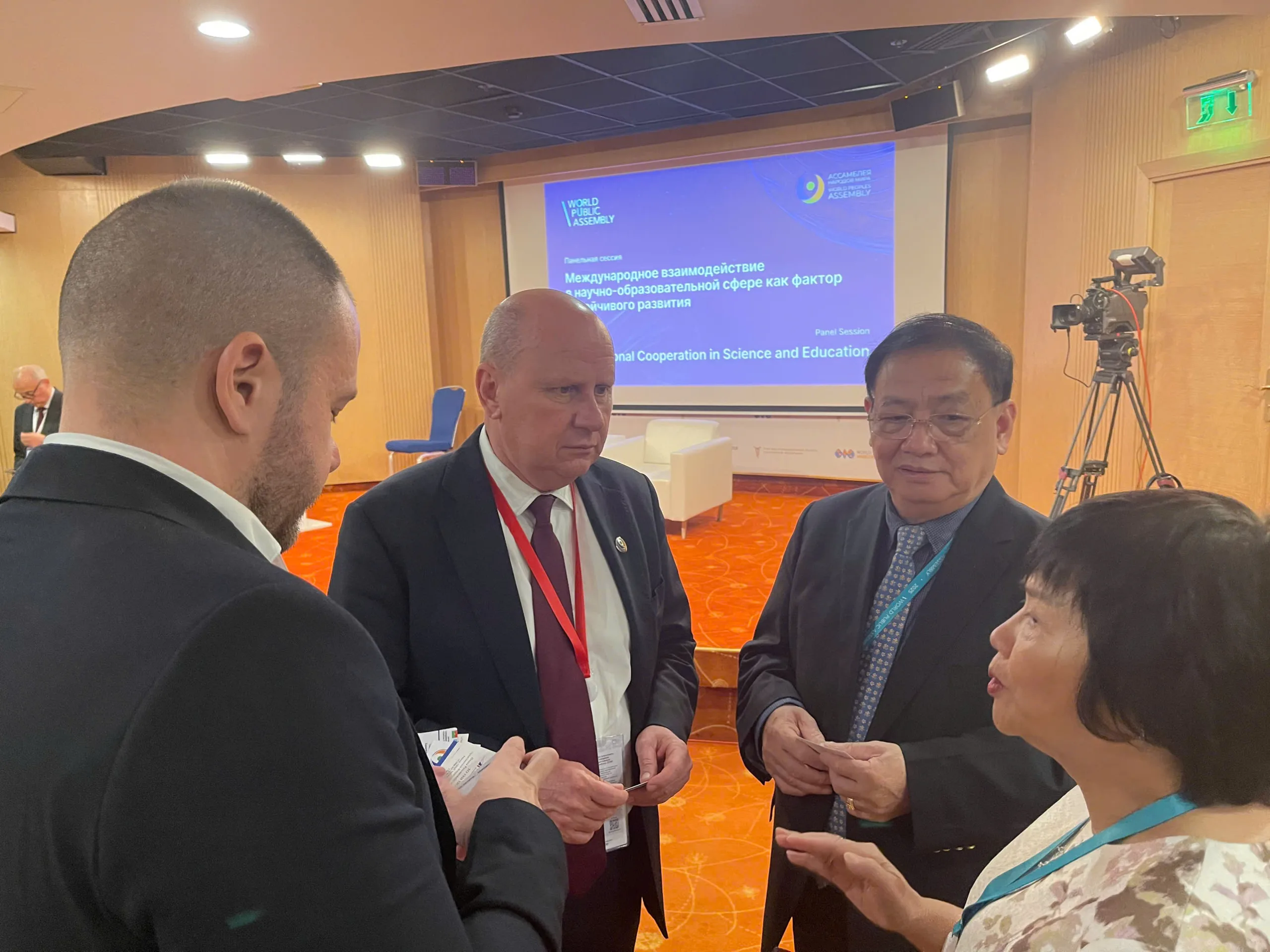 The President of Hoa Binh University in Hanoi presented a paper at the First Global Public Forum held in Moscow, Russia. Over two days, from September 20 to 21, 2025, a delegation from Hoa Binh University participated in this significant event at the invitation of the Secretary-General of the World Peoples’ Association. The delegation was led by Prof. Tô Ngọc Hưng, Vice Secretary-General of the Eurasian Peoples’ Association (now known as the World Peoples’ Association), who delivered a report on strategic breakthroughs for a generation of global citizens, emphasizing education that integrates science and technology for sustainable development.