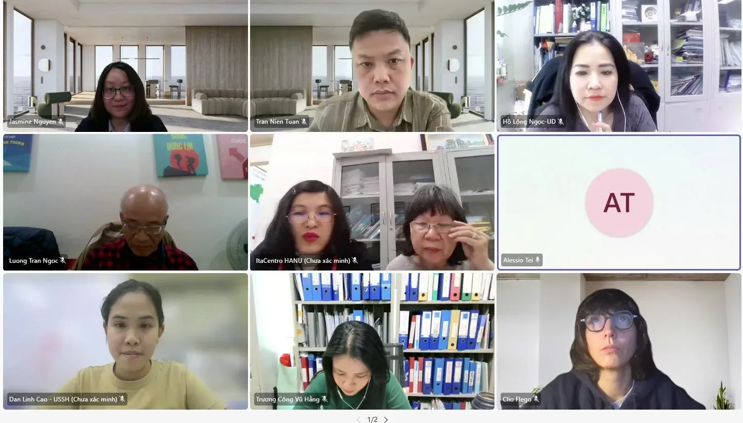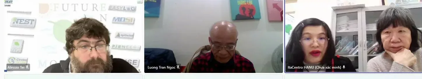 Tham dự cuộc họp có đại diện cán bộ, giảng viên Trung tâm ItaCentro (Đại học Hà Nội), đại diện một số trường đại học Việt Nam và GS. Alonso Tei cùng cán bộ kỹ thuật của trường Đại học Genoa Italia.