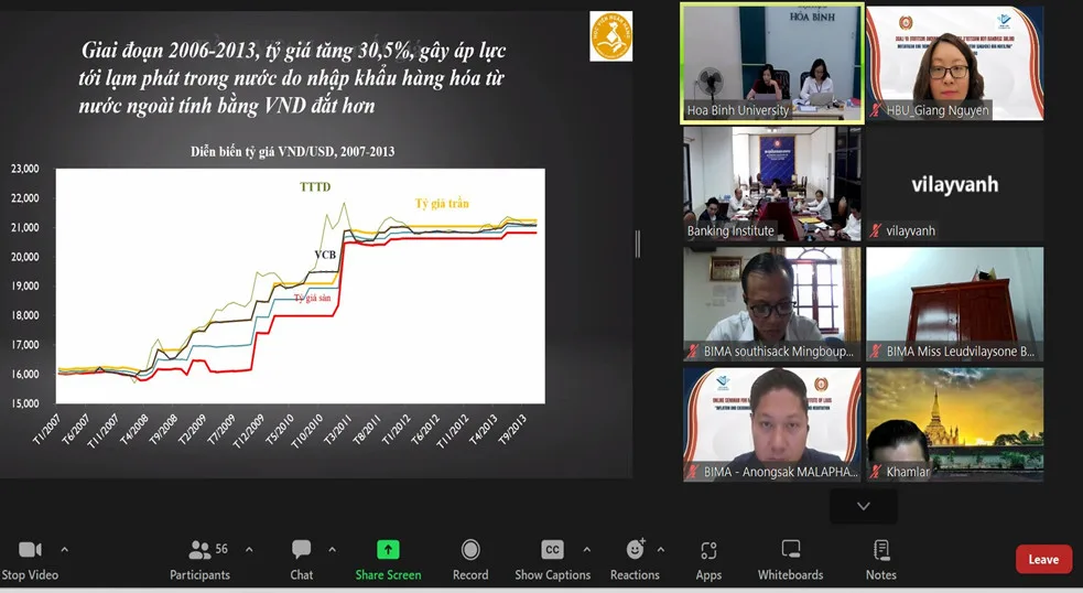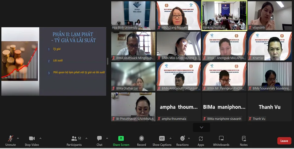 Sáng ngày 10/7, Trường Đại học Hòa Bình đã tổ chức lớp bồi dưỡng kiến thức về lạm phát, tỷ giá hối đoái và nâng cao kỹ năng quản lý, đàm phán (trực tuyến) dành cho cán bộ Ngân hàng Nhà nước Lào và Học viện Ngân hàng Lào.
