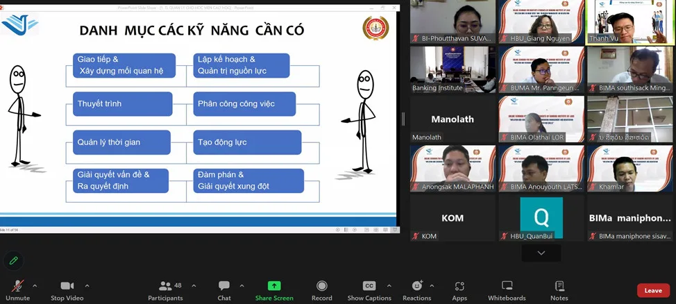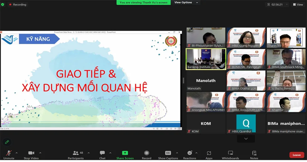 Trong phiên buổi chiều, lớp bồi dưỡng tục trao đổi và thực hành các kỹ năng về quản lý và giao tiếp hiệu quả theo hướng dẫn của TS. Vũ Hồng Thanh, giảng viên cao cấp, Phó trưởng phòng Giảng viên ngân hàng Thương mại Cổ phần Đầu tư và Phát triển Việt Nam (BIDV). Trong chuyên đề 2, các học viên Lào cùng báo cáo viên đã tìm hiểu các kỹ năng như: Lập kế hoạch trong quản lý; Kỹ năng tổ chức và quản trị nguồn lực; kỹ năng phân công, giao việc; kỹ năng giao tiếp và đàm phán cho người quản lý; kỹ năng giải quyết vấn đề cho người quản lý; kỹ năng quản lý thời gian; các kỹ thuật tạo động lực và thuyết phục; kỹ năng xây dựng mối quan hệ tốt với đồng nghiệp và đối tác kinh doanh; kỹ năng giải quyết xung đột, đàm phán hiệu quả…