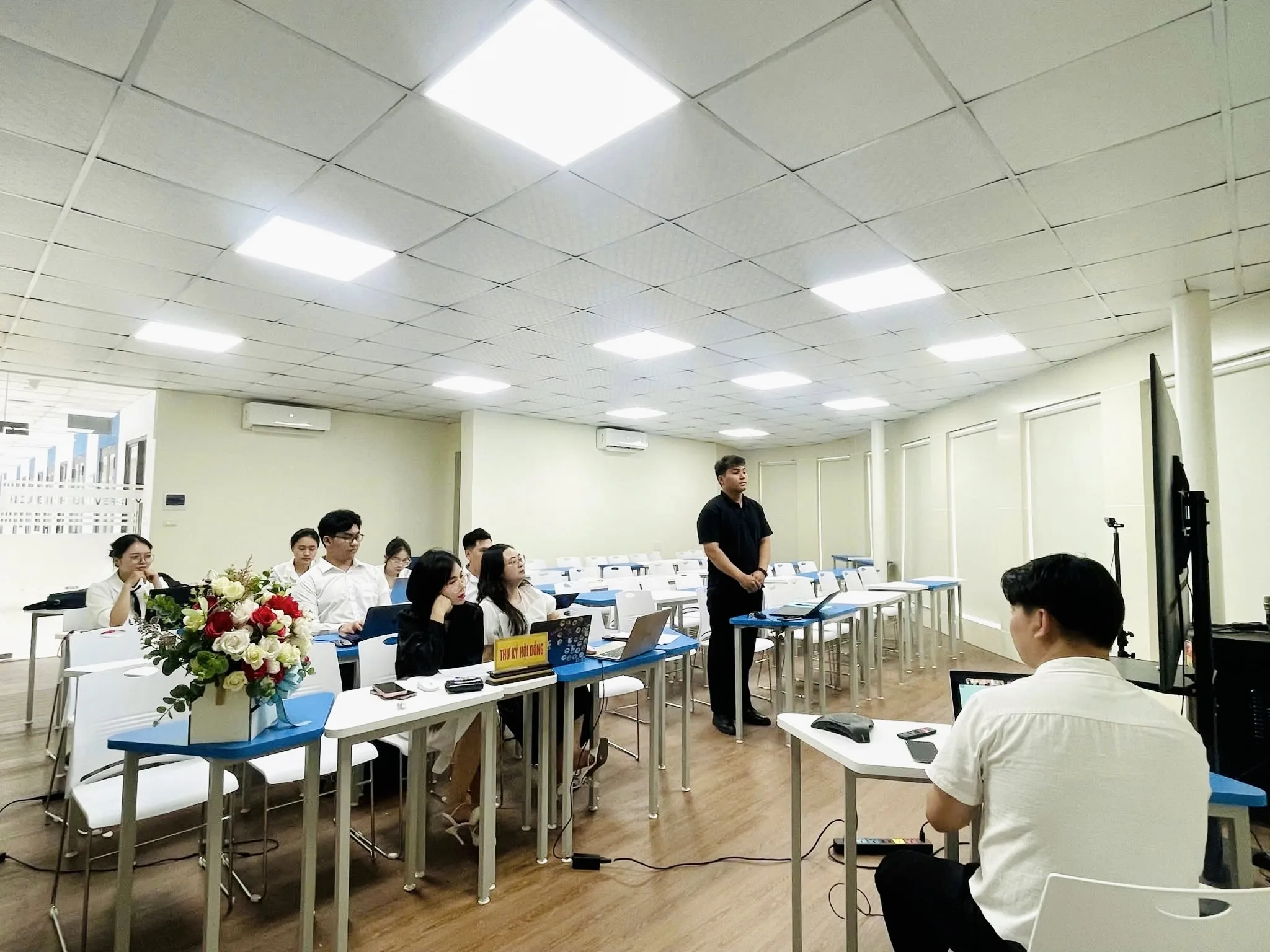 Các nhóm sinh viên lần lượt trình bày tóm tắt kết quả nghiên cứu đề tài, sau đó, Hội đồng đánh giá, và các chuyên gia của Khoa đã phản biện, đặt ra nhiều câu hỏi chuyên sâu, giúp sinh viên nhìn nhận rõ hơn về điểm mạnh, điểm hạn chế của đề tài. Không khí của buổi bảo vệ diễn ra trang nghiêm nhưng cởi mở, tạo điều kiện để sinh viên phát huy năng lực và học hỏi từ các góp ý của Hội đồng chuyên môn. Các nhóm sinh viên hăng say chuẩn bị tài liệu, các giảng viên tận tình góp ý chính là minh chứng cho một môi trường học thuật chất lượng, nghiêm túc tại Khoa Luật – Trường Đại học Hòa Bình.