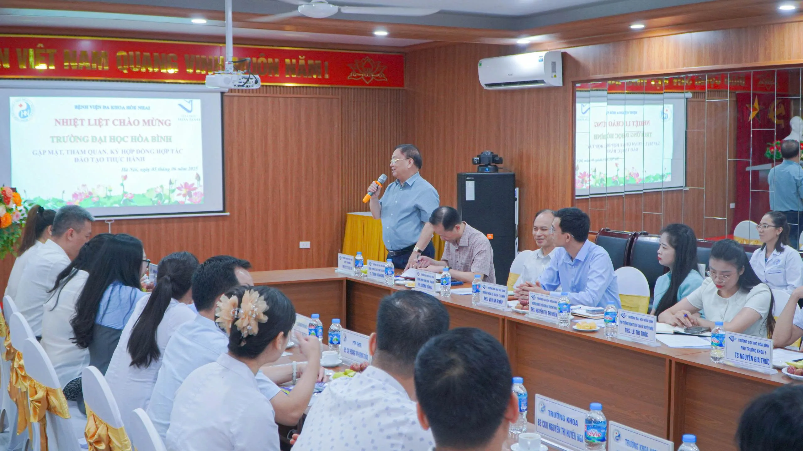 NGND.PGS.TS. Tô Ngọc Hưng cũng nhấn mạnh rằng: “Việc liên kết giữa nhà trường và các cơ sở y tế là một trong những yếu tố then chốt để nâng cao chất lượng đào tạo các ngành thuộc khối sức khỏe. Với triết lý giáo dục gắn lý thuyết với thực tiễn, Trường Đại học Hòa Bình luôn coi trọng việc đưa sinh viên tiếp cận sớm với môi trường bệnh viện, giúp các em rèn luyện kỹ năng chuyên môn, đạo đức nghề nghiệp và thái độ phục vụ người bệnh. Chúng tôi rất mong muốn thiết lập mối quan hệ hợp tác bền vững, lâu dài với Bệnh viện Đa khoa Hòe Nhai – một cơ sở y tế có uy tín, giàu kinh nghiệm và đội ngũ cán bộ chuyên môn cao.”