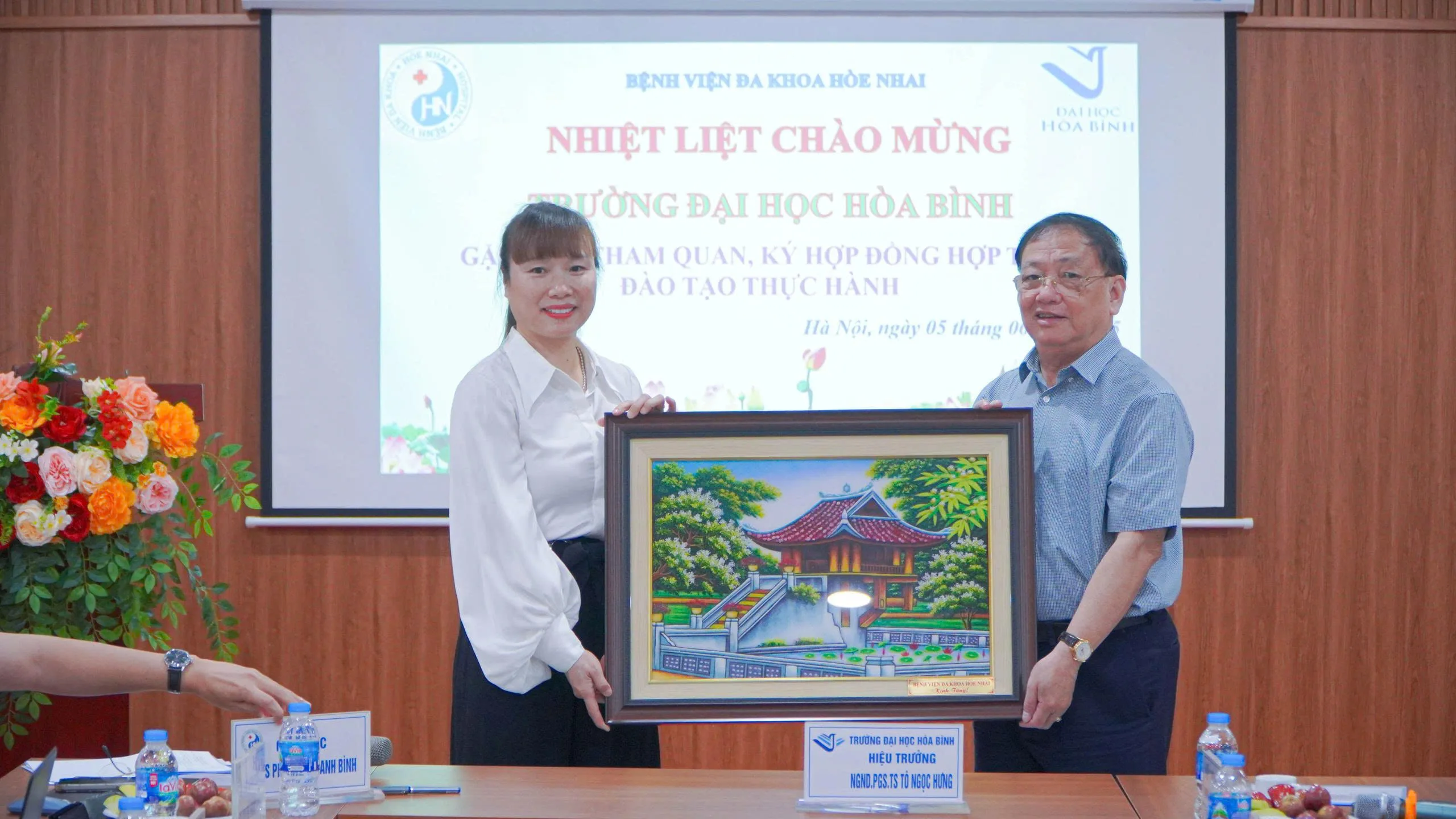 Nhân dịp này, hai đơn vị đã trao tặng quà lưu niệm, thể hiện sự trân trọng và gắn bó trong mối quan hệ đối tác. Đoàn đại biểu Trường Đại học Hòa Bình cũng đã có chuyến thăm quan thực tế tại các khoa, phòng thuộc cơ sở 2 của Bệnh viện, qua đó hiểu rõ hơn về cơ sở vật chất, môi trường thực hành, sẵn sàng cho các hoạt động hợp tác trong thời gian tới.