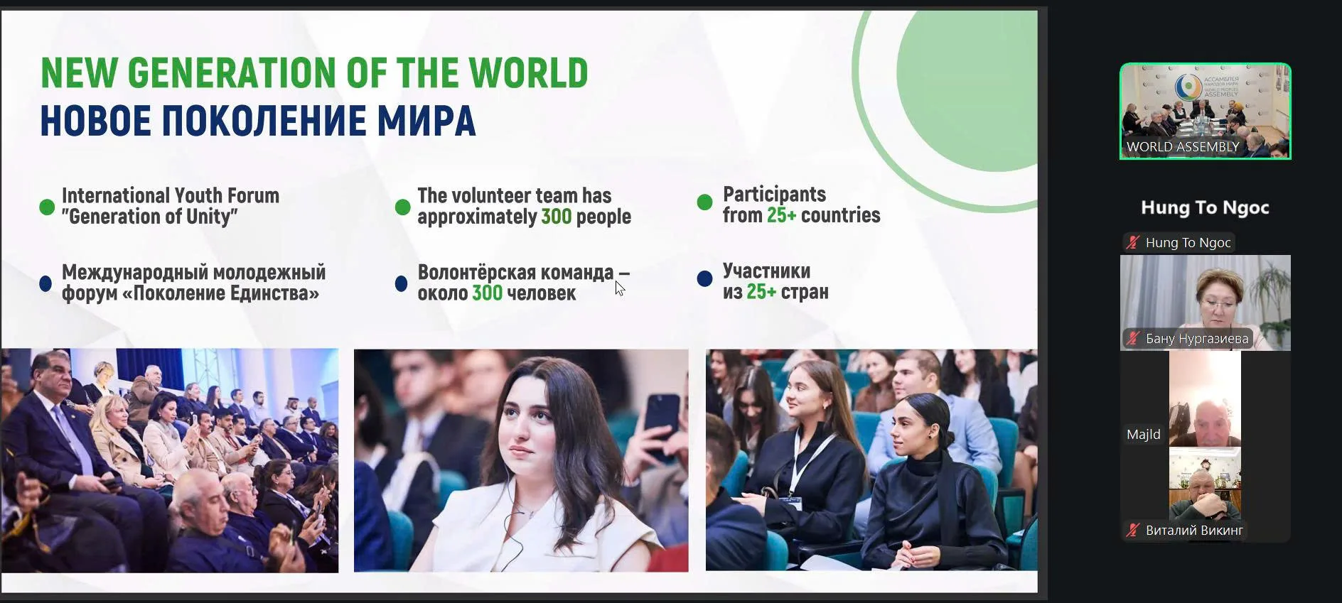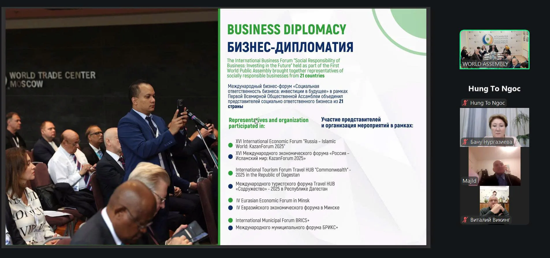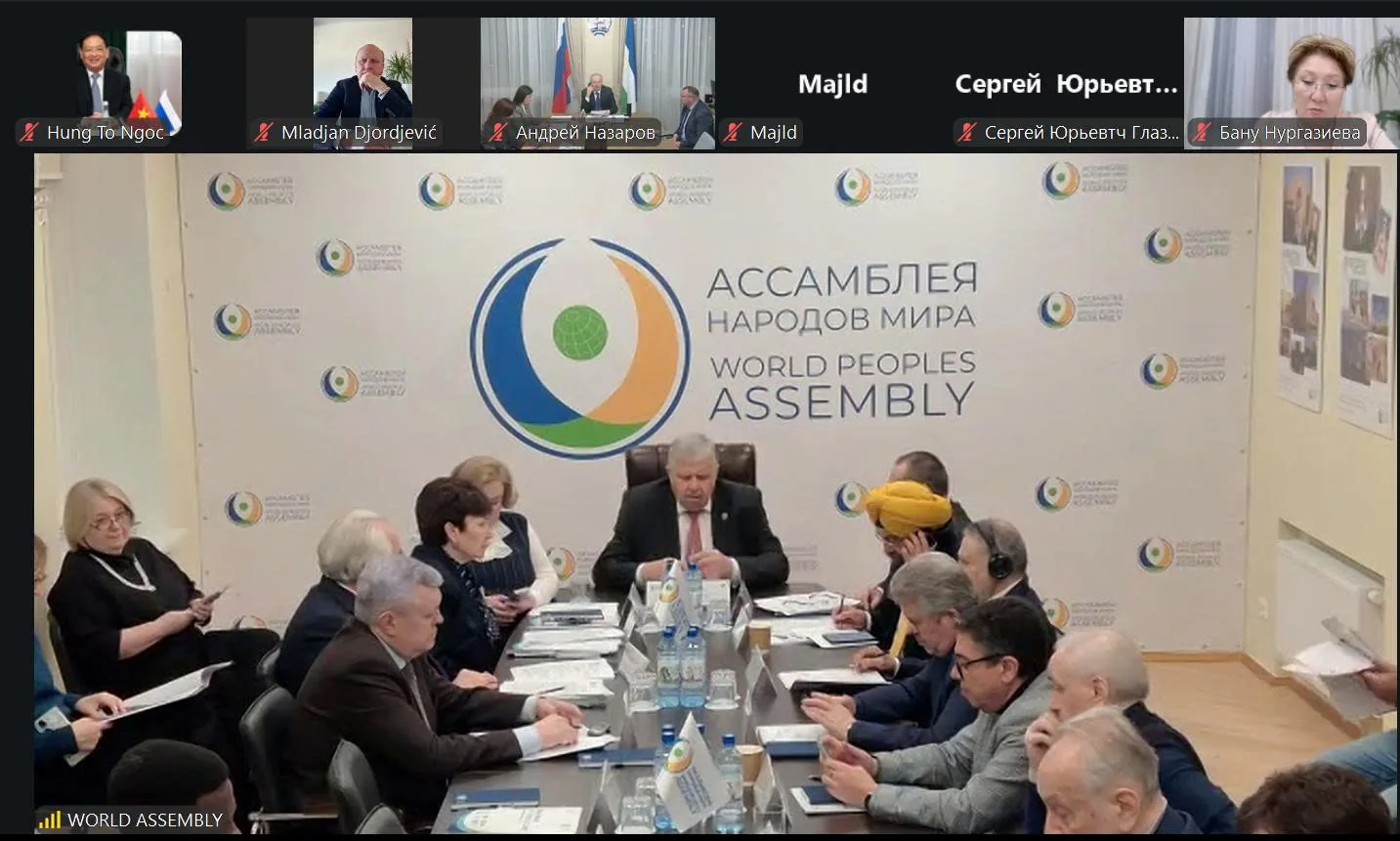 Ngày 15/12/2025, 19:30 phút giờ Hà Nội, nhận lời mời của ông A.Belyaninov Tổng Thư ký Hiệp hội Các dân tộc thế giới (World Peoples Assembly), NGND.PGS.TS. Tô Ngọc Hưng, Hiệu trưởng Trường Đại học Hòa Bình, thành viên Hội đồng Cố vấn Tối cao mở rộng của Hiệp Hội Các Dân tộc thế giới, nguyên Phó Tổng thư ký Hiệp hội Các dân tộc Á – Âu đã tham dự theo hình thức trực tuyến Hội nghị tổng kết hoạt động năm 2025 và phương hướng hoạt động năm 2026 của Hiệp hội. Hội nghị được tổ chức trực tiếp tại Moscow, Liên bang Nga.