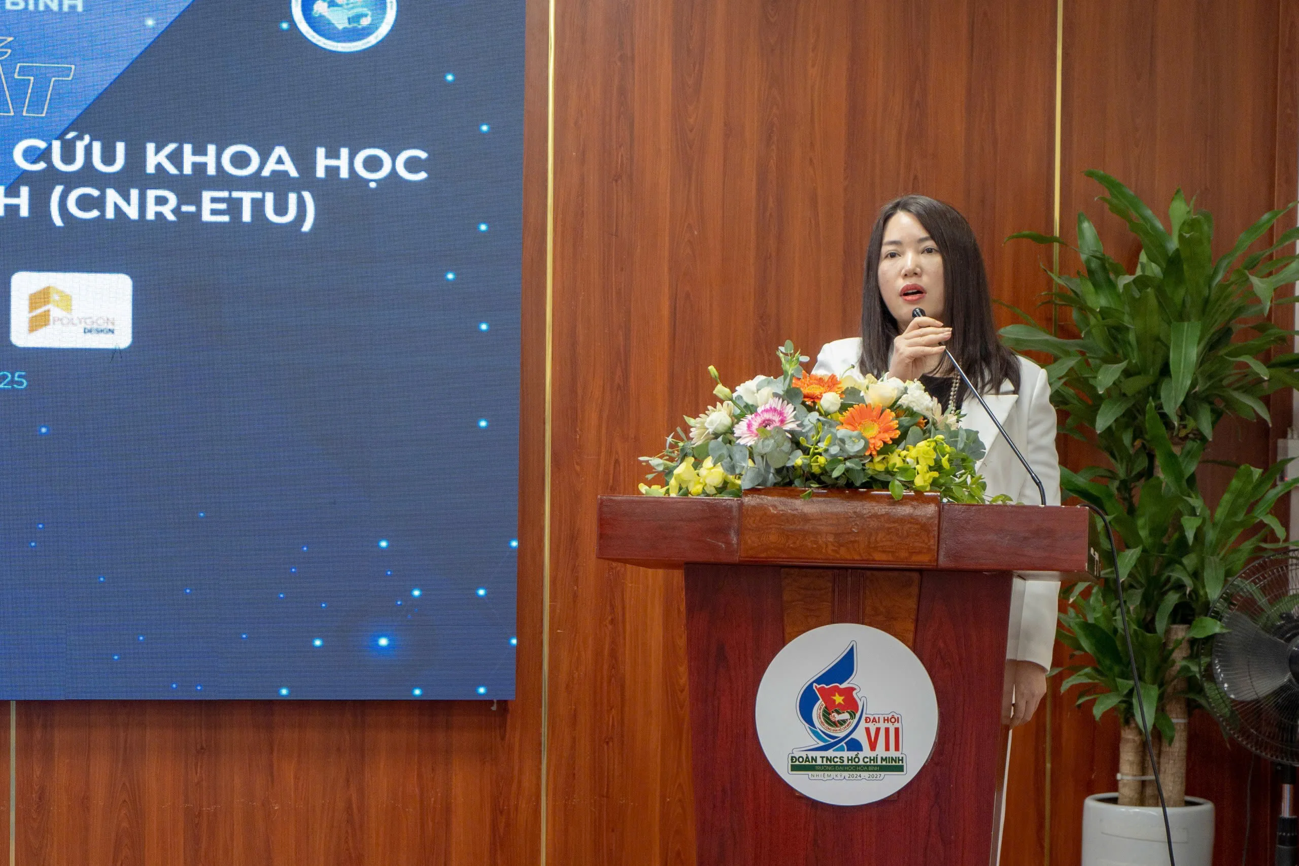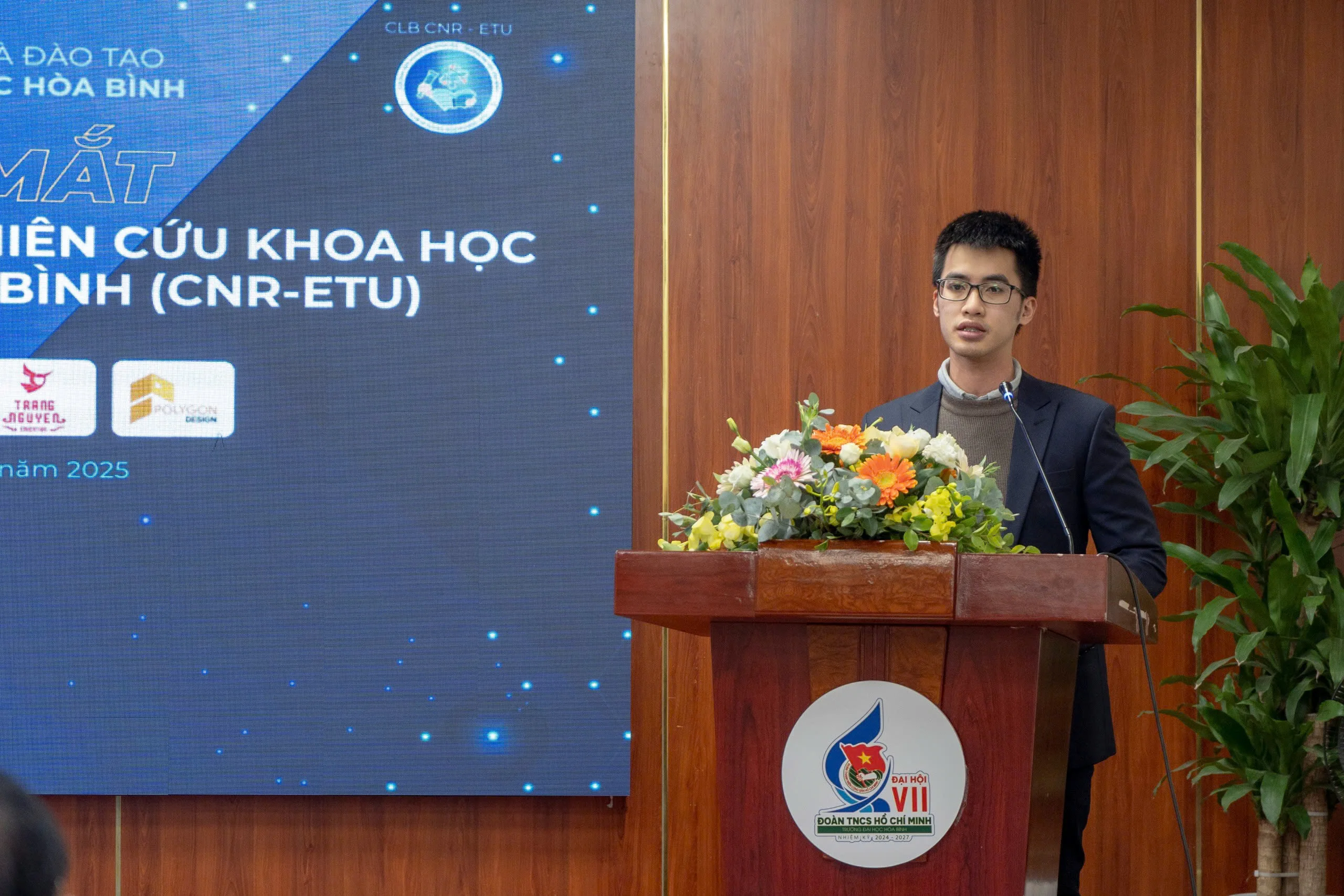 Thay mặt CLB CNR-ETU, Chủ nhiệm CLB đã giới thiệu khái quát về CLB, đặc biệt là chia sẻ các kế hoạch dự kiến triển khai trong năm 2025 của CLB, cam kết sẽ điều hành, dẫn dắt CLB thực hiện tốt hoạt động theo Slogan đã lựa chọn: “Chinh phục tri thức, vững bước tương lai”. CNR-ETU hướng tới việc tạo dựng một môi trường học thuật chuyên nghiệp, nơi sinh viên không chỉ được trang bị kỹ năng nghiên cứu khoa học mà còn có cơ hội áp dụng những kiến thức đã học vào thực tiễn. CLB sẽ tổ chức các buổi hội thảo, tọa đàm, khóa đào tạo về phương pháp nghiên cứu, đồng thời khuyến khích sinh viên tham gia các cuộc thi, đề tài nghiên cứu nhằm phát triển tư duy phản biện và sáng tạo.