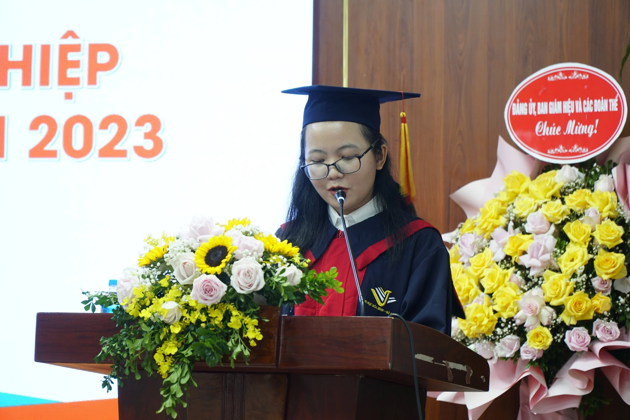 Thay mặt cho 193 sinh viên tốt nghiệp năm 2023, Tân cử nhân Nguyễn Thanh Viên, sinh viên tốt nghiệp xuất sắc ngành Luật kinh tế đã có lời phát biểu tri ân công lao to lớn của tập thể lãnh đạo Nhà trường, thầy cô giáo đã tạo nhiều điều kiện thuận lợi cho các em hoàn thành khóa học và đạt được những những kết quả như mong đợi. Là những Tân Cử nhân, các em sẽ nỗ lực hơn nữa trong việc rèn luyện phẩm chất, nhân cách, chuyên môn và phát triển khả năng sáng tạo,… để xứng đáng trở thành niềm tự hào của Trường Đại học Hoà Bình.