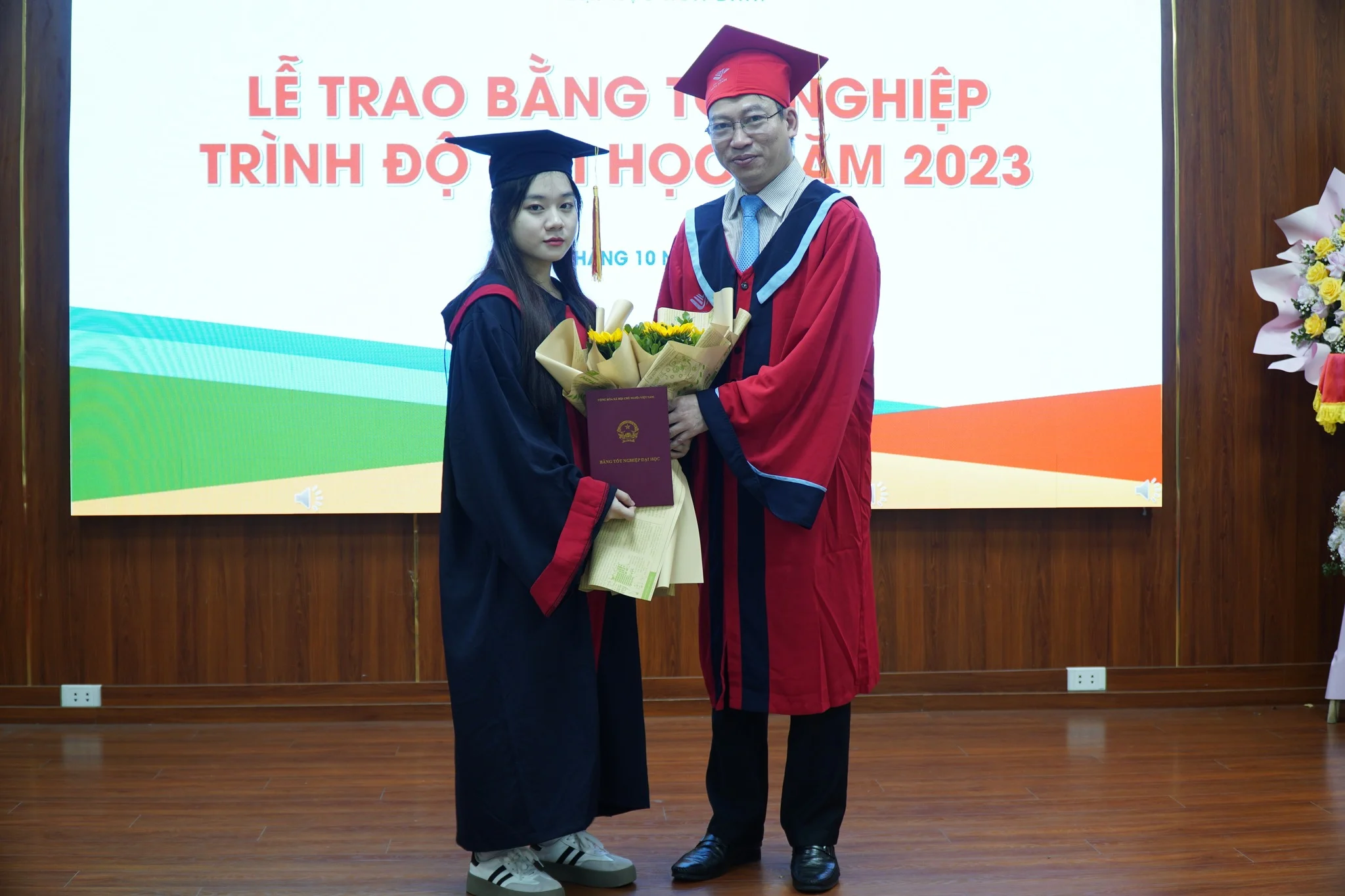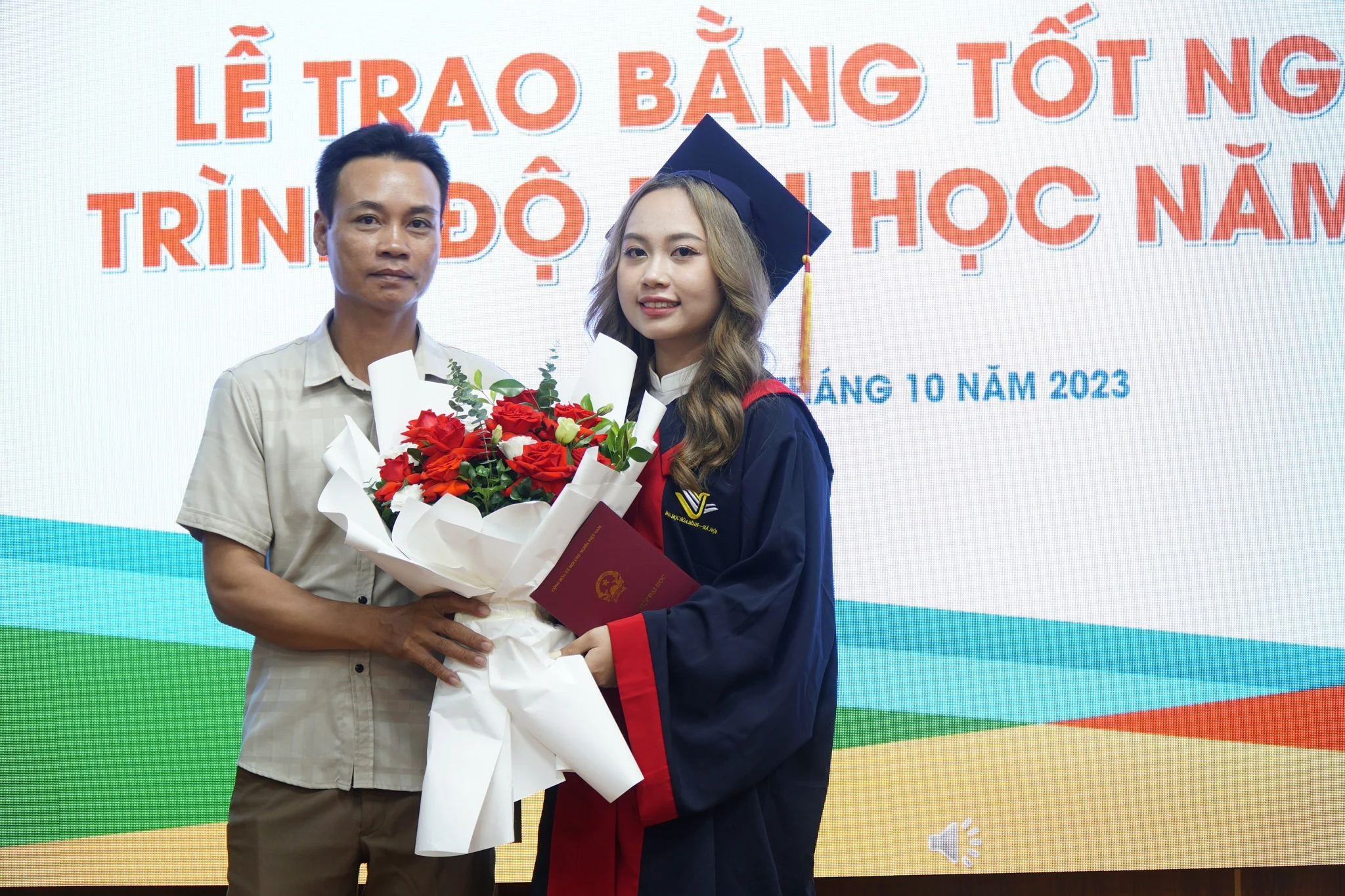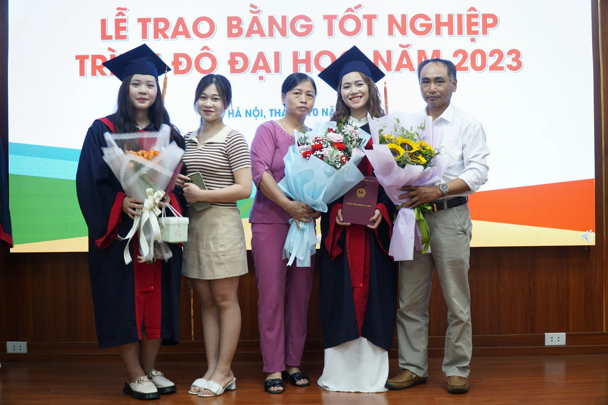 Ngay sau diễn văn chúc mừng của Hiệu trưởng, các Tân cử nhân có thành tích học tập và rèn luyện xuất sắc toàn khóa đã lên sân khấu nhận Bằng tốt nghiệp từ NGND.PGS.TS Tô Ngọc Hưng – Hiệu trưởng Nhà trường và GS.TS Đào Văn Đông – Phó Hiệu trưởng thường trực Nhà trường.