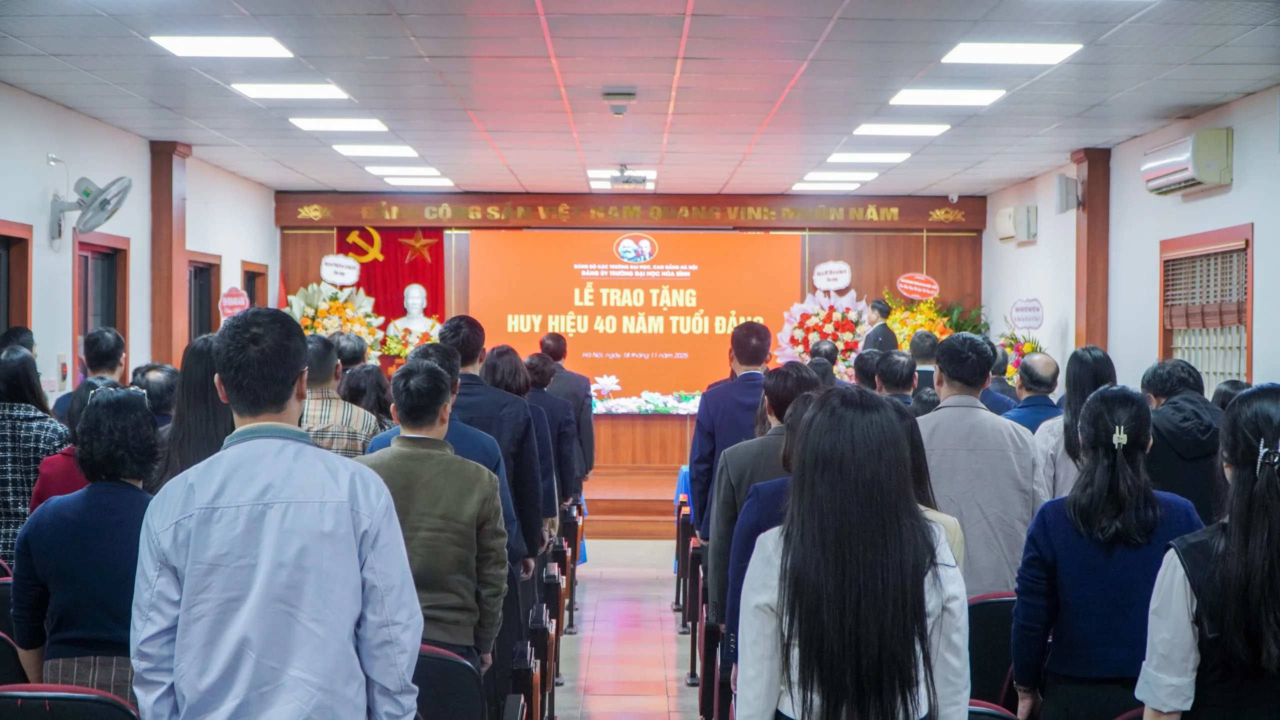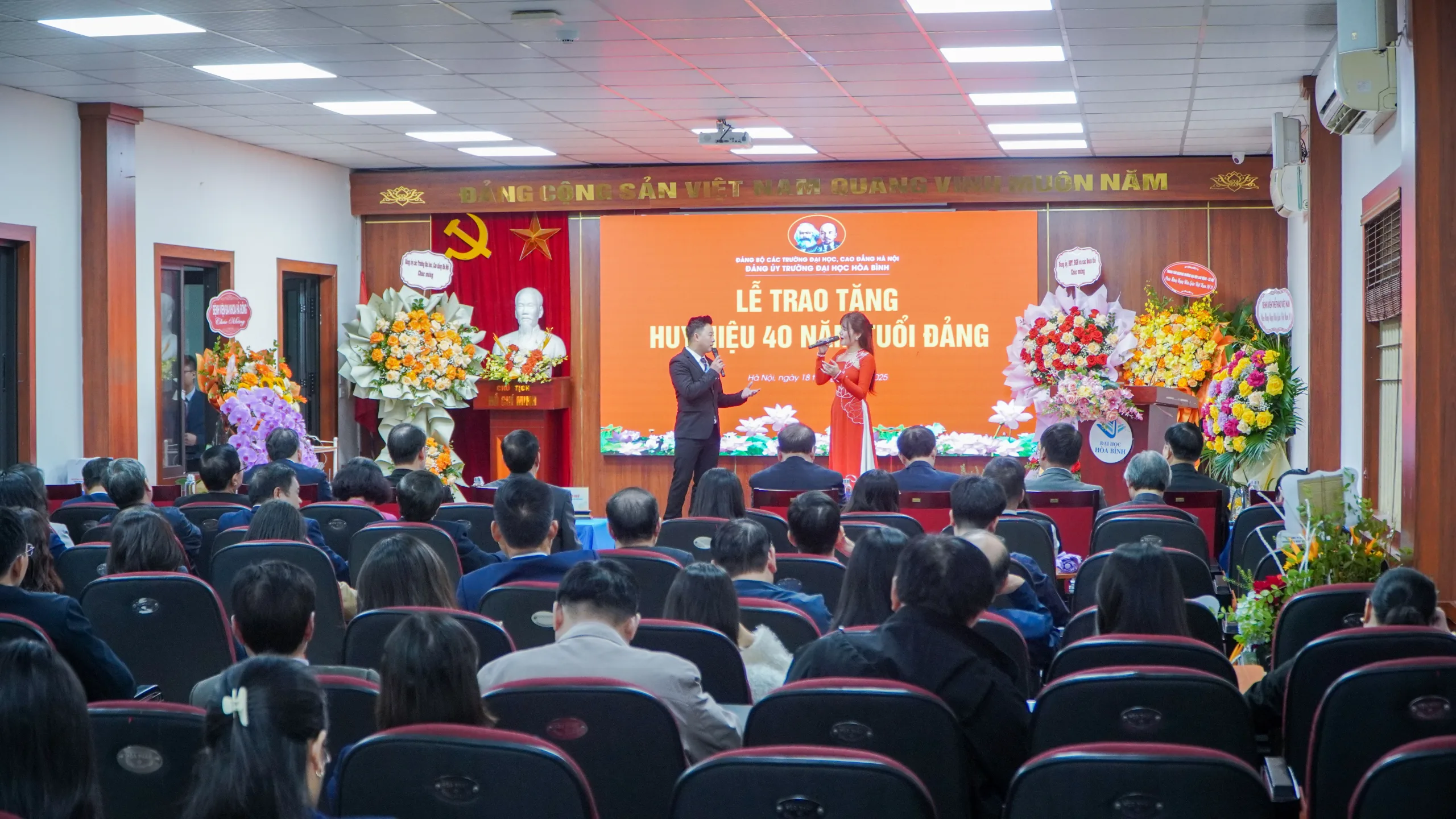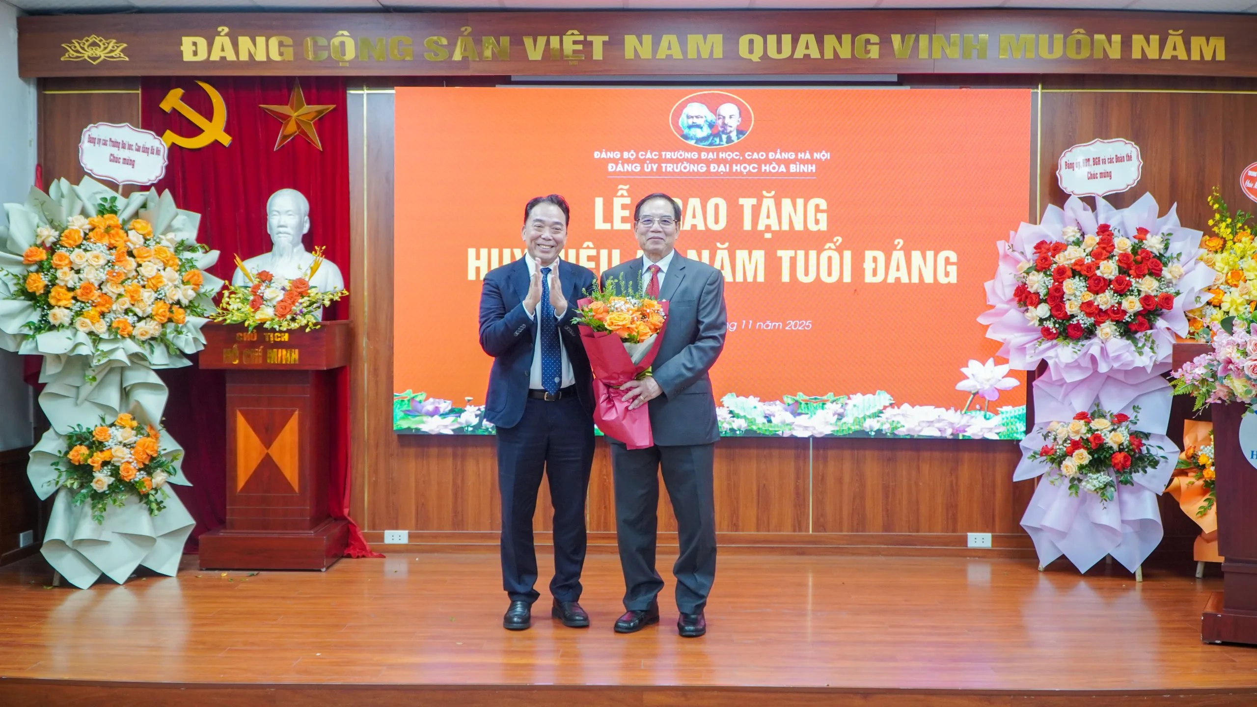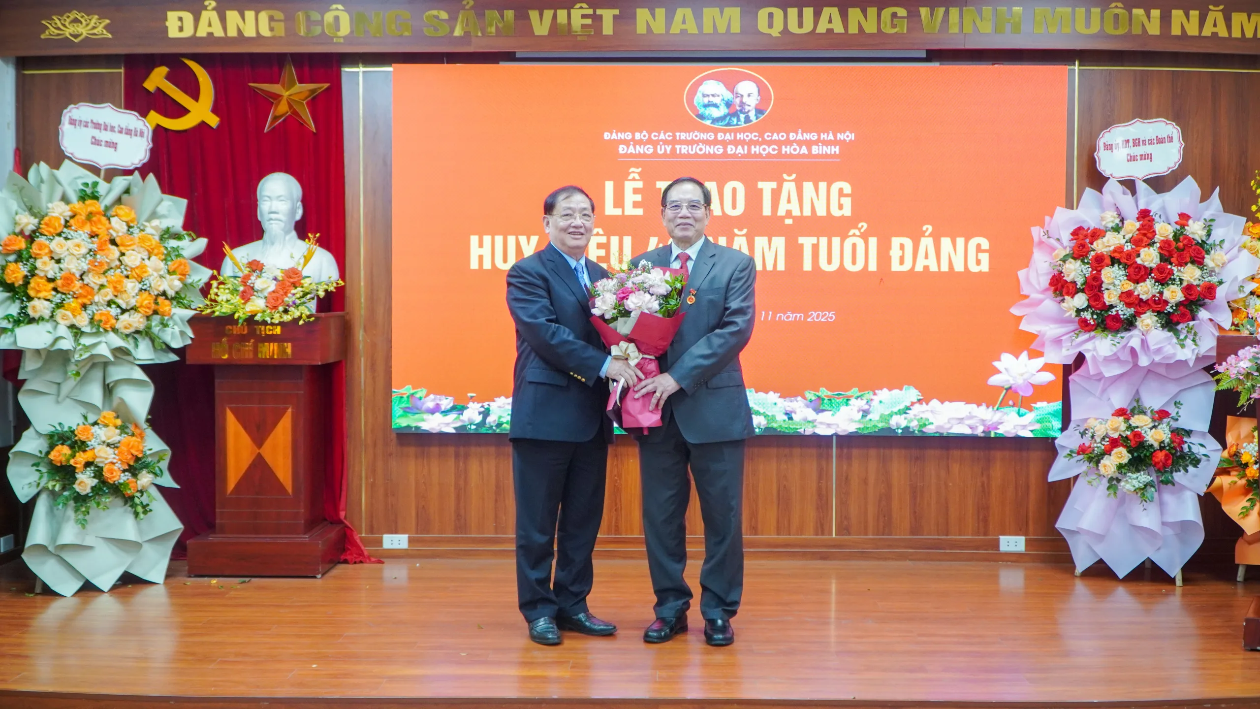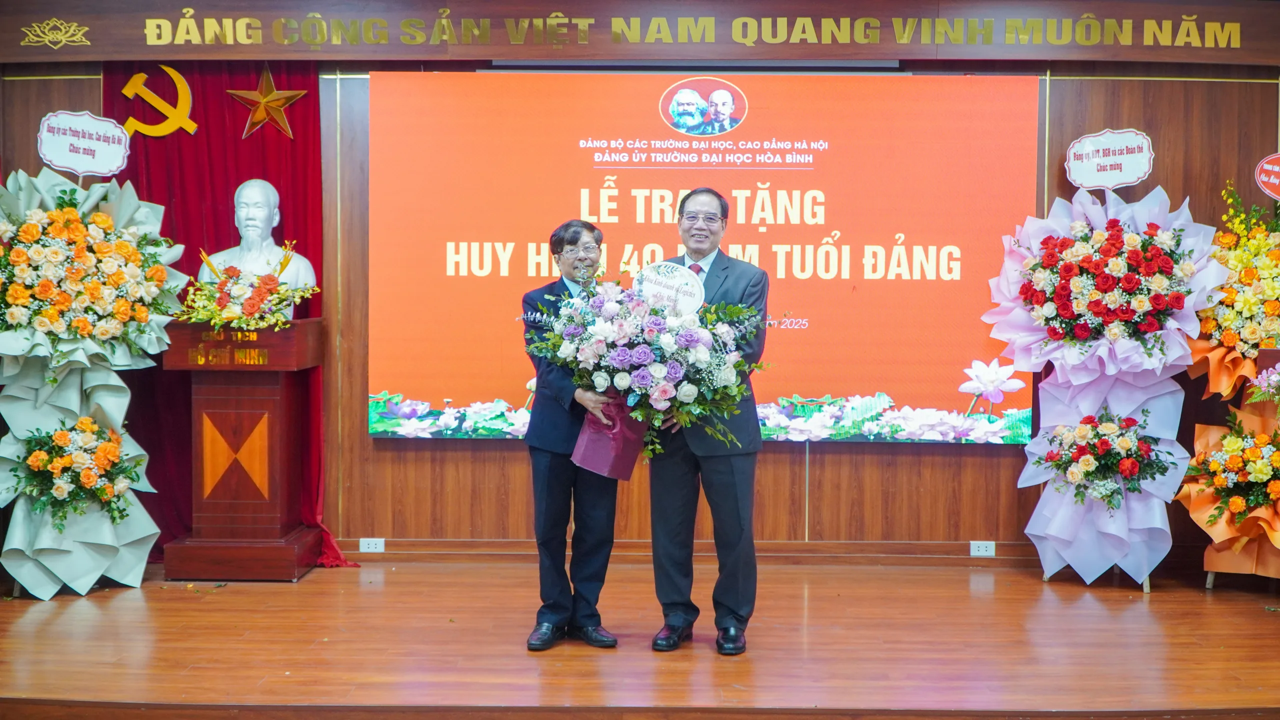 Sáng ngày 18/11/2025, dưới sự ủy quyền của Đảng ủy khối các trường Đại học, Cao đẳng Hà Nội, Đảng ủy Trường Đại học Hòa Bình đã long trọng tổ chức Lễ trao tặng Huy hiệu 40 năm tuổi Đảng cho đồng chí Nguyễn Văn Ngữ – Bí thư Đảng ủy, Phó Chủ tịch Hội đồng Trường.