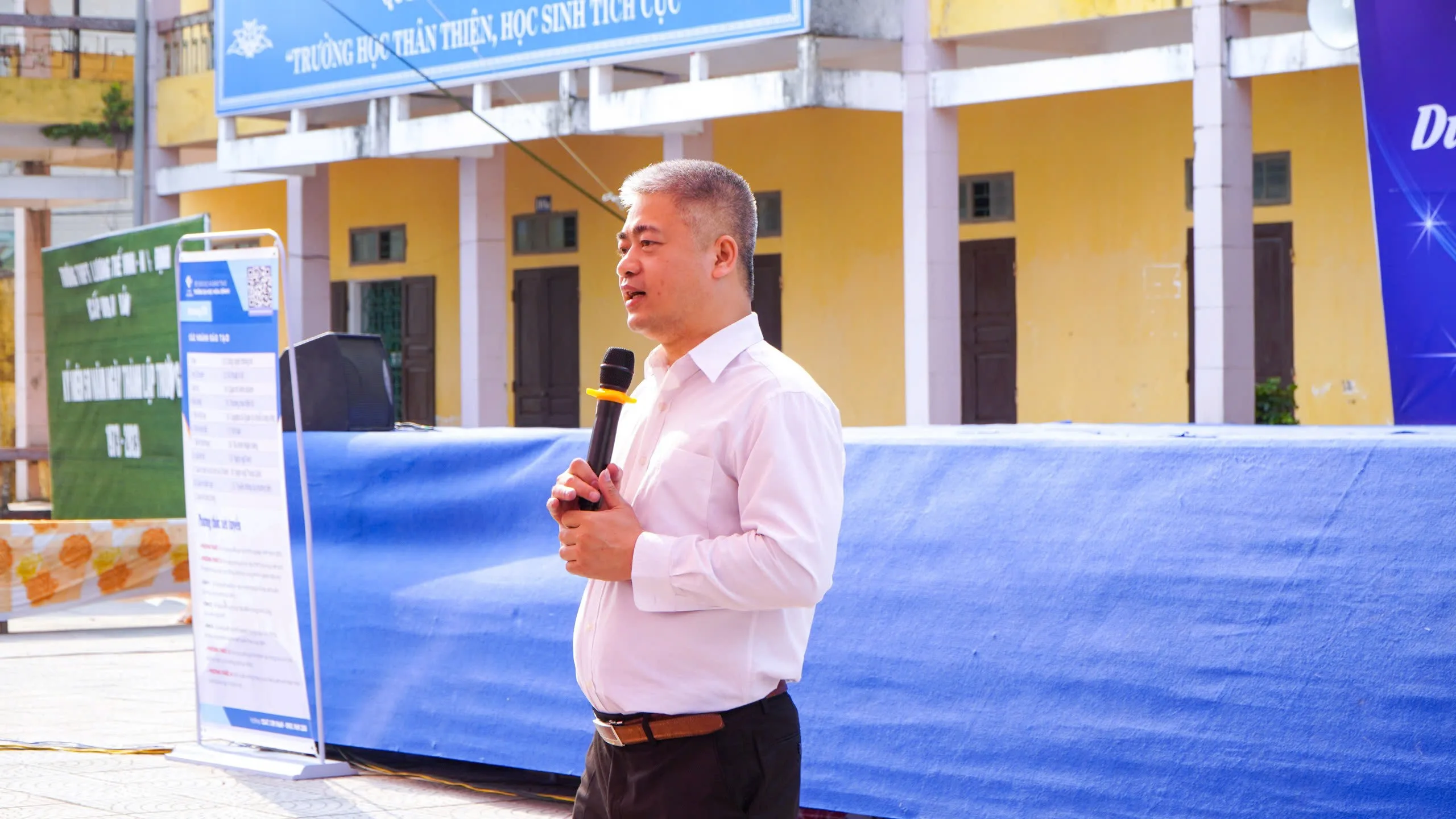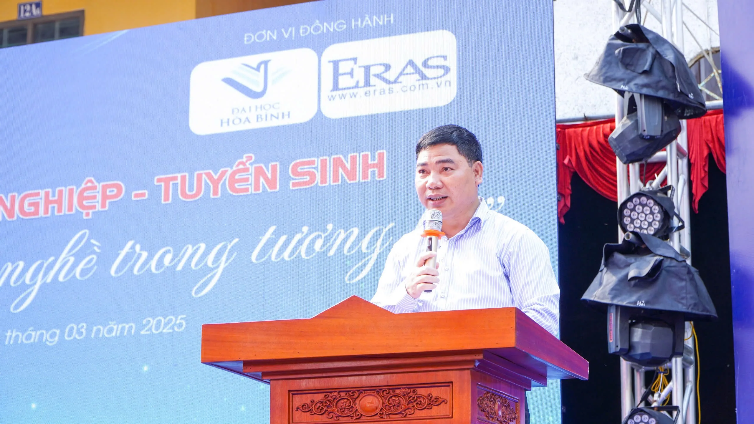 Tại ngày hội, Thầy Bùi Văn Thương – Hiệu trưởng Nhà trường đã có bài phát biểu chào mừng và bày tỏ niềm vui khi được đồng hành cùng Trường Đại học Hòa Bình trong việc định hướng nghề nghiệp cho học sinh.