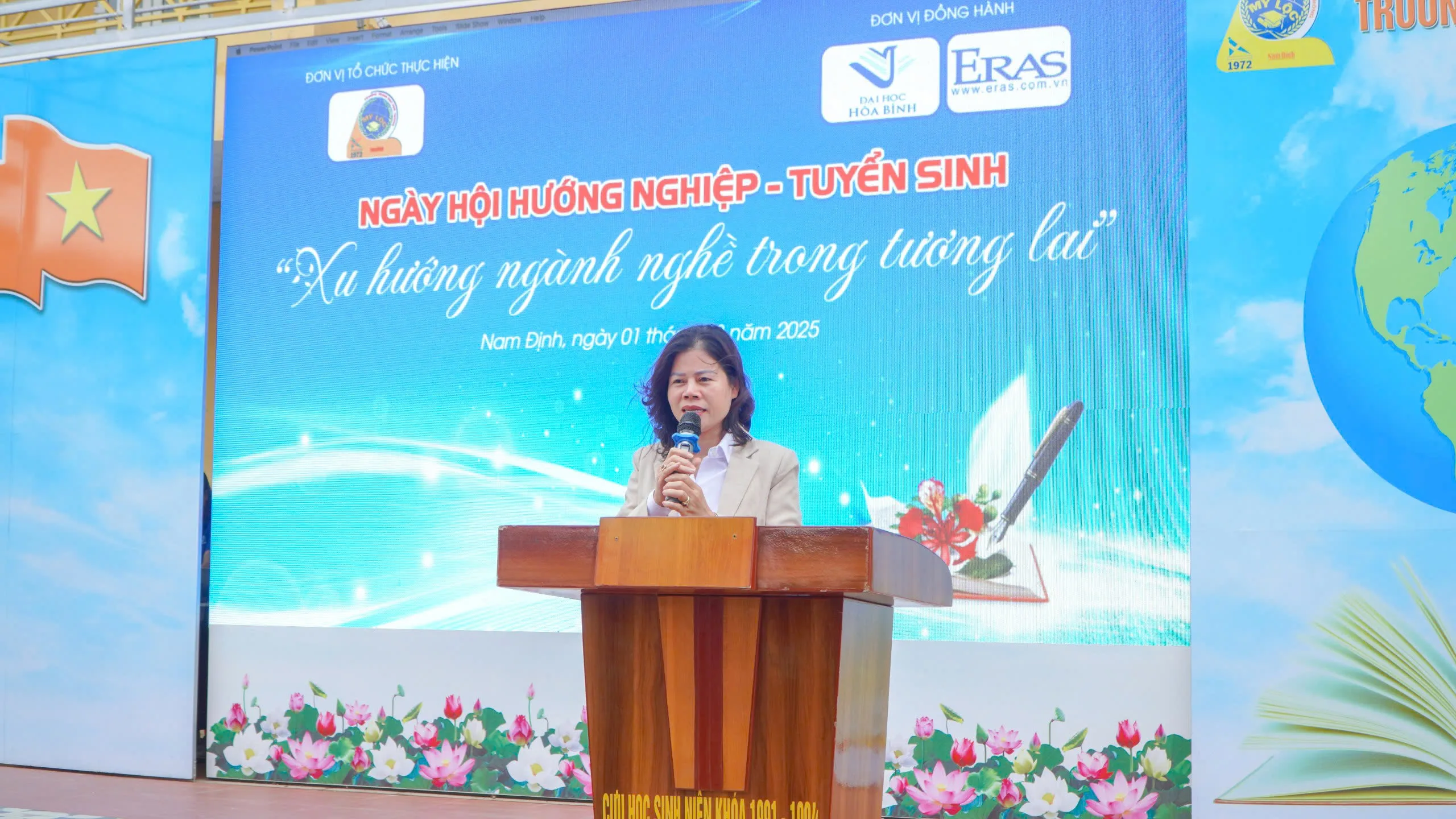 Tại ngày hội, cô Trần Thị Mai – Hiệu trưởng THPT Mỹ Lộc đã có bài phát biểu chào mừng và bày tỏ niềm vui khi được đồng hành cùng Trường Đại học Hòa Bình trong việc định hướng nghề nghiệp cho học sinh.