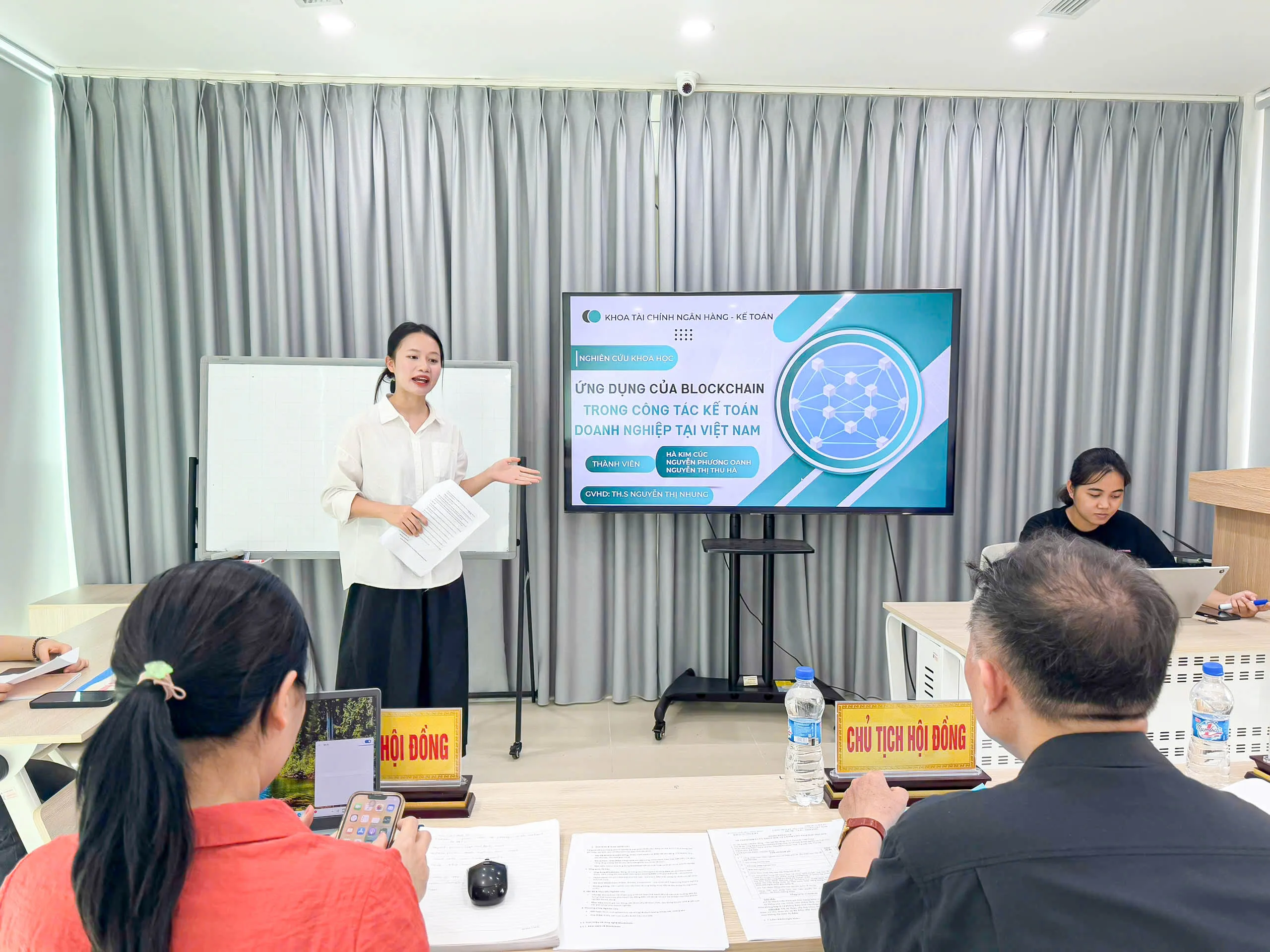 Hội đồng đã tiến hành thành công khi các thầy cô đưa ra những đánh giá rất cao đối với đề tài: “Ứng dụng của Blockchain trong công tác kế toán doanh nghiệp tại Việt Nam” của nhóm các bạn sinh viên. Đây là một ứng dụng khá mới nhưng được nhiều doanh nghiệp lớn tại Việt Nam sử dụng vì sự tiện lợi và giảm được lượng lớn công việc lưu trữ các bút toán, chứng từ kế toán.