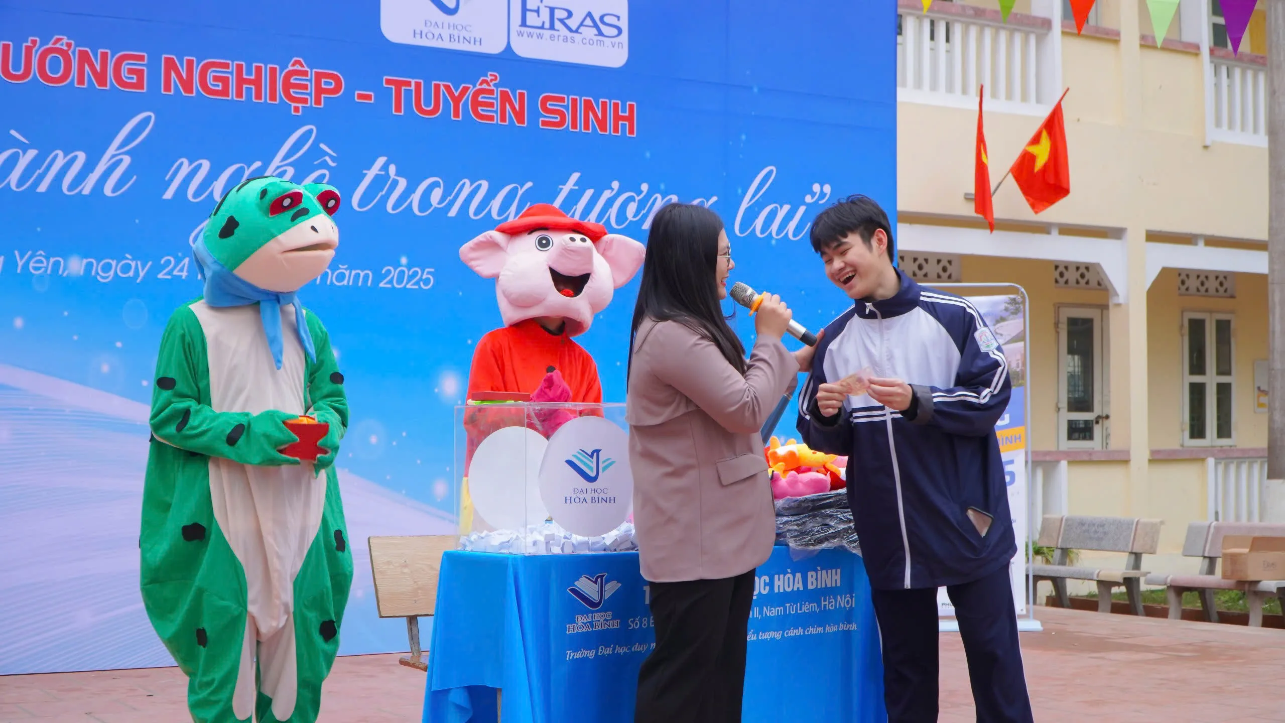 Cũng trong khuôn khổ diễn ra sự kiện, ThS. Nguyễn Thị Thu Hiền – Trưởng phòng Tuyển sinh và truyền thông, Viện trưởng Viện Khởi nghiệp & Đổi mới sáng tạo Mở đã chia sẻ những ưu điểm, lợi thế khi các bạn học sinh lựa chọn Trường Đại học Hòa Bình, theo đó ThS. Nguyễn Thị Thu Hiền cho biết “Trường Đại học Hòa Bình có vị trí đắc địa ngay gần trung tâm Mỹ Đình, các hoạt động văn hóa, giải trí diễn ra sôi nổi, giao thông thuận lợi, gần các bến xe, sân vận động… Ngoài ra, Trường Đại học Hòa Bình còn là trường Đại học đa ngành, đa lĩnh vực do đó các bạn sinh viên có cơ hội học tập, trải nghiệm với rất nhiều ngành nghề khác nhau, môi trường học tập trẻ trung, năng động, nhiều hoạt động trải nghiệm thú vị. Đội ngũ giảng viên cũng rất giàu kinh nghiệm, luôn sẵn sàng lắng nghe và hỗ trợ cho các bạn học sinh trong suốt quá trình học tập”.