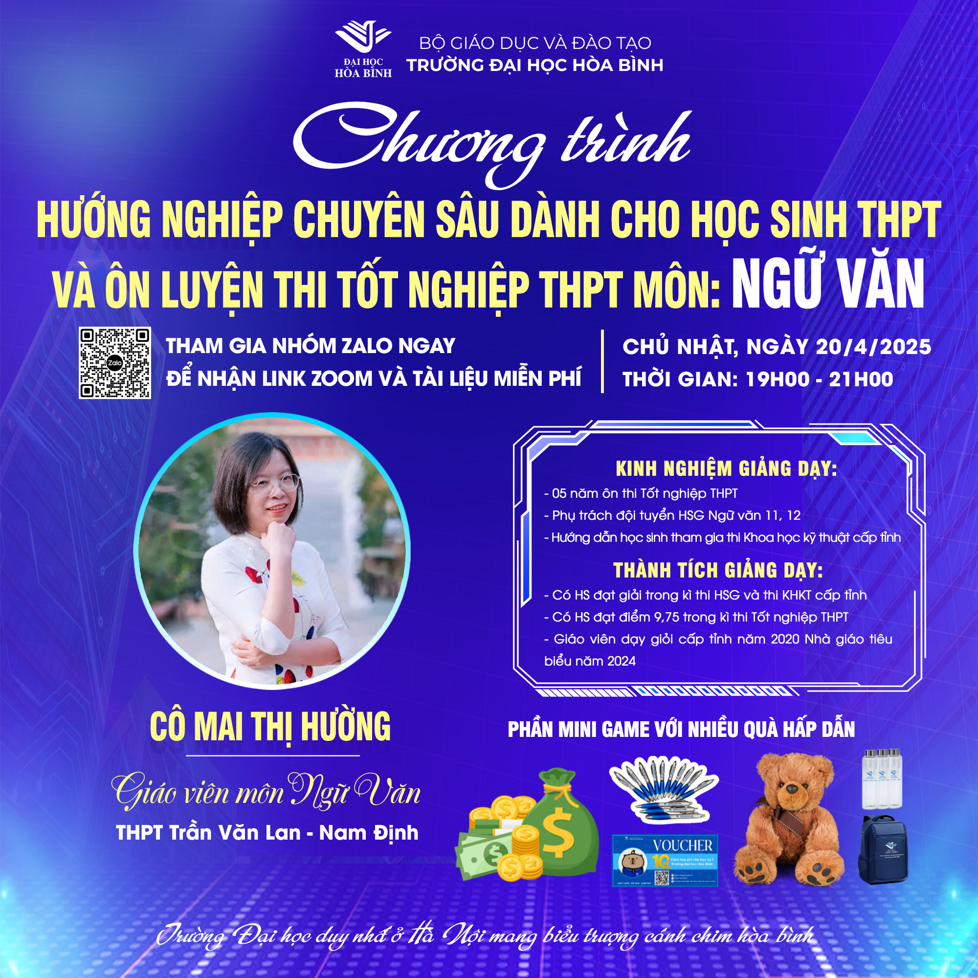 Bạn đang tìm kiếm một chiến lược ôn tập hiệu quả để đạt điểm cao môn Ngữ Văn trong kỳ thi tốt nghiệp THPT 2025? Bạn lo lắng về phương thức tuyển sinh đại học năm nay? Đừng bỏ lỡ cơ hội tham gia buổi Hướng nghiệp chuyên sâu & Ôn luyện thi tốt nghiệp THPT môn Ngữ Văn do Trường Đại học Hòa Bình tổ chức vào ngày 20/4/2025 với hình thức trực tuyến qua Zoom.