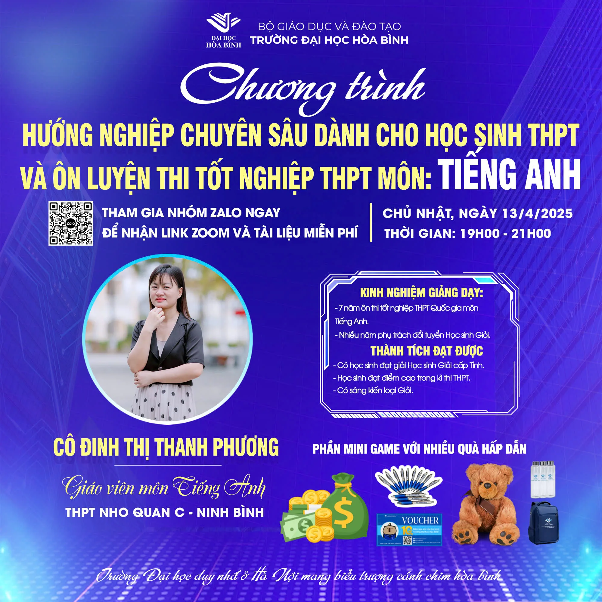 Bạn đang tìm kiếm một chiến lược ôn tập hiệu quả để đạt điểm cao trong kỳ thi tốt nghiệp THPT 2025? Bạn lo lắng về phương thức tuyển sinh đại học năm nay? Đừng bỏ lỡ cơ hội tham gia buổi Hướng nghiệp chuyên sâu & Ôn luyện thi tốt nghiệp THPT môn Tiếng Anh do Trường Đại học Hòa Bình tổ chức vào ngày 13/4/2025 với hình thức trực tuyến qua Zoom.