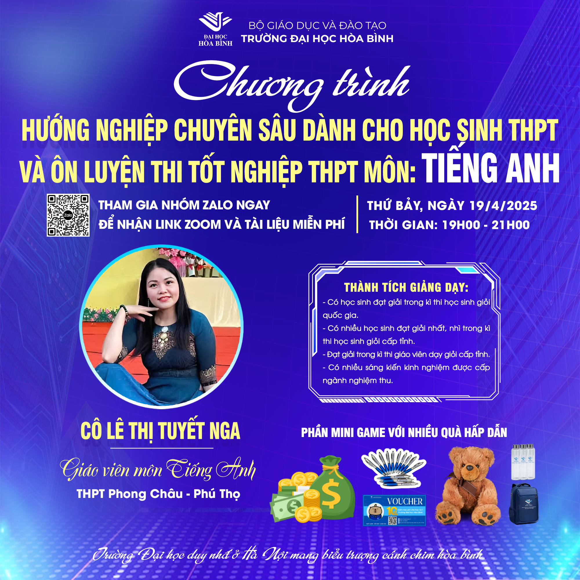 Bạn đang tìm kiếm một chiến lược ôn tập hiệu quả để đạt điểm cao môn Tiếng Anh trong kỳ thi tốt nghiệp THPT 2025? Bạn lo lắng về phương thức tuyển sinh đại học năm nay? Đừng bỏ lỡ cơ hội tham gia buổi Hướng nghiệp chuyên sâu & Ôn luyện thi tốt nghiệp THPT môn Tiếng Anh do Trường Đại học Hòa Bình tổ chức vào ngày 19/4/2025 với hình thức trực tuyến qua Zoom.