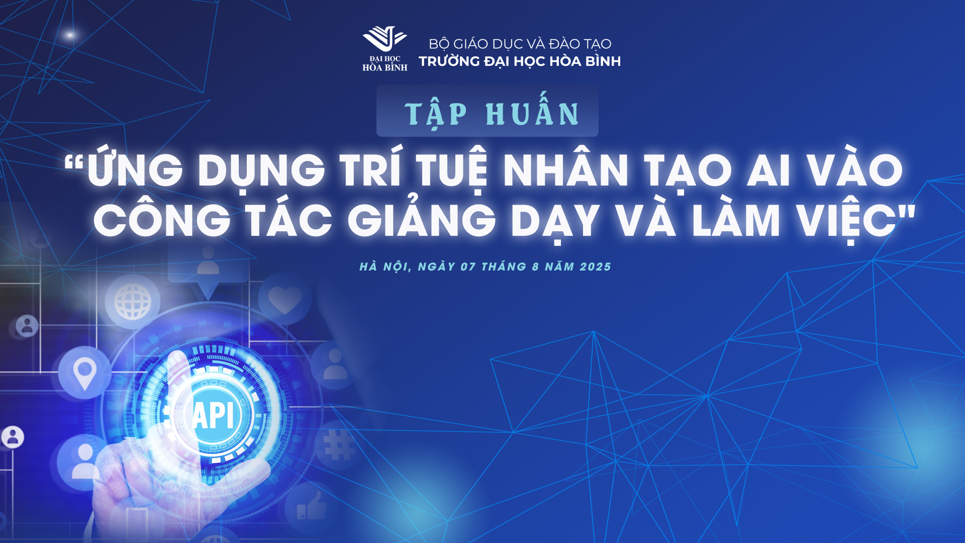 Thực hiện chỉ đạo của Chủ tịch Hội đồng Trường và Hiệu trưởng Trường Đại học Hòa Bình, Phòng Hành chính – Quản trị trân trọng thông báo tới toàn thể cán bộ, giảng viên, nhân viên (CBGVNV) chương trình tập huấn với chủ đề: “Ứng dụng trí tuệ nhân tạo (AI) vào công tác giảng dạy và làm việc”.