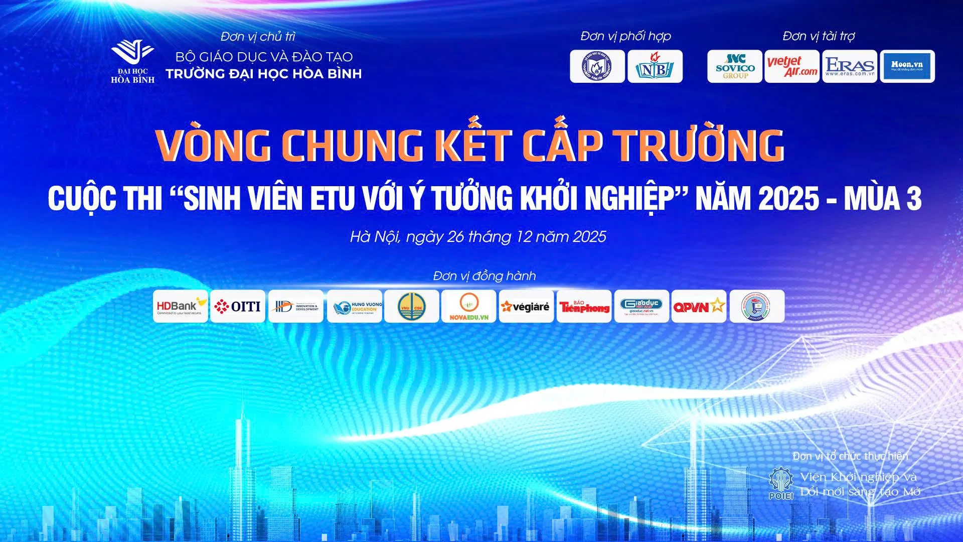 Sau thành công vang dội của 02 mùa đầu tiên với 02 Giải Khuyến khích Quốc gia và 01 Giải Ba Quốc gia Cuộc thi “Học sinh, sinh viên với ý tưởng Khởi nghiệp” (SV_STARTUP) do Bộ Giáo dục và Đào tạo tổ chức; Trường Đại học Hòa Bình tổ chức Cuộc thi “Sinh viên ETU với ý tưởng khởi nghiệp” năm 2025 – mùa 3; nhằm thúc đẩy tinh thần khởi nghiệp cho sinh viên, giảng viên; trang bị kiến thức, kỹ năng phát triển tư duy sáng tạo; tạo sân chơi học thuật đa dạng gắn với môi trường thực tế; đồng thời, giúp sinh viên, giảng viên hiểu được ý nghĩa, vai trò và tầm quan trọng của khởi nghiệp thông qua chia sẻ những bài học kinh nghiệm và bí quyết khởi nghiệp thành công từ các doanh nhân. Cuộc thi sẽ tuyển chọn dự án xuất sắc để tham gia các Cuộc thi Khởi nghiệp trong nước và quốc tế. Vòng chung kết Cuộc thi sẽ được tổ chức vào ngày 26/12/2025 tới đây.