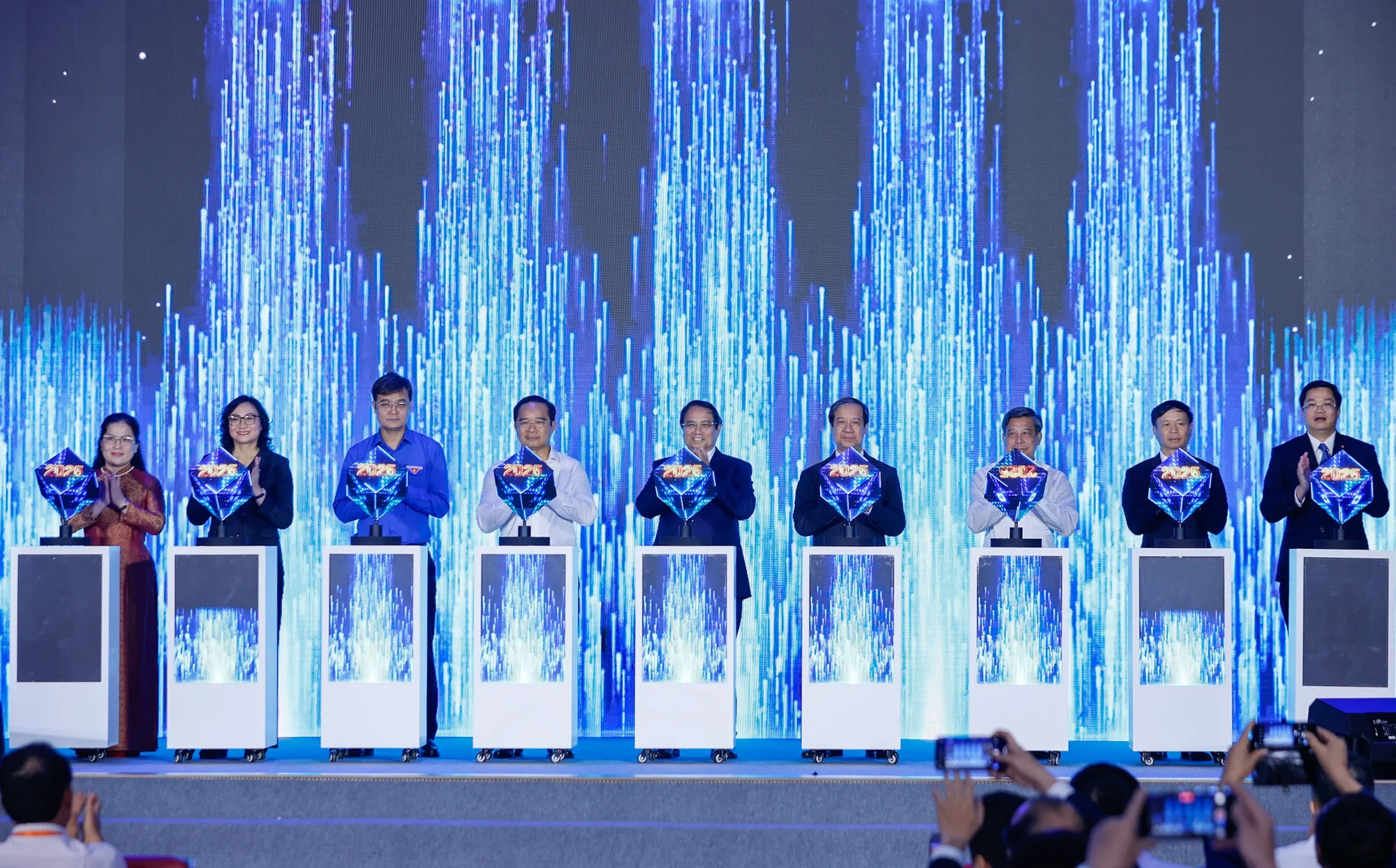Thủ tướng Chính phủ Phạm Minh Chính cùng các đại biểu ấn nút thực hiện nghi thức khai mạc Ngày hội Khởi nghiệp quốc gia của học sinh, sinh viên lần thứ VII