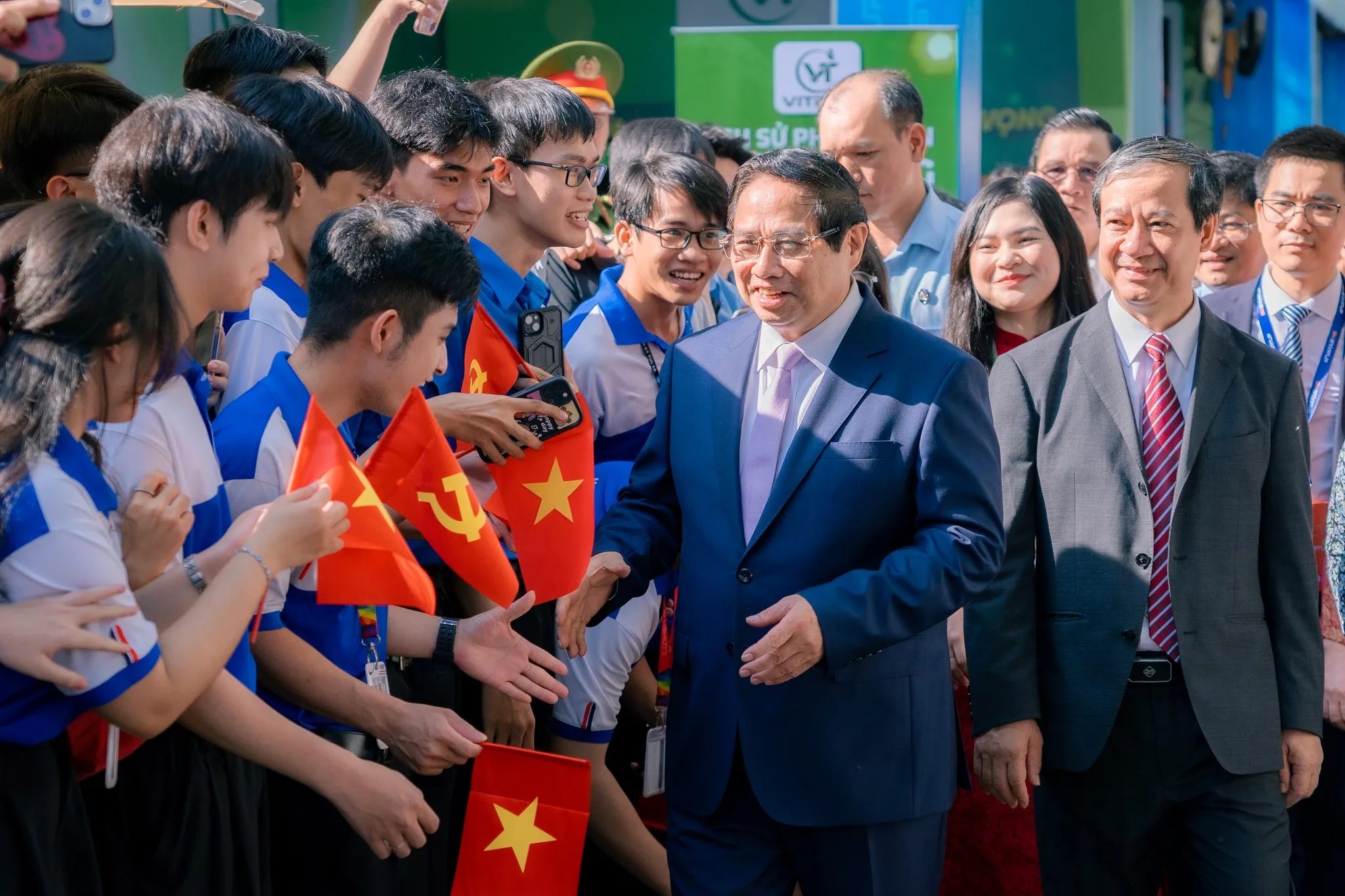 Thủ tướng Chính phủ Phạm Minh Chính và Bộ trưởng Bộ Giáo dục và Đào tạo Nguyễn Kim Sơn tham quan và trò chuyện với học sinh, sinh viên tại các gian hàng