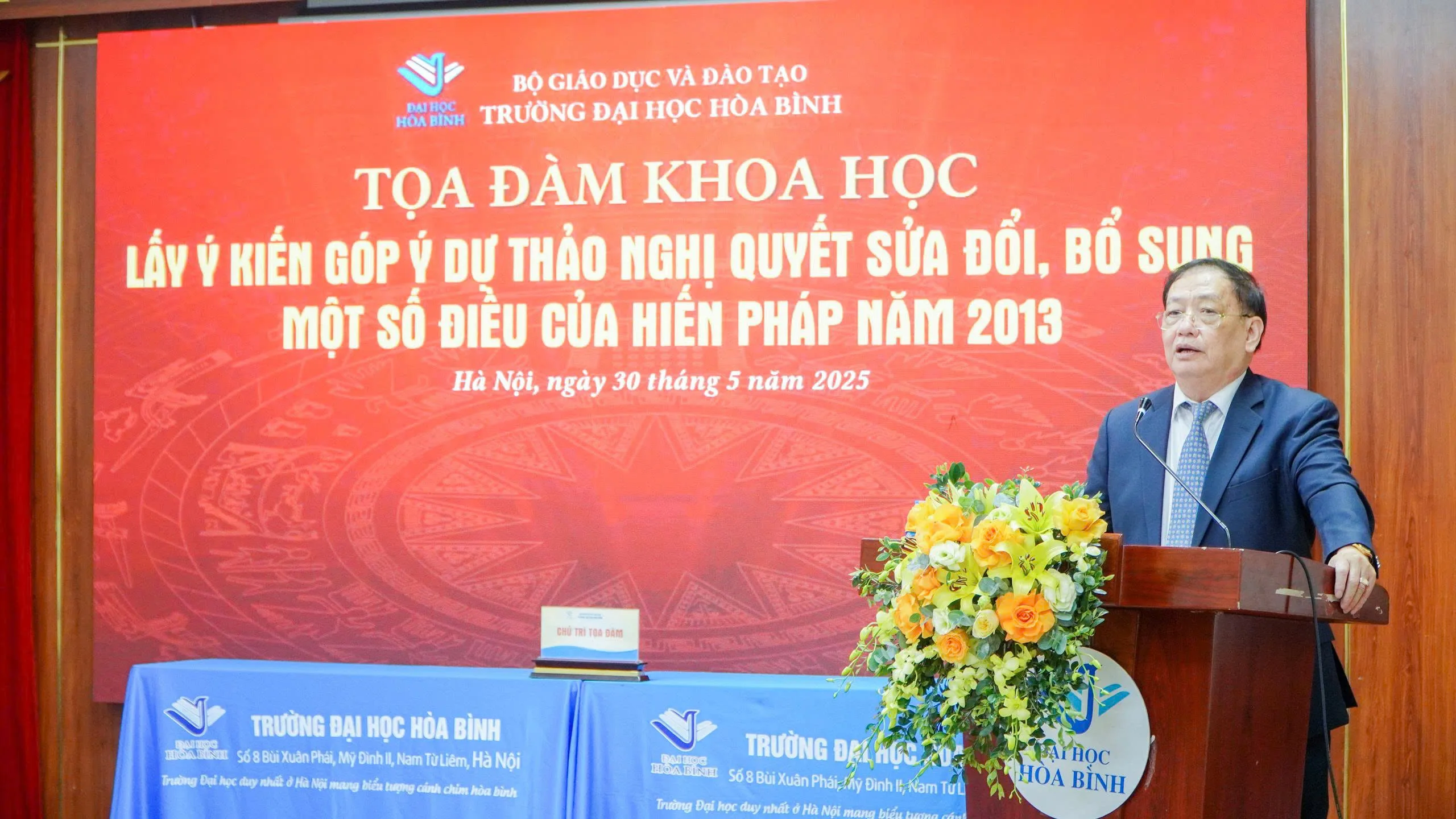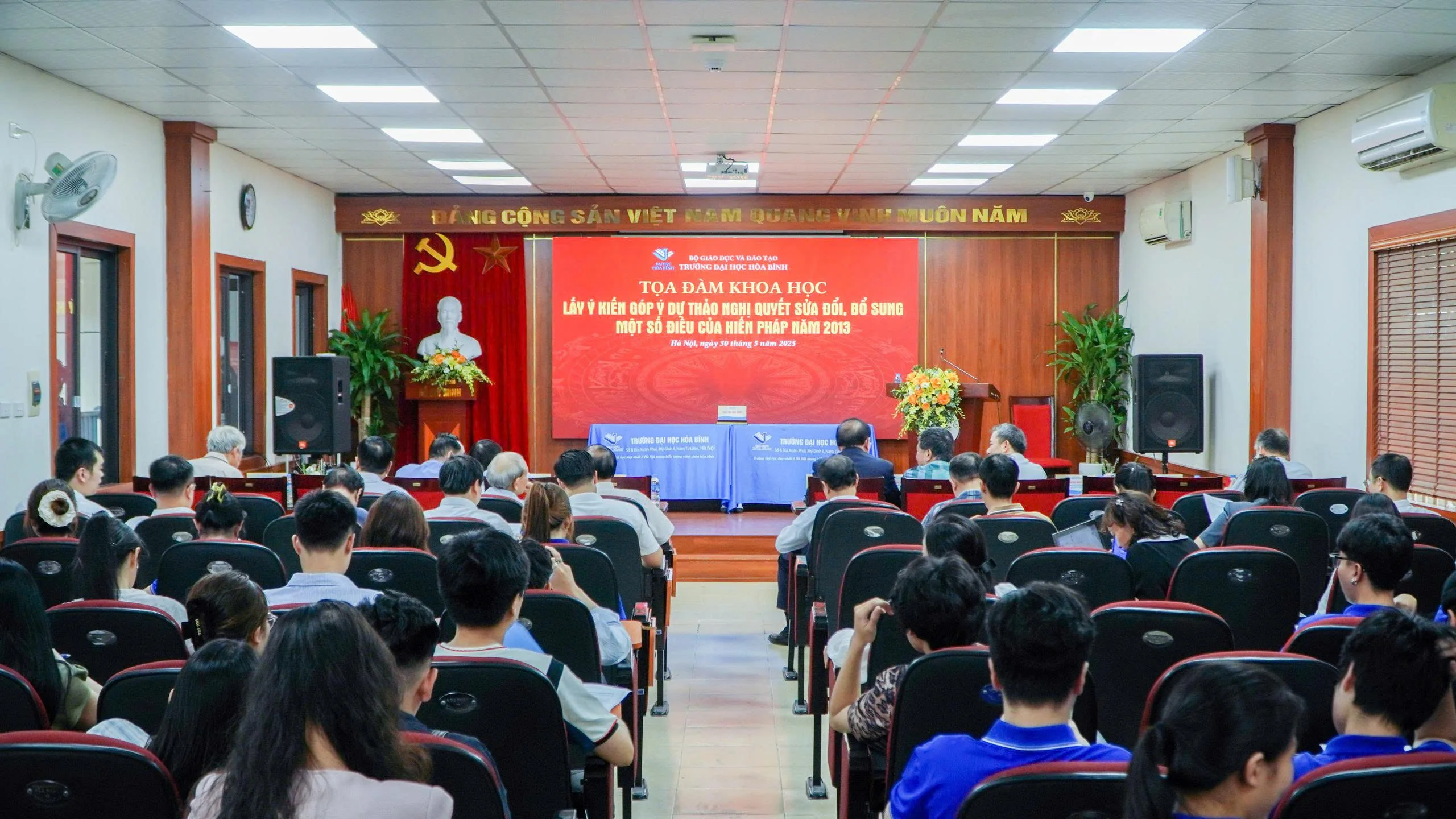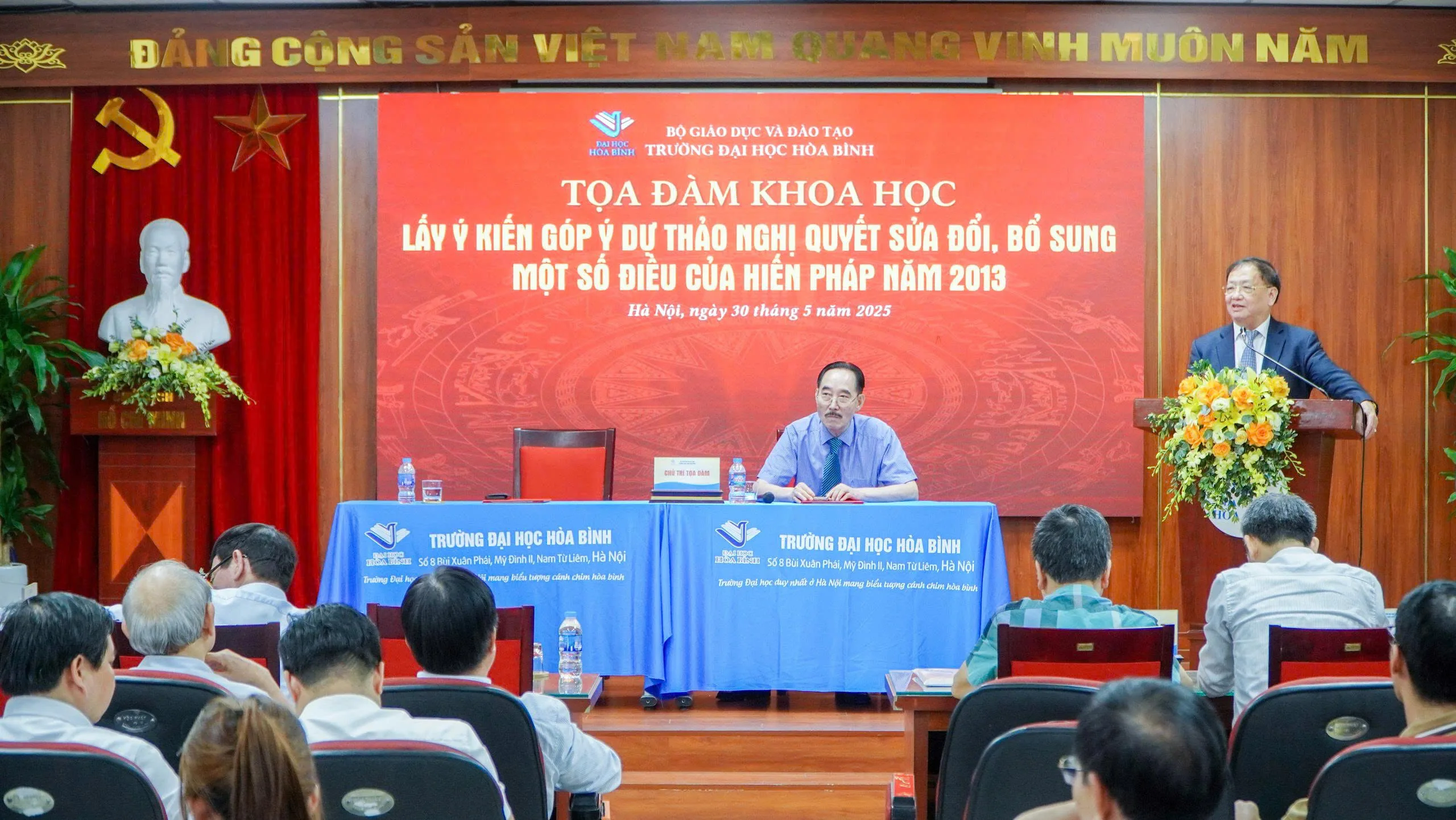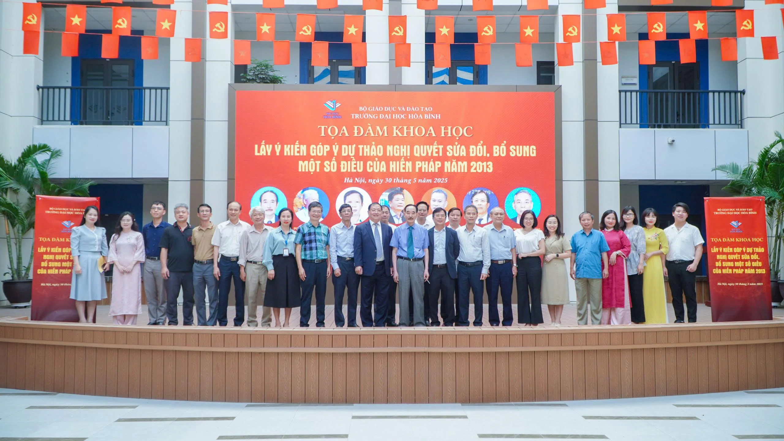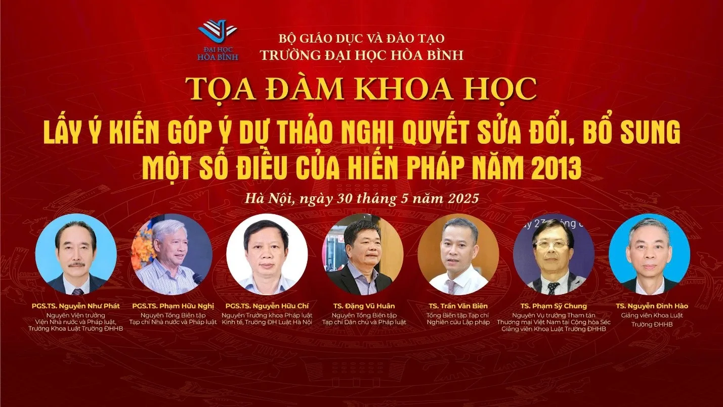 Nhằm tạo diễn đàn học thuật để giảng viên, chuyên gia, học viên và sinh viên cùng trao đổi, góp ý những vấn đề trọng tâm, cấp thiết được đặt ra trong Dự thảo Nghị quyết của Quốc hội sửa đổi, bổ sung một số điều của Hiến pháp năm 2013; phát huy vai trò nghiên cứu, tư vấn chính sách của Nhà trường trong quá trình xây dựng và hoàn thiện pháp luật, đồng thời, góp phần hình thành ý thức chính trị – pháp lý công dân cho thế hệ trẻ, đặc biệt là học viên và sinh viên ngành Luật… Trường Đại học Hòa Bình (ĐHHB) đã tổ chức Tọa đàm “Lấy ý kiến góp ý dự thảo Nghị quyết sửa đổi, bổ sung một số Điều của Hiến pháp năm 2013” vào chiều ngày 30/5/2025.