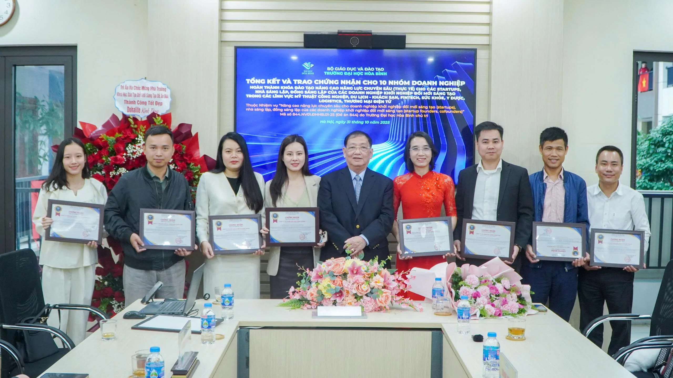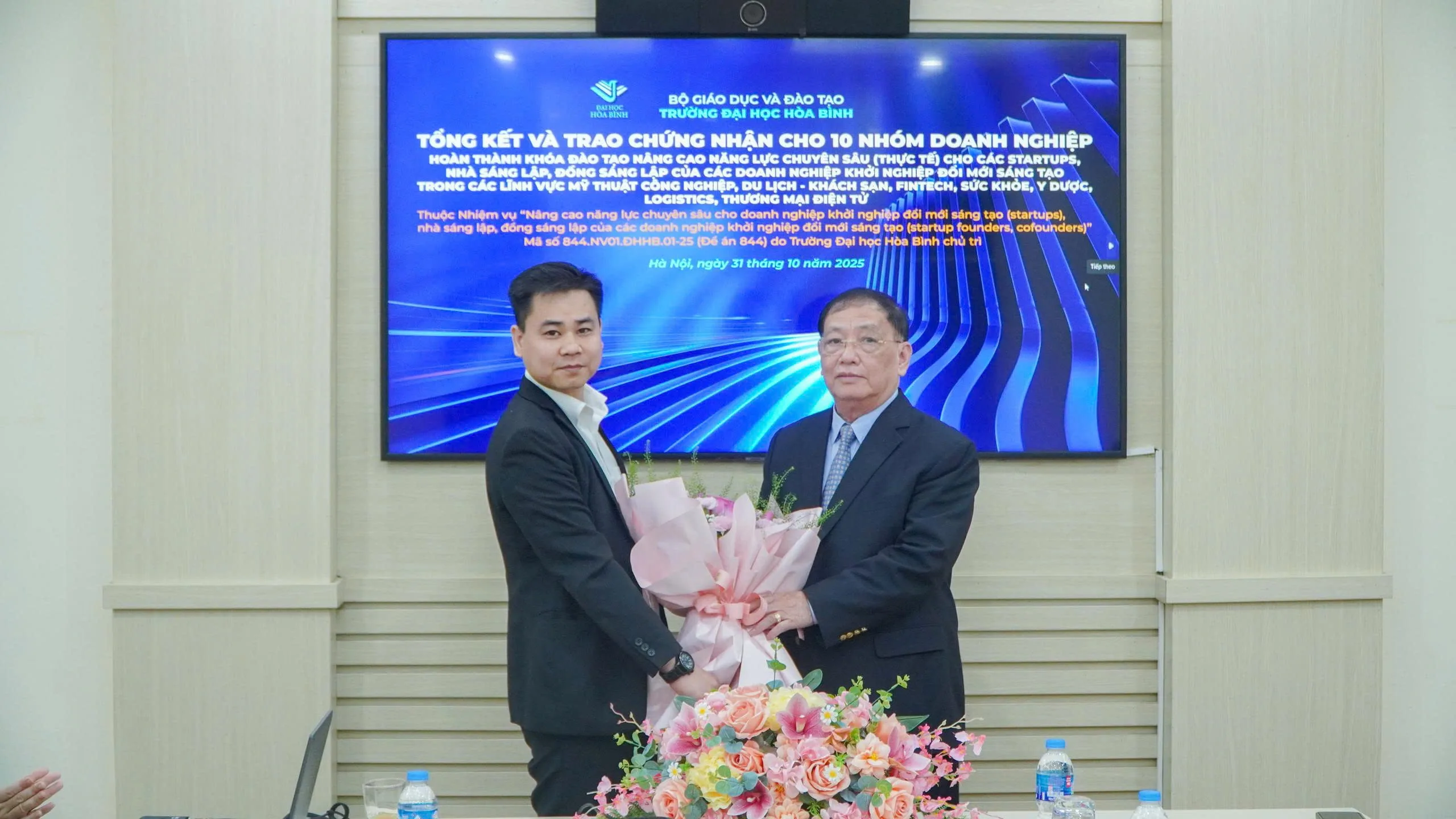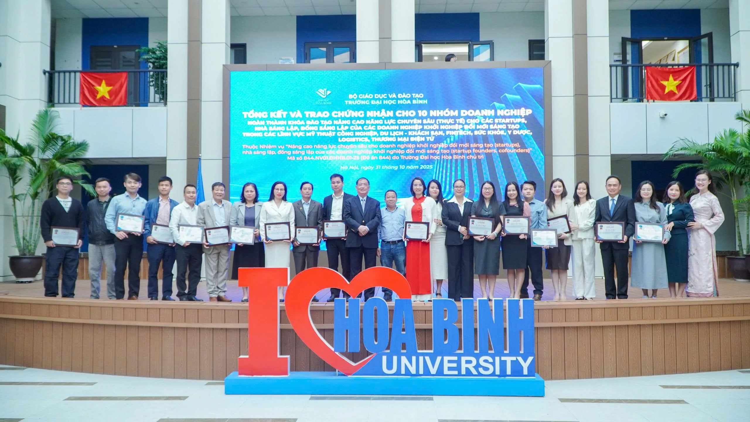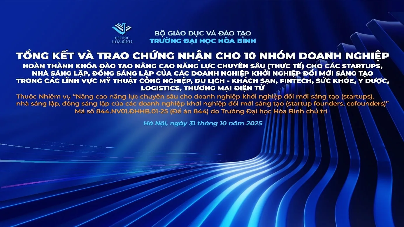 Nhằm công nhận kết quả của 10 nhóm doanh nghiệp tham gia khóa đào tạo nâng cao năng lực chuyên sâu (thực tế) cho các startups, nhà sáng lập, đồng sáng lập của các doanh nghiệp khởi nghiệp đổi mới sáng tạo (ĐMST) trong các lĩnh vực mỹ thuật công nghiệp, du lịch – khách sạn, fintech, sức khỏe, y dược, logistics, thương mại điện tử, trong khuôn khổ nhiệm vụ “Nâng cao năng lực chuyên sâu cho doanh nghiệp khởi nghiệp đổi mới sáng tạo (startups), nhà sáng lập, đồng sáng lập của các doanh nghiệp khởi nghiệp đổi mới sáng tạo (startup founders, cofounders)”, mã số 844.NV1.ĐHHB.01-25 thuộc Đề án 844 do Trường Đại học Hòa Bình (ĐHHB) chủ trì, sáng ngày 31/10/2025, Trường ĐHHB tổ chức tổng kết và trao chứng nhận hoàn thành khóa học cho 10 nhóm doanh nghiệp.