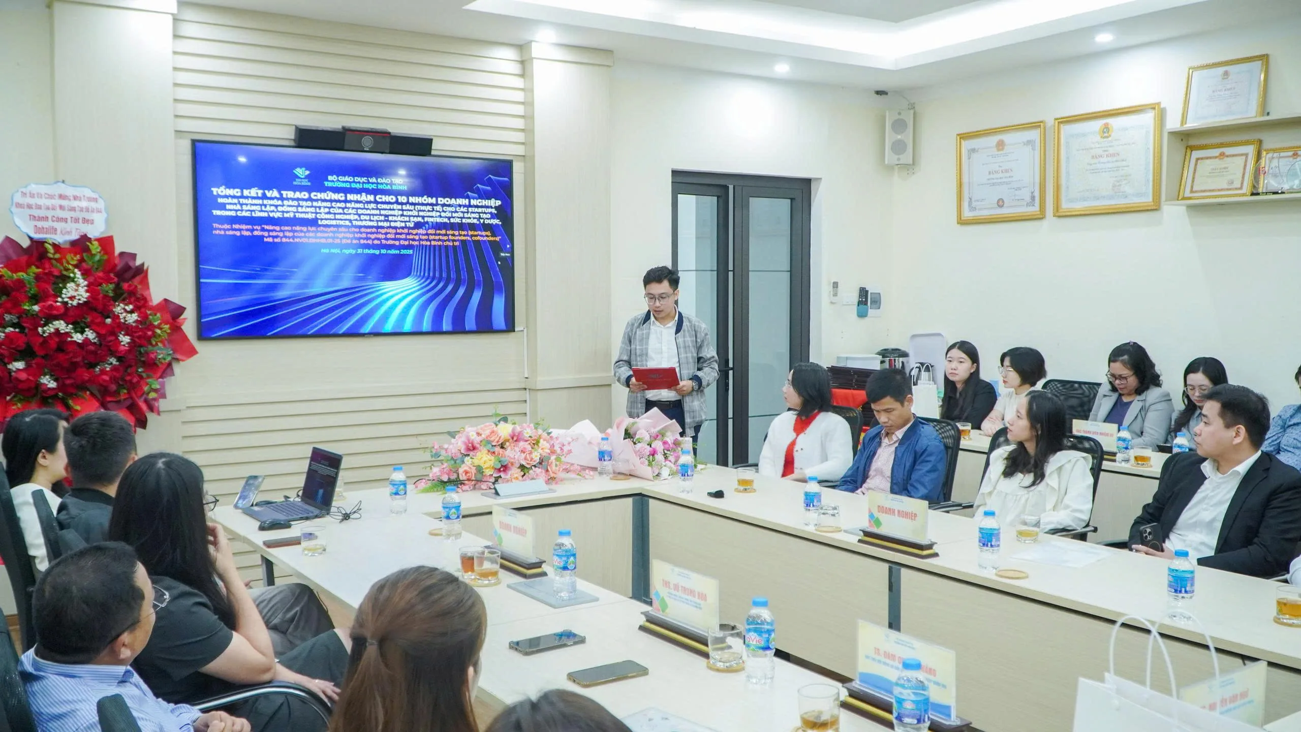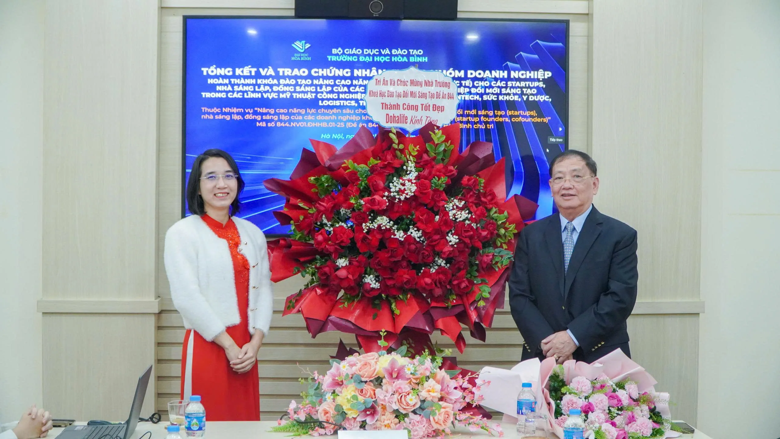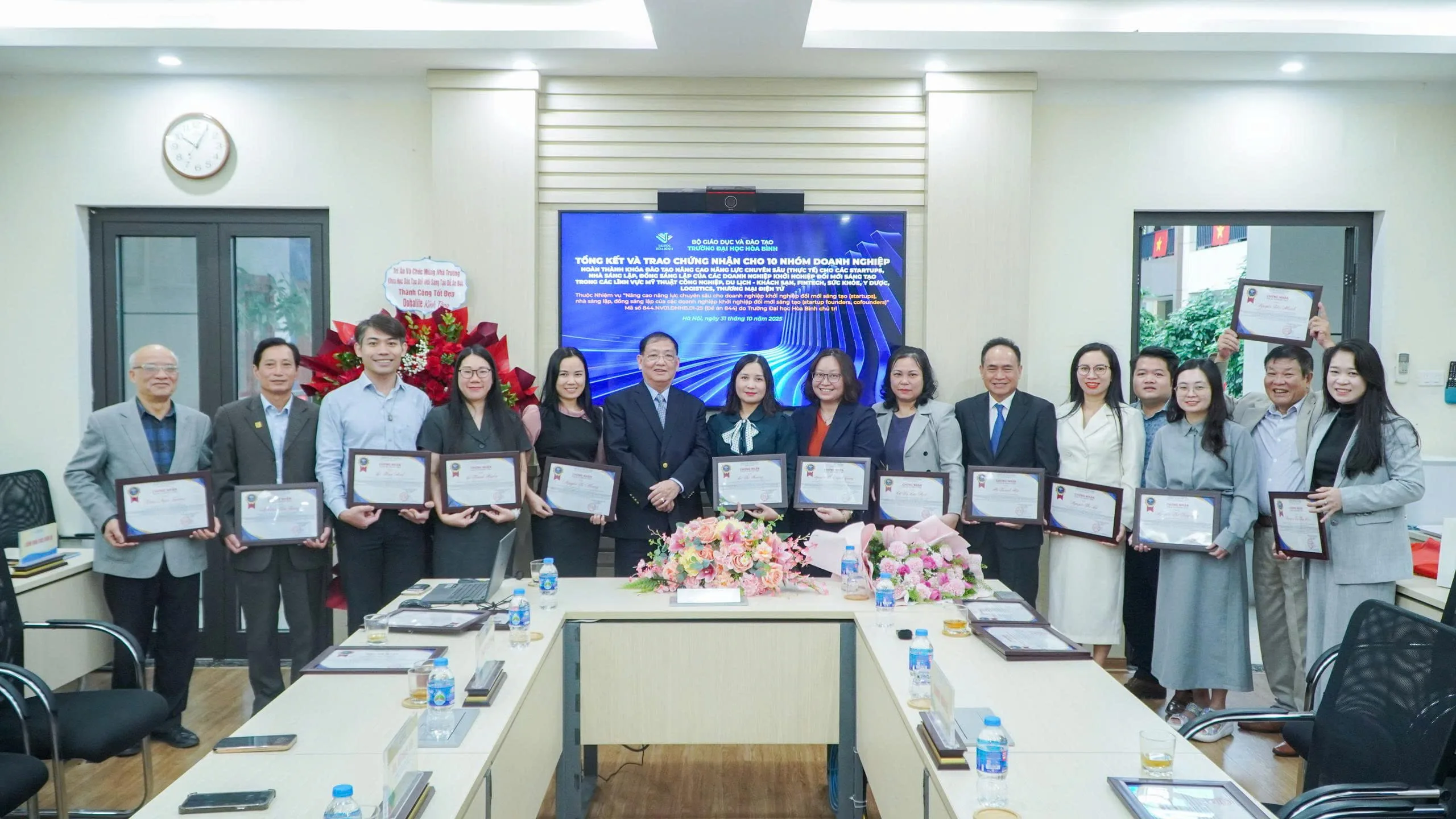 Nhằm công nhận kết quả của 10 nhóm doanh nghiệp tham gia khóa đào tạo nâng cao năng lực chuyên sâu (thực tế) cho các startups, nhà sáng lập, đồng sáng lập của các doanh nghiệp khởi nghiệp đổi mới sáng tạo (ĐMST) trong các lĩnh vực mỹ thuật công nghiệp, du lịch – khách sạn, fintech, sức khỏe, y dược, logistics, thương mại điện tử, trong khuôn khổ nhiệm vụ “Nâng cao năng lực chuyên sâu cho doanh nghiệp khởi nghiệp đổi mới sáng tạo (startups), nhà sáng lập, đồng sáng lập của các doanh nghiệp khởi nghiệp đổi mới sáng tạo (startup founders, cofounders)”, mã số 844.NV1.ĐHHB.01-25 thuộc Đề án 844 do Trường Đại học Hòa Bình (ĐHHB) chủ trì, sáng ngày 31/10/2025, Trường ĐHHB tổ chức tổng kết và trao chứng nhận hoàn thành khóa học cho 10 nhóm doanh nghiệp.
