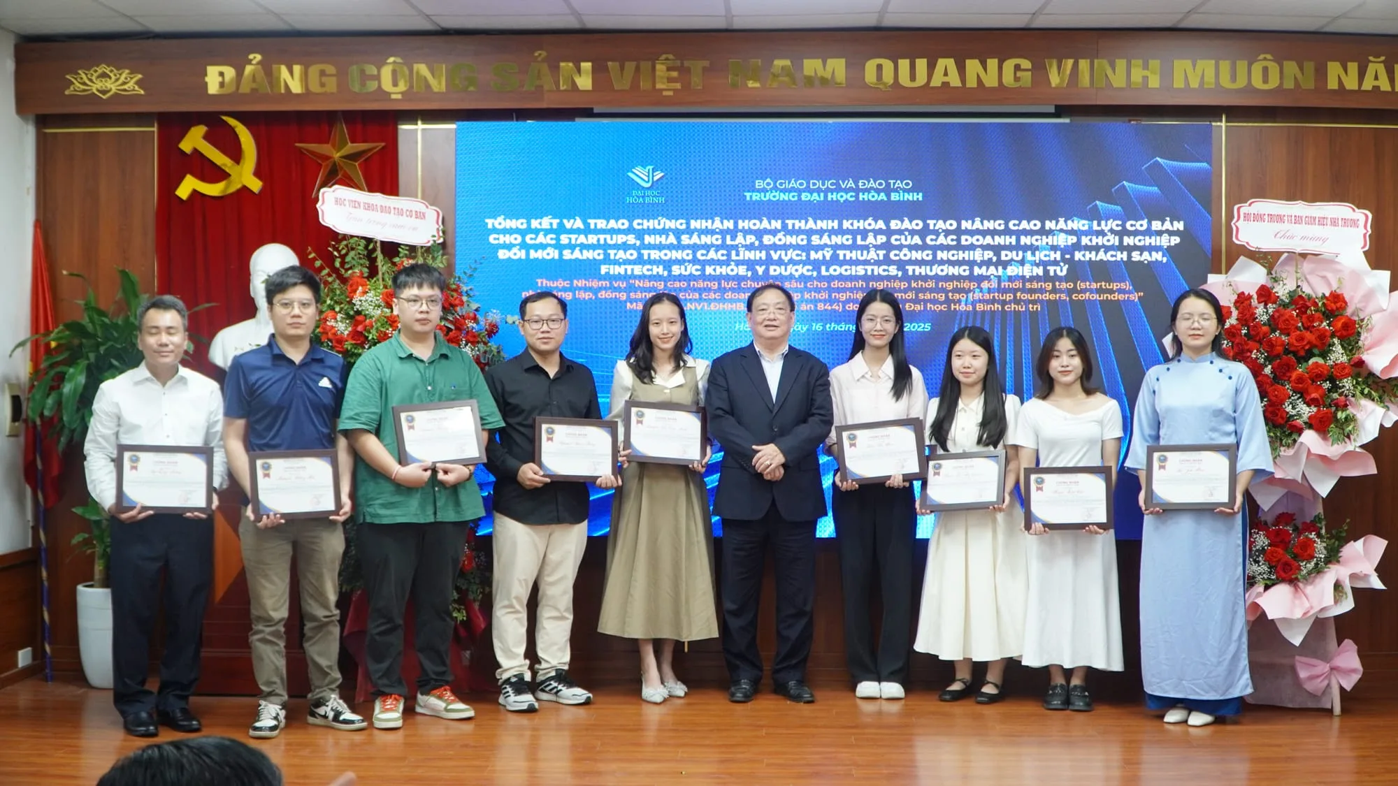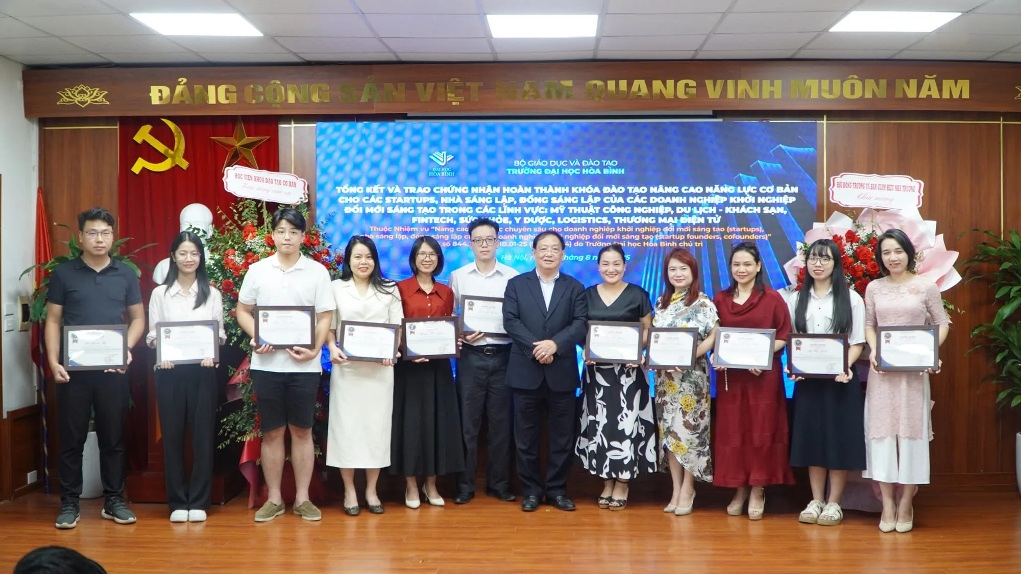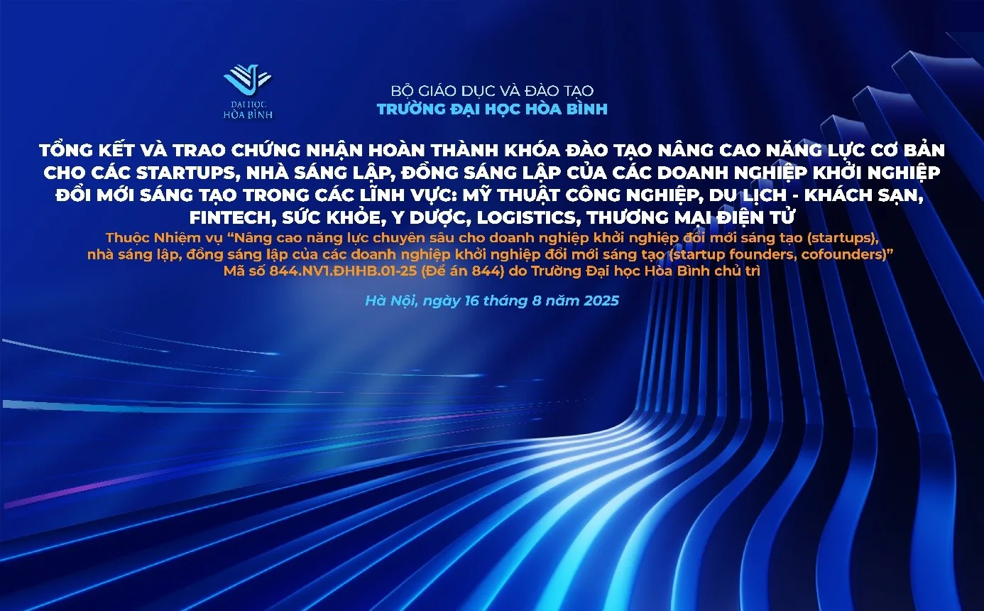 Nhằm công nhận kết quả của học viên tham gia khóa đào tạo nâng cao năng lực cơ bản tại Hà Nội cho các startups, nhà sáng lập, đồng sáng lập của các doanh nghiệp khởi nghiệp đổi mới sáng tạo (ĐMST) trong các lĩnh vực mỹ thuật công nghiệp, du lịch – khách sạn, fintech, sức khỏe, y dược, logistics, thương mại điện tử, trong khuôn khổ nhiệm vụ “Nâng cao năng lực chuyên sâu cho doanh nghiệp khởi nghiệp đổi mới sáng tạo (startups), nhà sáng lập, đồng sáng lập của các doanh nghiệp khởi nghiệp đổi mới sáng tạo (startup founders, cofounders)”, mã số 844.NV1.ĐHHB.01-25 thuộc Đề án 844 do Trường Đại học Hòa Bình chủ trì,chiều ngày 16/8/2025, Trường Đại học Hòa Bình (ĐHHB) tổ chức tổng kết và trao chứng nhận hoàn thành khóa học cho học viên.