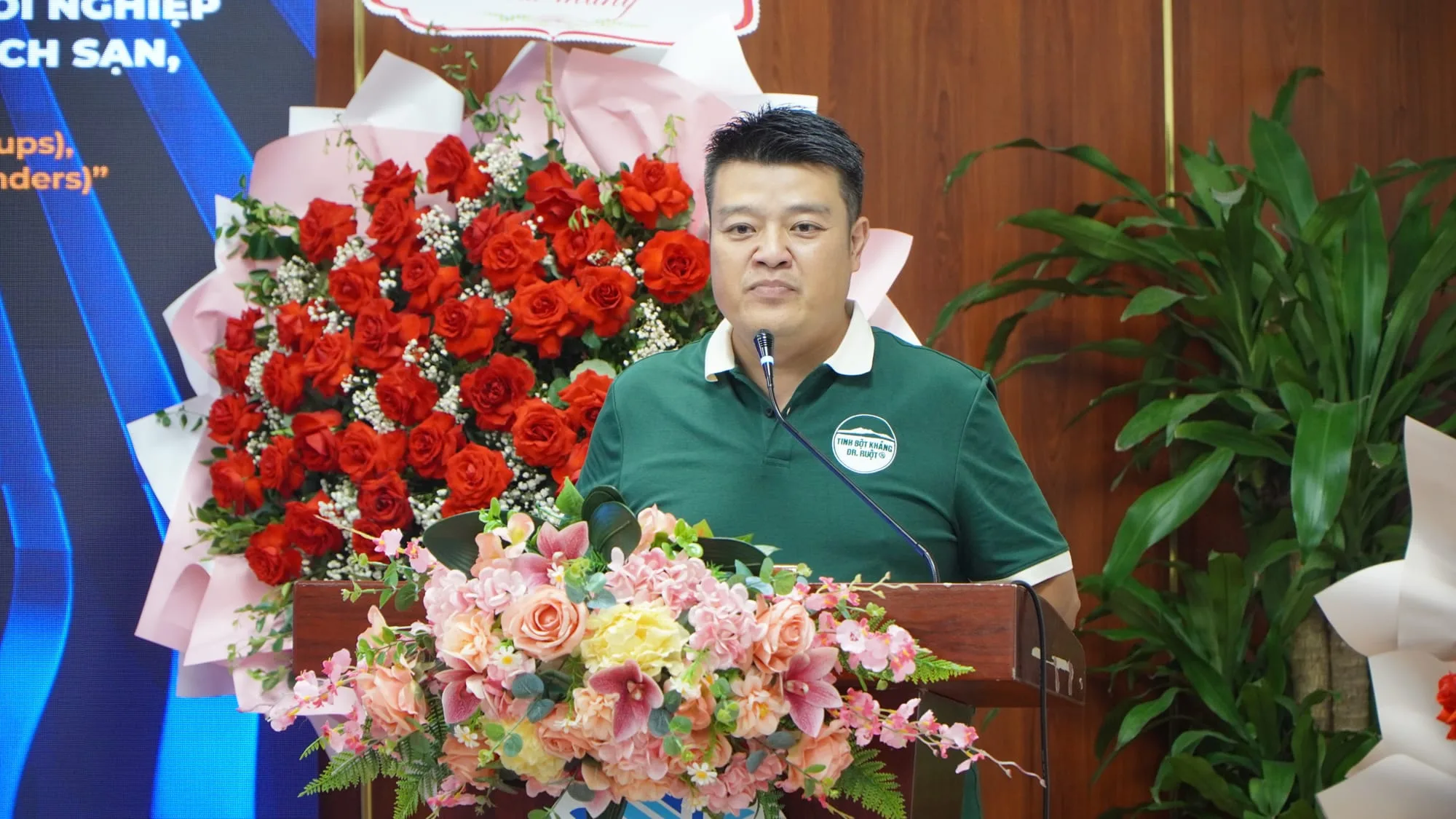 Tham gia buổi Lễ, có đại diện các doanh nghiệp đã hỗ trợ Nhà trường trong chương trình tham quan thực tế cho học viên. Ông Nguyễn Tuấn Dương – Giám đốc Công ty Cổ phần Chăm sóc Sức khoẻ đường ruột Việt Nam – đã chia sẻ những kinh nghiệm quý báu trong hành trình khởi nghiệp của Công ty, và tiếp thêm nội lực cho các doanh nghiệp vững vàng trong hành trình sắp tới. Ông cũng cho biết, yếu tố quyết định sự thành công của doanh nghiệp chính là sản phẩm cần có sự độc đáo, có sức cạnh tranh, đặc thù, có tính tương lai, và có hai con đường chính để doanh nghiệp khởi nghiệp thành công, một là, căn cứ trên những nhu cầu của thực tiễn, doanh nghiệp đưa ra được những đề xuất, giải pháp tốt hơn những vấn đề hiện tại, tức là nâng cấp những giải pháp cũ để tạo ra giải pháp mới; hai là, doanh nghiệp sáng tạo ra những giải pháp mới, đủ tầm cạnh tranh, đủ quy mô và phát triển bền vững.