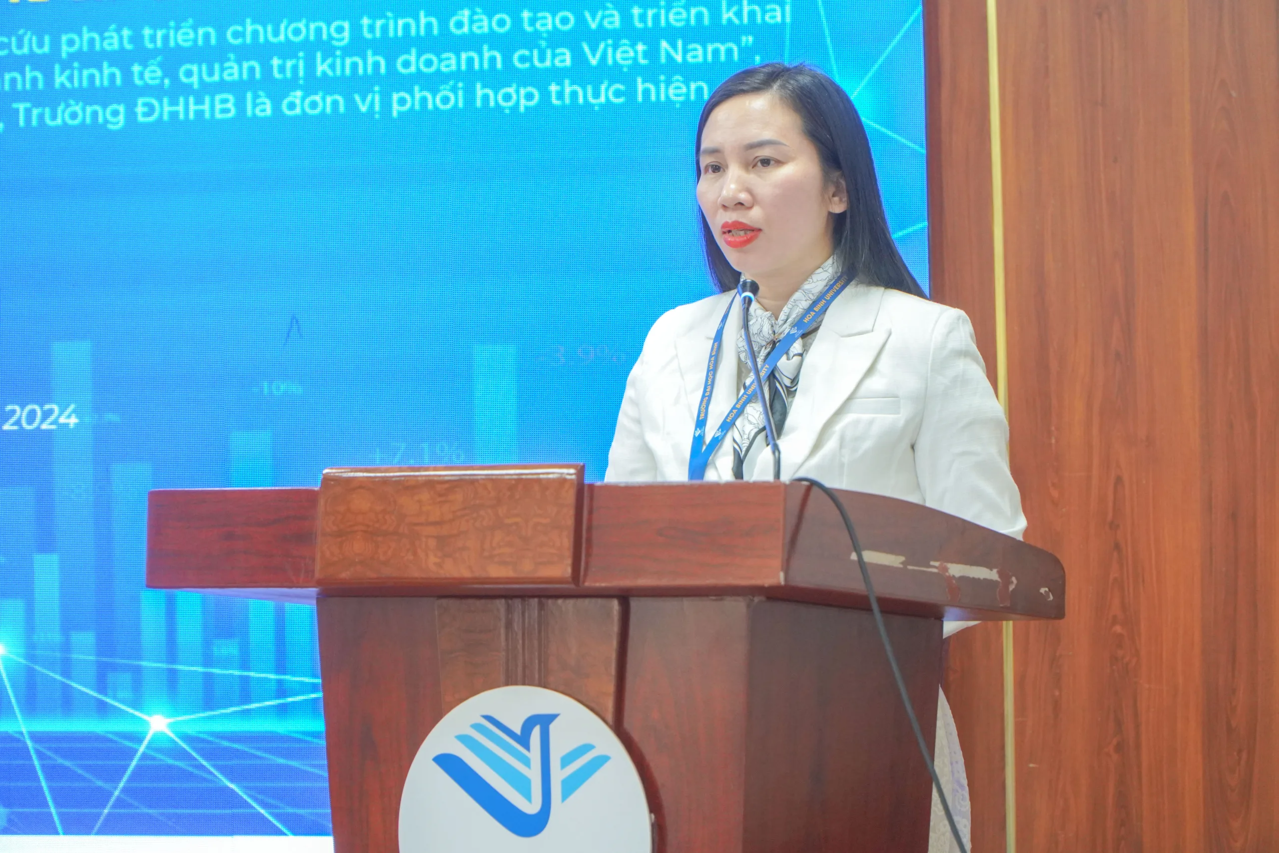 Mở đầu chương trình, TS. Lê Thị Phương, Viện trưởng Viện NCKH trình bày Báo cáo tóm tắt các kết quả chính của nhiệm vụ KH&CN cấp Quốc gia “Nghiên cứu phát triển chương trình đào tạo và triển khai đào tạo về năng suất chất lượng cho sinh viên các trường đại học khối ngành kinh tế, quản trị kinh doanh của Việt Nam”. Đây là nhiệm vụ thuộc Chương trình “Hỗ trợ doanh nghiệp nâng cao năng suất và chất lượng sản phẩm, hàng hóa giai đoạn 2021-2030” được thực hiện từ tháng 02/2022 đến tháng 01/2024. Tháng 3/2024, đề tài đã nghiệm thu chính thức. Trong khuôn khổ thực hiện nhiệm vụ KH&CN cấp Quốc gia trên, Trường ĐHHB đã phối hợp cùng Trường Đại học Ngoại thương và các trường đại học (gồm: Trường Đại học Lao động Xã hội, Trường Đại học Trà Vinh) tham gia các hoạt động chính như: Hoàn thiện các báo cáo, khảo sát theo đề xuất của đơn vị chủ trì; Tham gia các tọa đàm, hội thảo khoa học theo Thuyết minh nhiệm vụ; Đưa học phần Quản lý năng suất và chất lượng (03 tín chỉ) vào chương trình đào tạo các ngành: Quản trị kinh doanh, Thương mại điện tử, Logistics và Quản lý chuỗi cung ứng trình độ đại học tại Trường ĐHHB; Cử giảng viên tham gia khóa tập huấn, bồi dưỡng kiến thức, nâng cao năng lực đáp ứng yêu cầu giảng dạy học phần “Quản lý năng suất và chất lượng”; Cử sinh viên tham gia khóa học “Quản lý năng suất và chất lượng” do giảng viên Trường Đại học Ngoại thương, Trường Đại học Lao động Xã hội, Trường ĐHHB và Trường Đại học Trà Vinh giảng dạy…