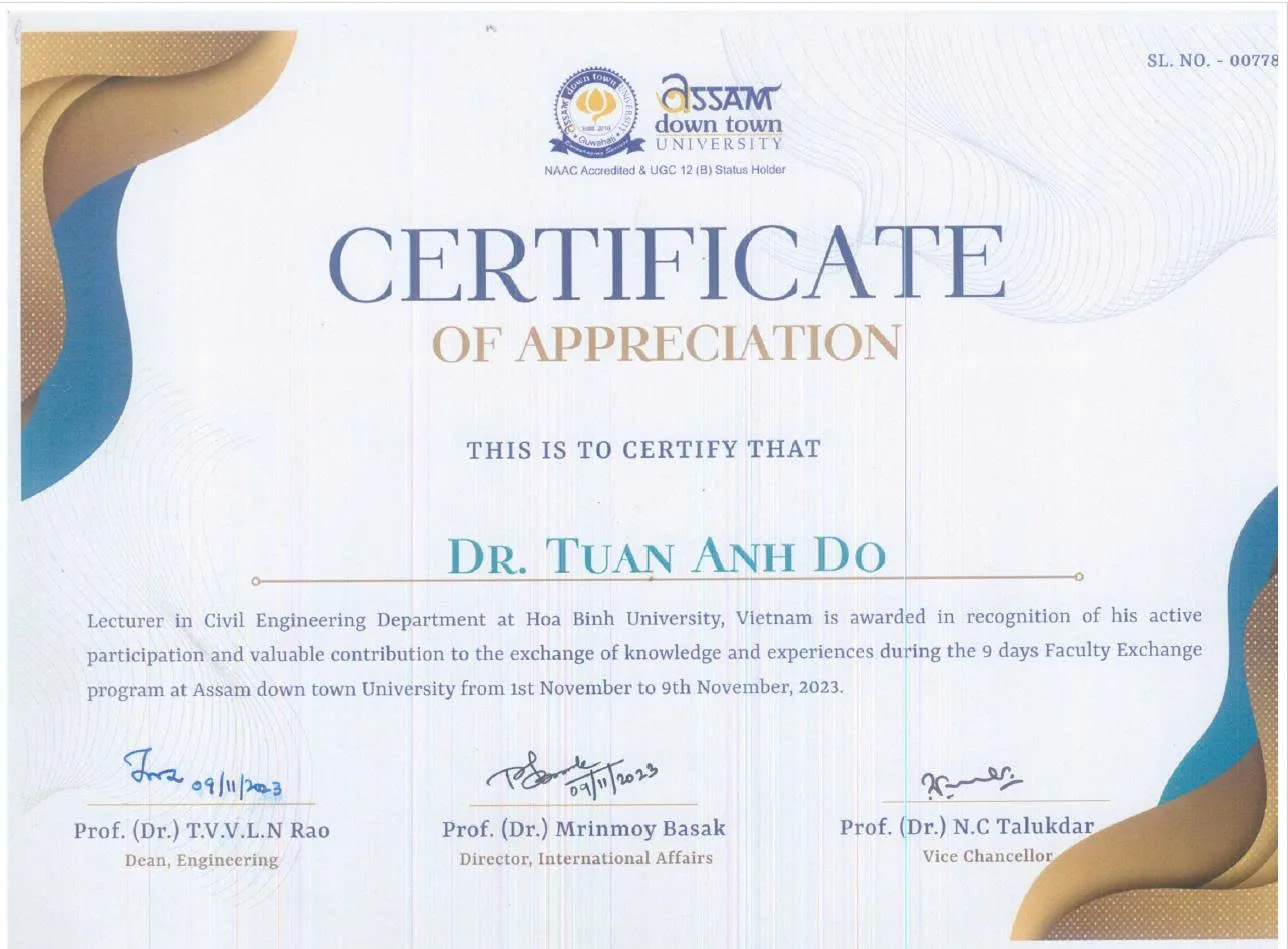 Họ và tên: TS. Đỗ Tuấn Anh Đơn vị: Phòng Khảo thí và Quản lý chất lượng Chức vụ: Trưởng Phòng Hoạt động: Trao đổi giảng viên quốc tế Thời gian: 01 – 09 tháng 11 năm 2023 Địa điểm: Assam, Ấn Độ |