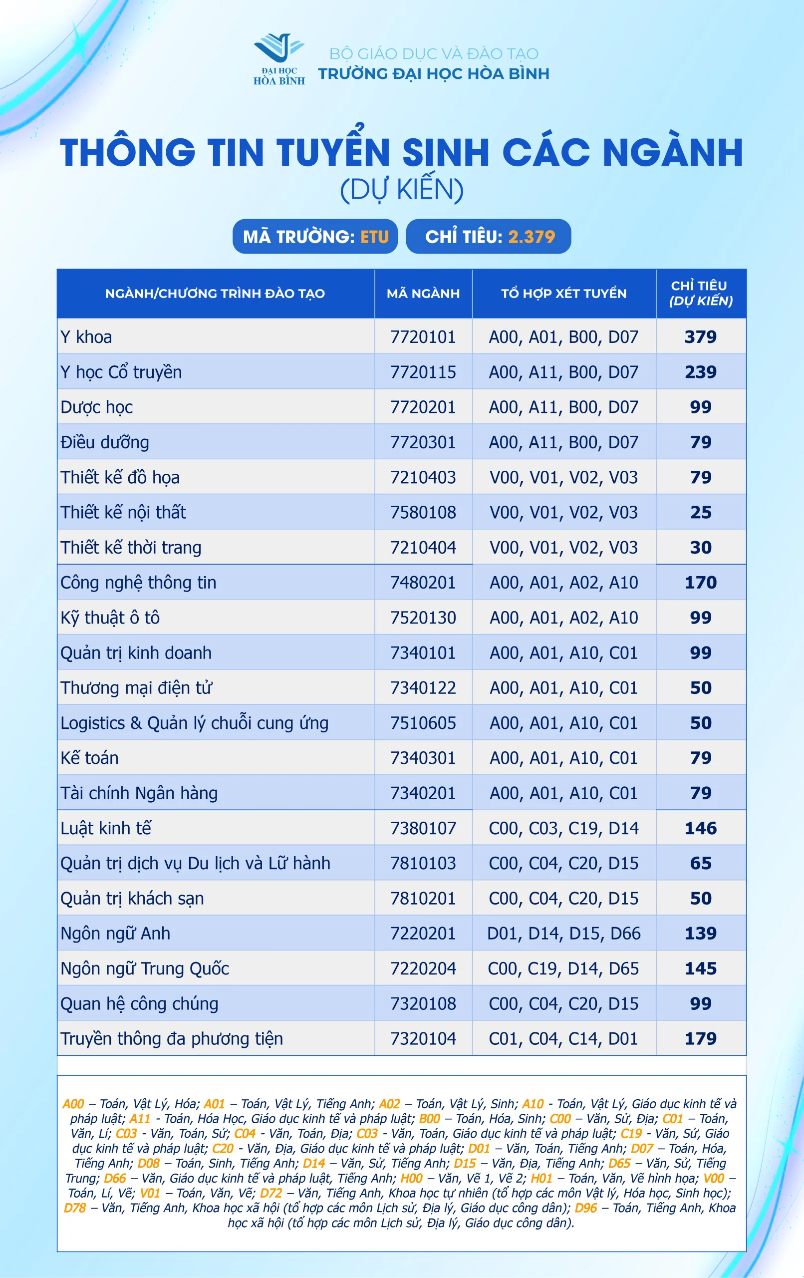 Trường Đại học Hòa Bình (ETU) công bố thông tin tuyển sinh năm 2025 (Dự kiến), theo đó Trường tuyển sinh 2.379 chỉ tiêu cho 21 ngành đào tạo với 04 phương thức xét tuyển.