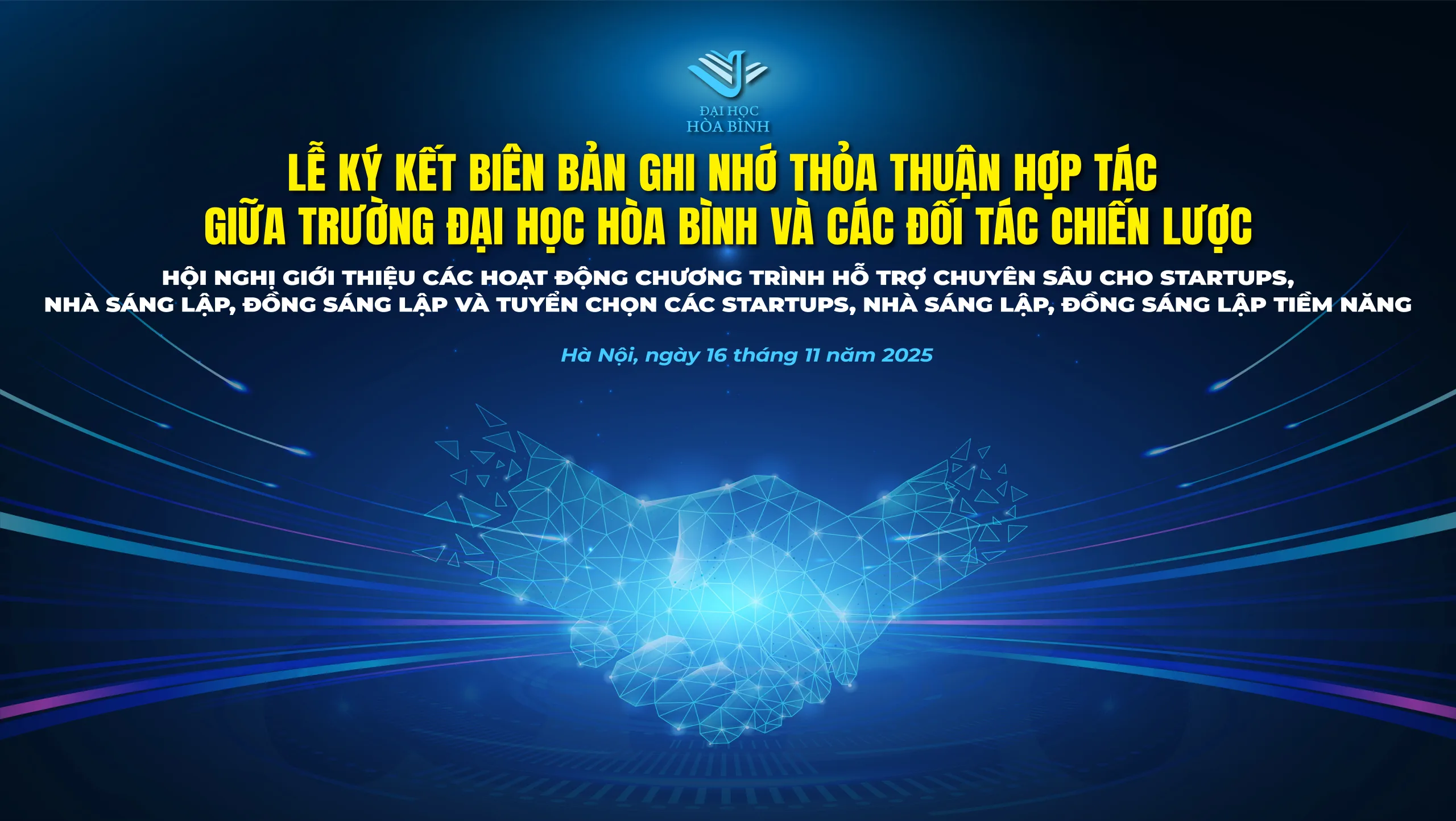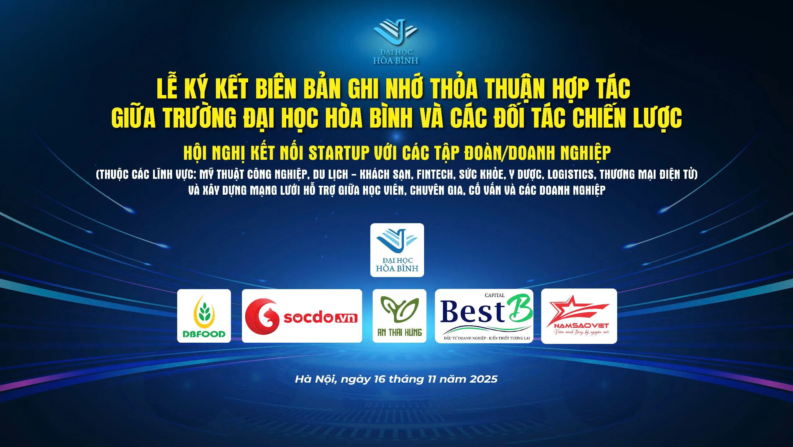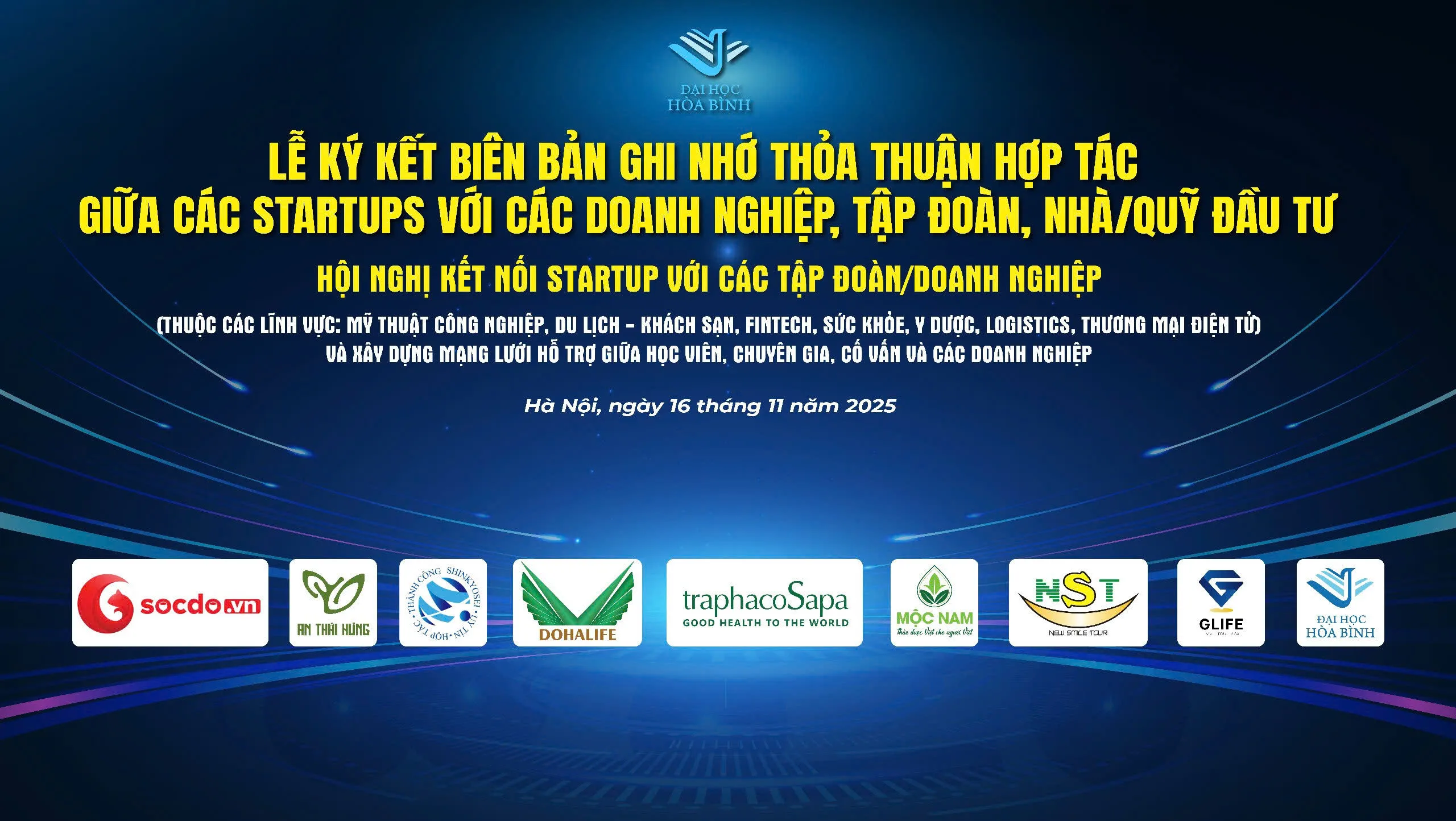 Trong khuôn khổ Hội nghị kết nối Startup với các Tập đoàn/Doanh nghiệp và xây dựng mạng lưới hỗ trợ giữa học viên, chuyên gia, cố vấn và các doanh nghiệp, diễn ra ngày 16/11/2025 tại Trường Đại học Hòa Bình, hai hoạt động trọng tâm và ý nghĩa đặc biệt sẽ được tổ chức: Lễ ký kết Biên bản ghi nhớ (MOU) hợp tác giữa các startup và các đối tác chiến lược, cùng Lễ ra mắt Mạng lưới hỗ trợ giữa học viên – chuyên gia – doanh nghiệp – nhà đầu tư.