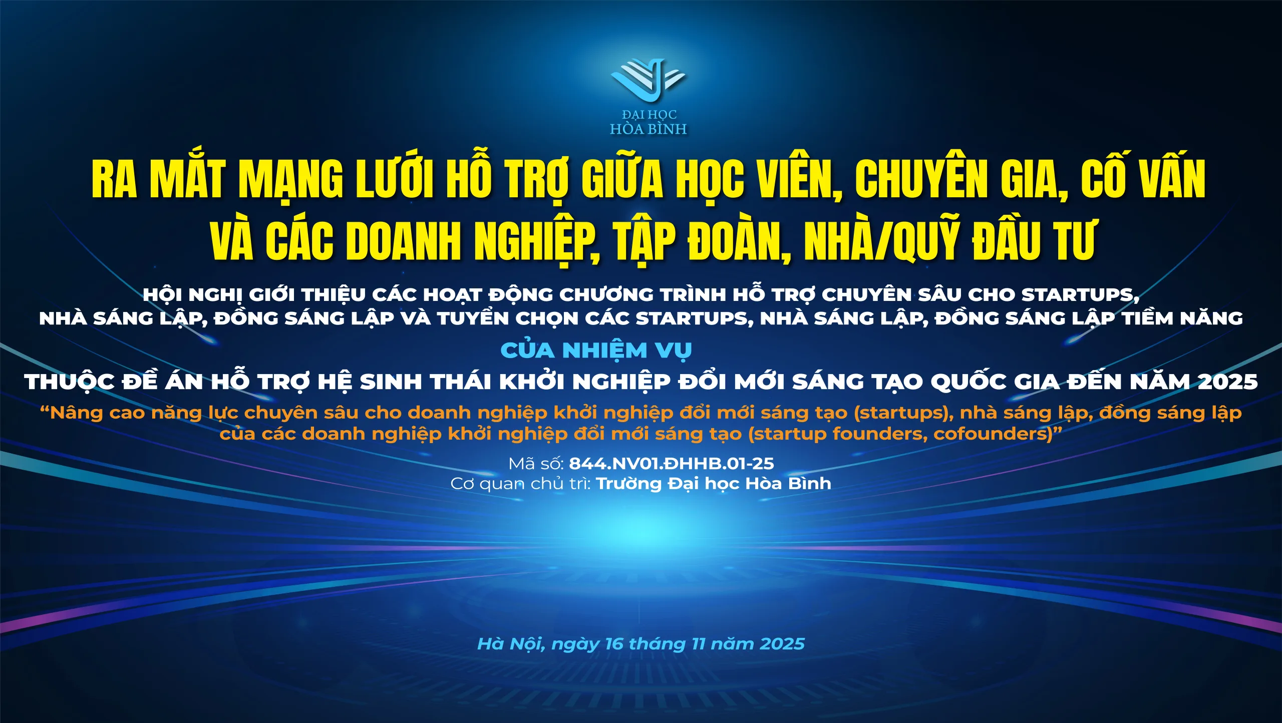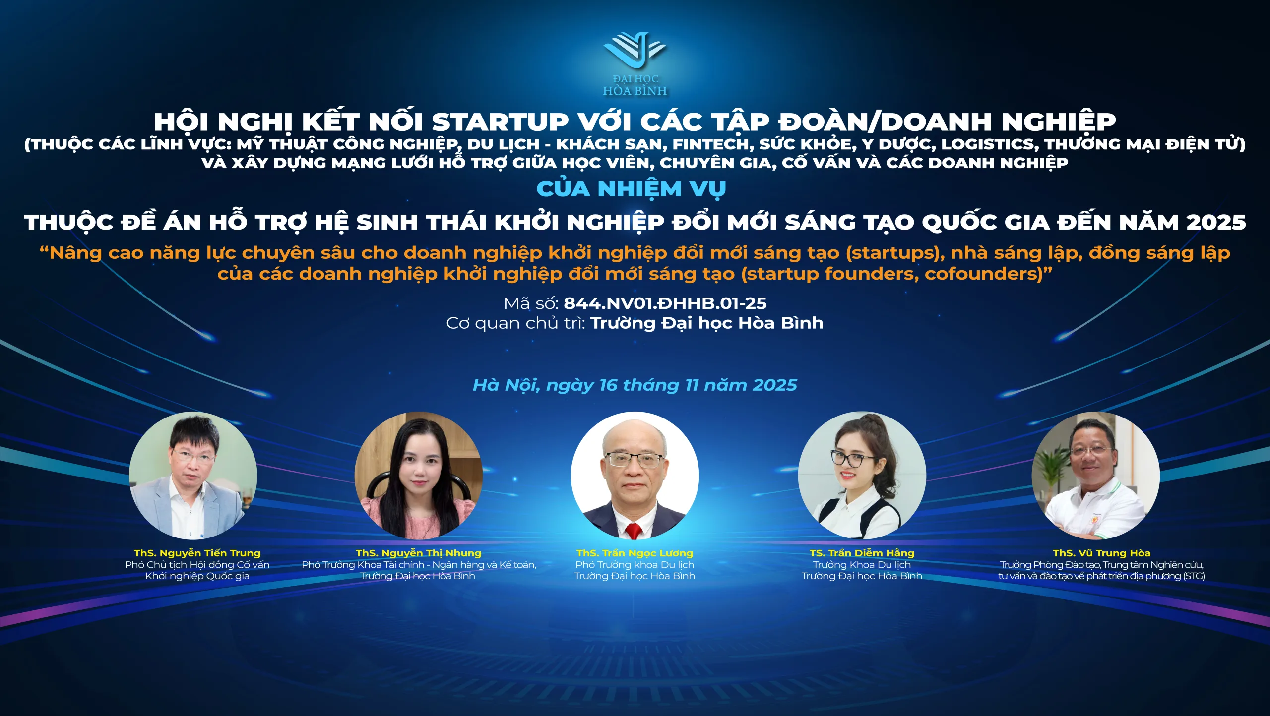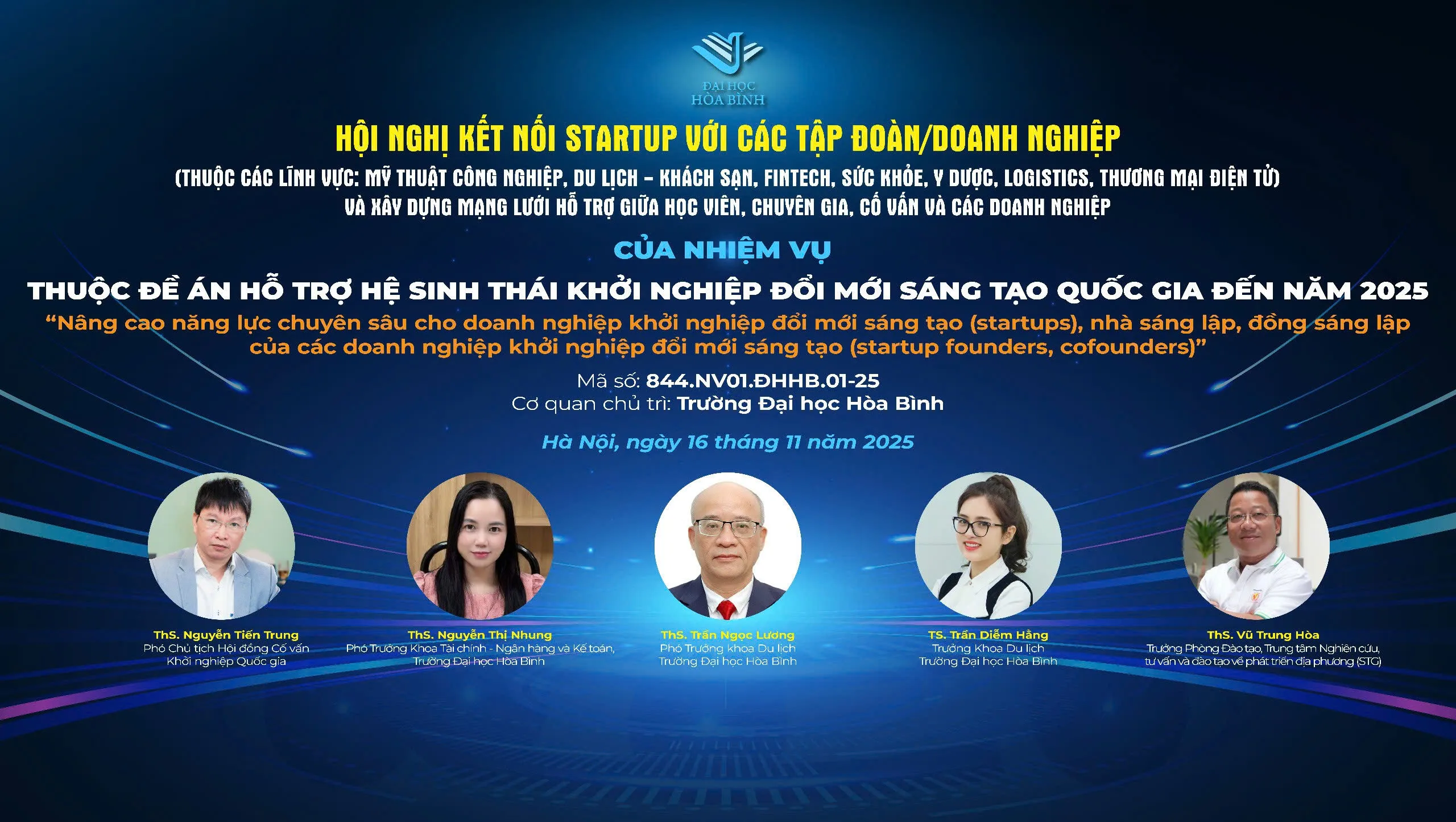 Sự kiện nằm trong khuôn khổ nhiệm vụ “Nâng cao năng lực chuyên sâu cho doanh nghiệp khởi nghiệp đổi mới sáng tạo (startups), nhà sáng lập, đồng sáng lập của các doanh nghiệp khởi nghiệp đổi mới sáng tạo” (mã số 844.NV1.ĐHHB.01-25), thuộc Đề án 844 – Hỗ trợ hệ sinh thái khởi nghiệp đổi mới sáng tạo quốc gia đến năm 2025, do Bộ Khoa học và Công nghệ phê duyệt và Trường Đại học Hòa Bình chủ trì thực hiện.