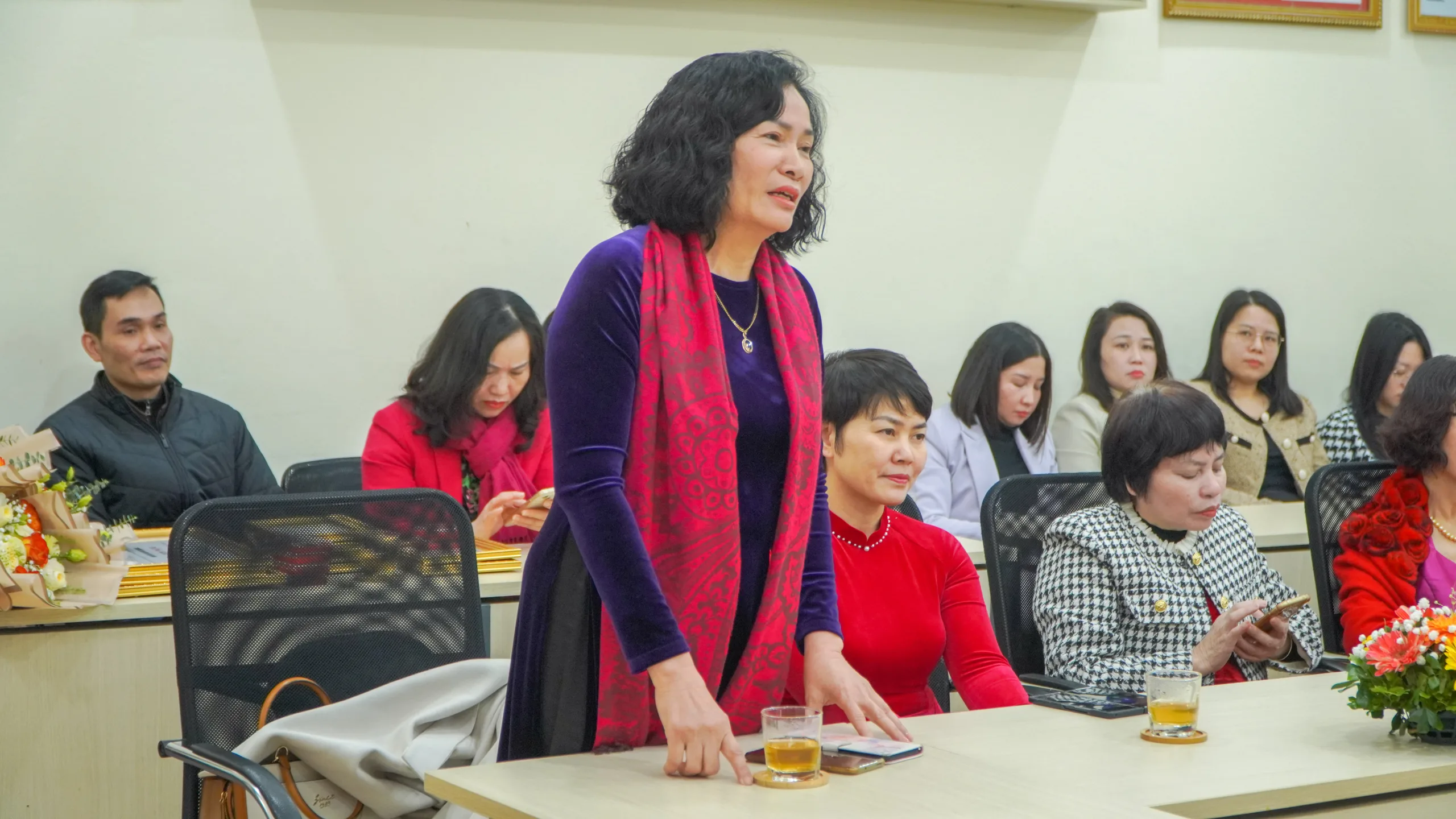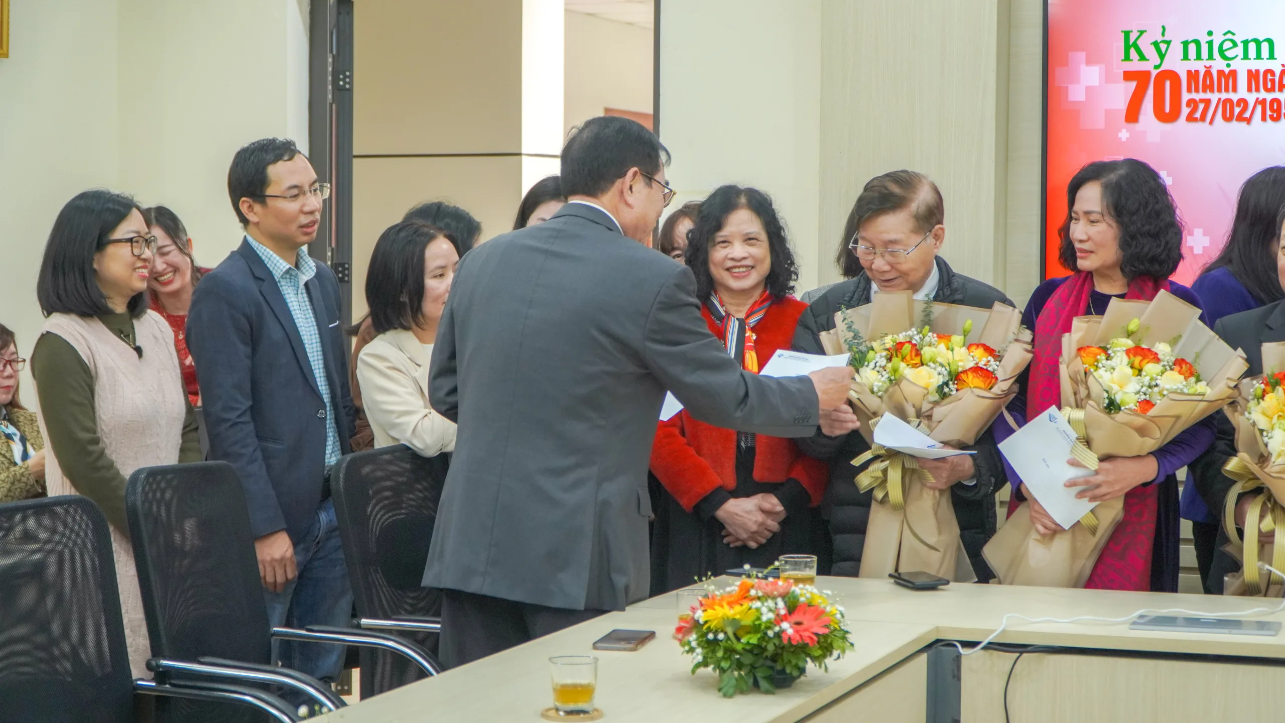 TS. Nguyễn Văn Ngữ và NGND.PGS.TS. Tô Ngọc Hưng tặng hoa và quà chúc mừng Ngày 27/2