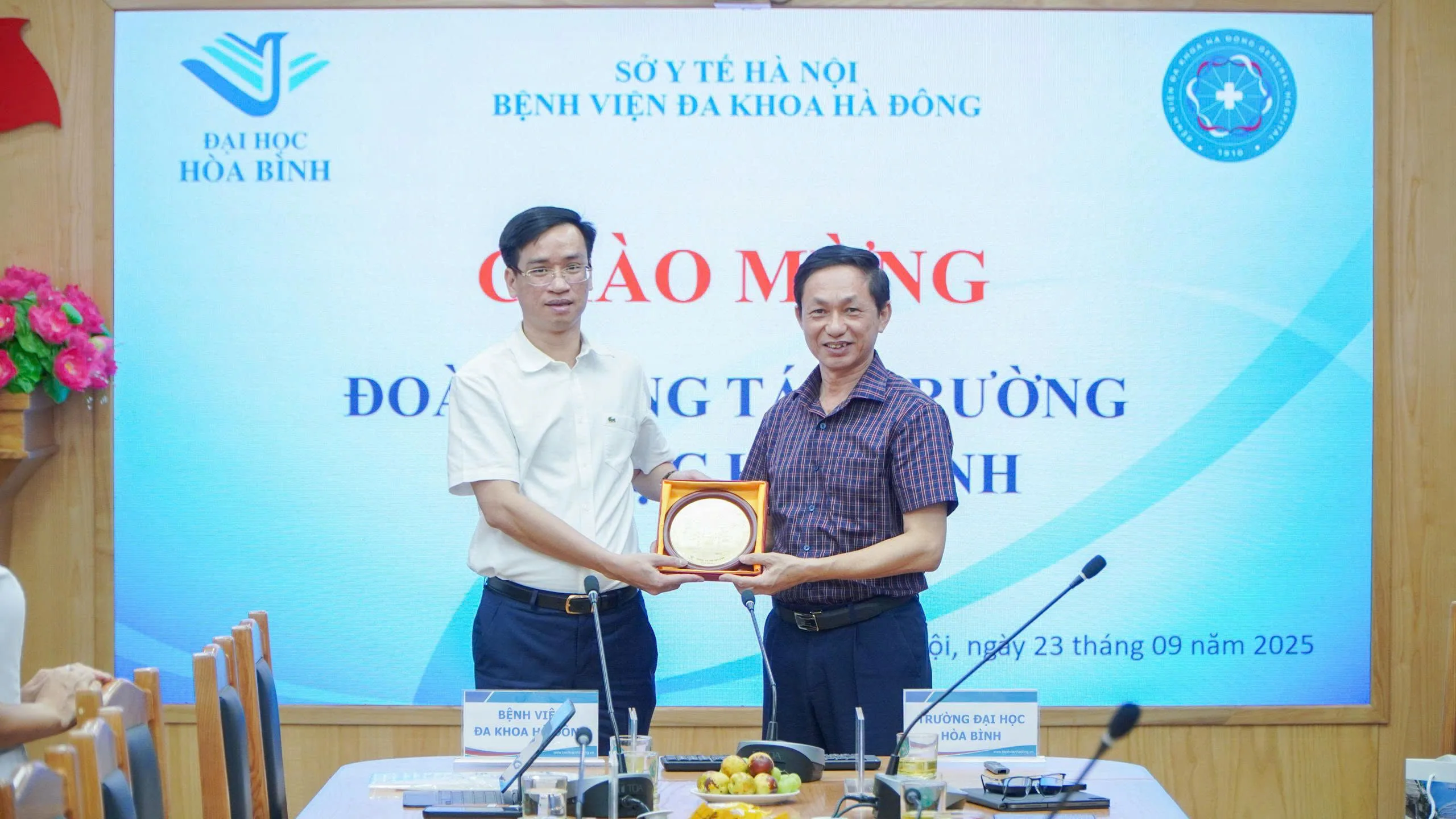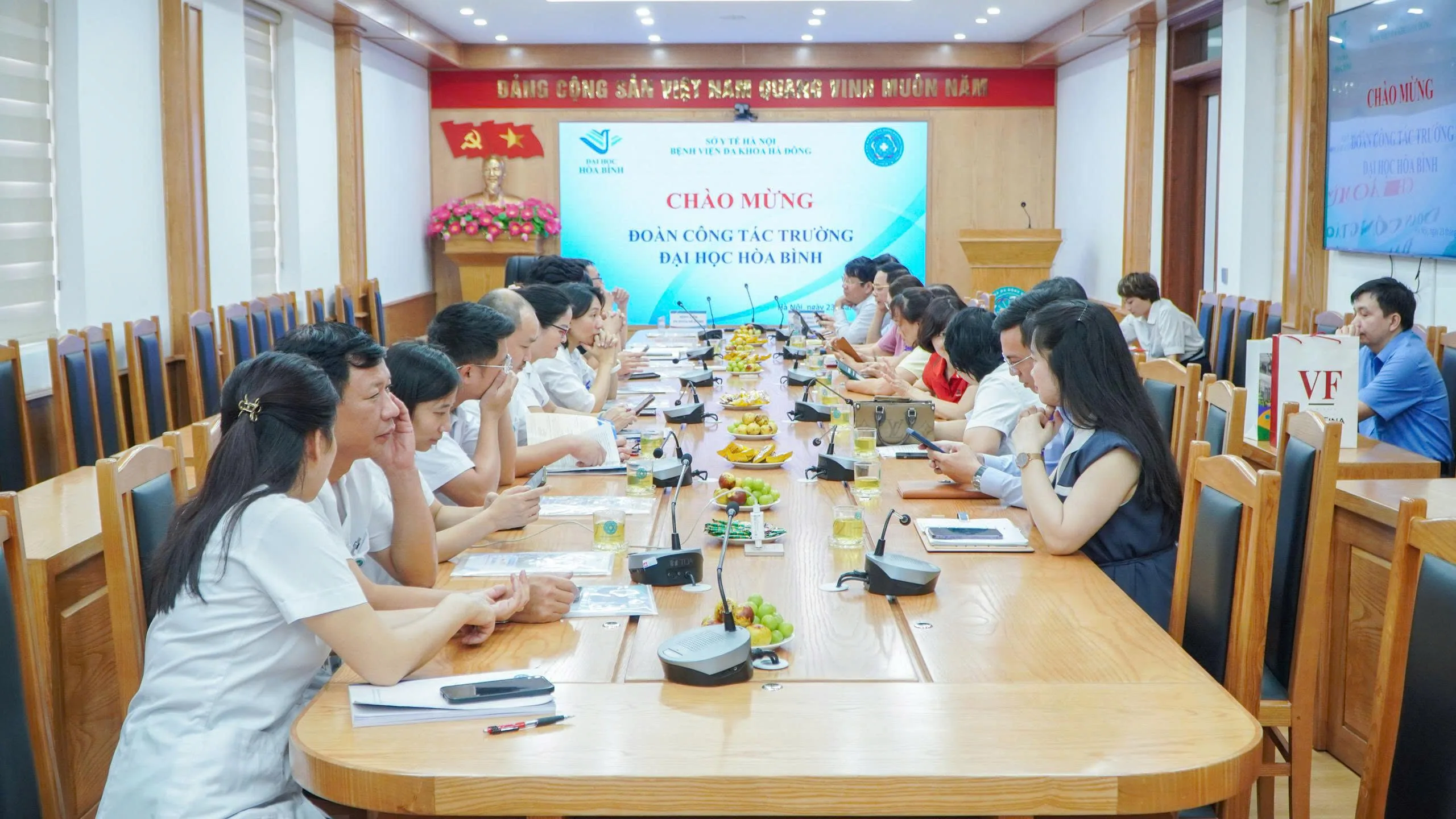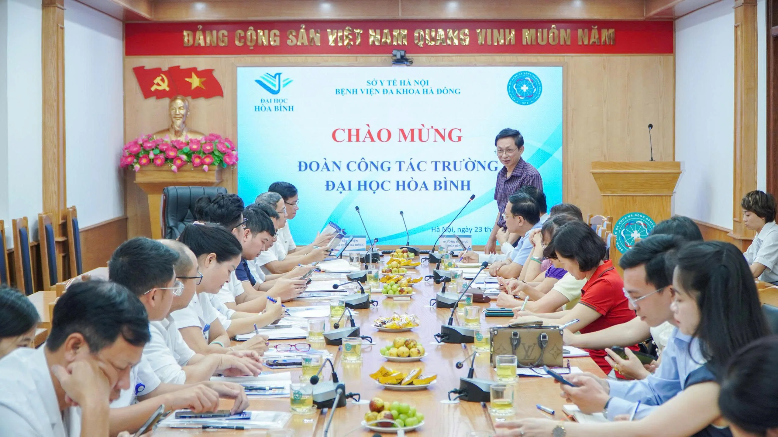 Sáng ngày 23/9/2025, lãnh đạo Trường Đại học Hòa Bình đã có buổi làm việc với Ban Giám đốc Bệnh viện Đa khoa Hà Đông nhằm trao đổi sâu rộng về tiềm năng hợp tác trên nhiều lĩnh vực, đặc biệt là trong công tác tổ chức đào tạo thực hành lâm sàng cho các ngành thuộc khối sức khỏe.