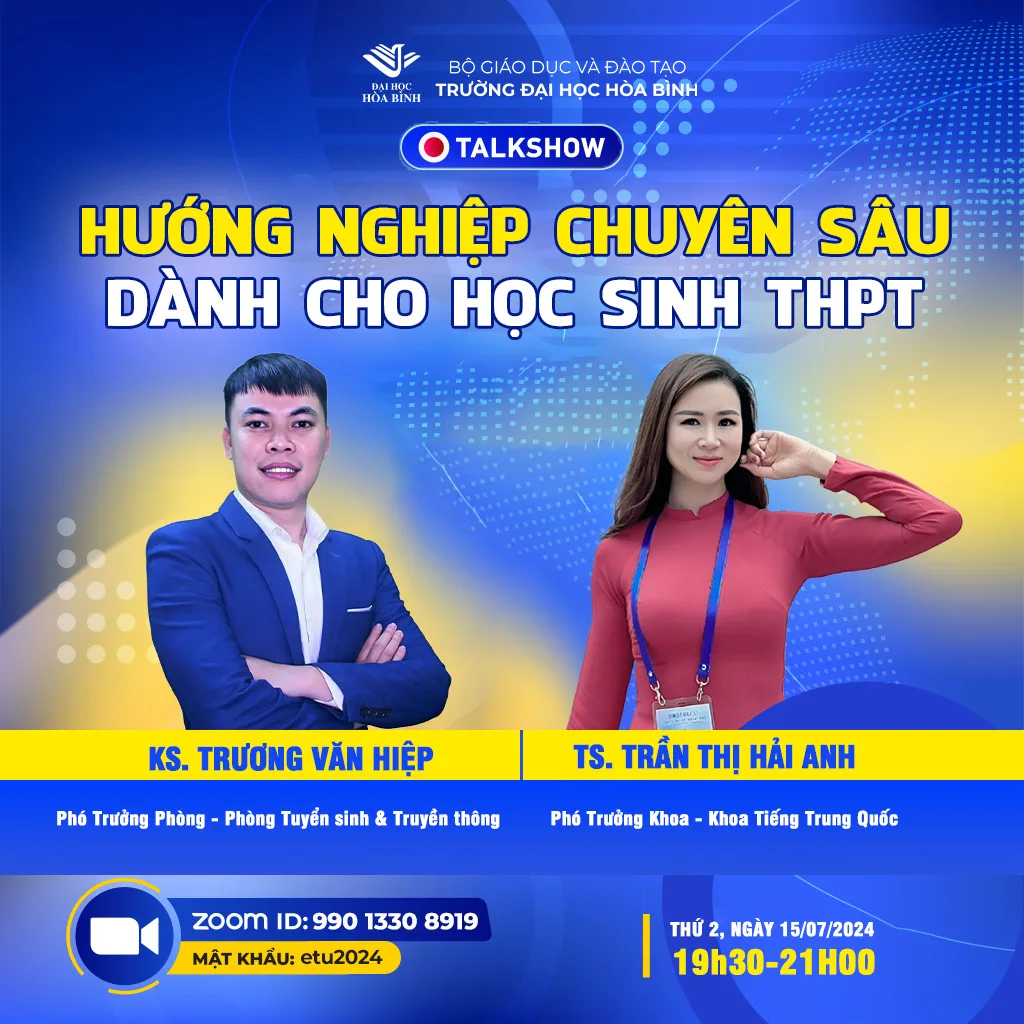 Ngày 15/7/2024, buổi chuyên đề tiếp theo trong chuỗi “Hướng nghiệp chuyên sâu cho các bạn THPT” sẽ được tiếp nối qua buổi Zoom tối nay, nhằm chia sẻ, hướng dẫn đăng ký nguyện vọng vào Trường Đại học Hòa Bình cho các bạn học sinh THPT đang muốn đăng ký nguyện vọng vào Trường Đại học Hòa Bình.
