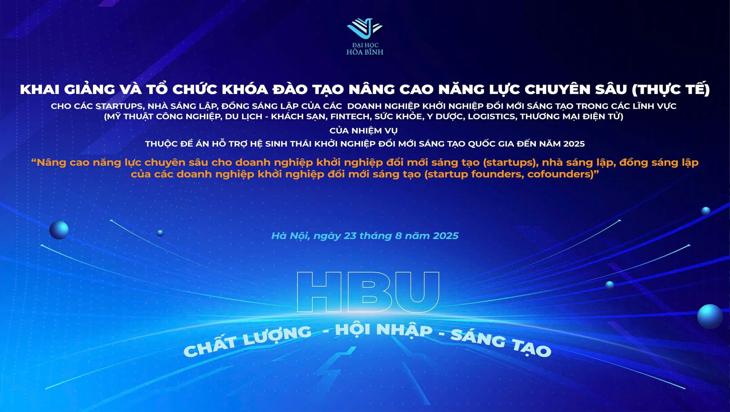 Sáng ngày 23/8/2025, trong khuôn khổ nhiệm vụ “Nâng cao năng lực chuyên sâu cho doanh nghiệp khởi nghiệp đổi mới sáng tạo (startups), nhà sáng lập, đồng sáng lập của các doanh nghiệp khởi nghiệp đổi mới sáng tạo (startup founders, cofounders)”, mã số 844.NV1.ĐHHB.01-25, Trường Đại học Hòa Bình (ĐHHB) đã tổ chức Lễ Khai giảng khóa đào tạo nâng cao năng lực chuyên sâu (thực tế) cho các startups, nhà sáng lập, đồng sáng lập của các doanh nghiệp khởi nghiệp đổi mới sáng tạo trong các lĩnh vực mỹ thuật công nghiệp, du lịch – khách sạn, fintech, sức khỏe, y dược, logistics, thương mại điện tử.