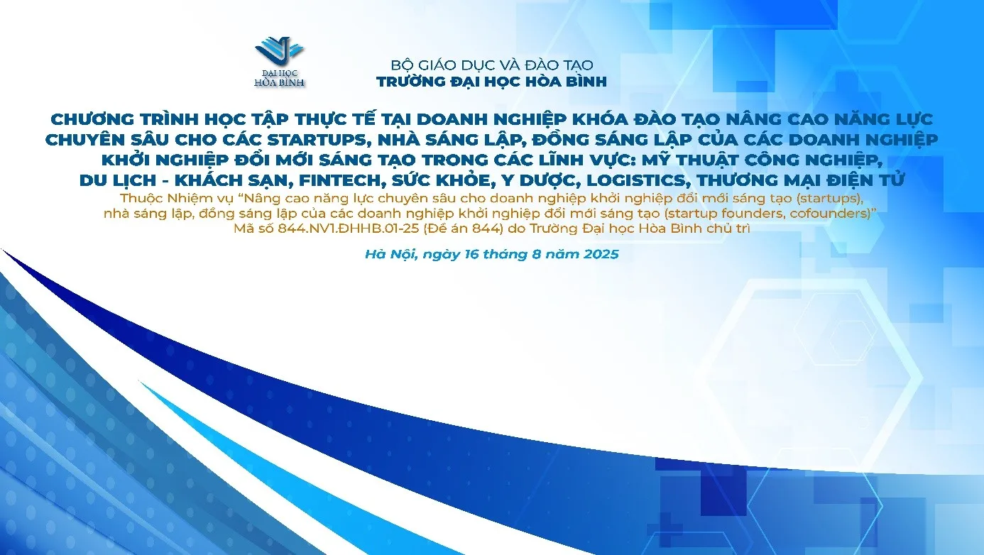 Thực hiện nhiệm vụ “Nâng cao năng lực chuyên sâu cho doanh nghiệp khởi nghiệp đổi mới sáng tạo (startups), nhà sáng lập, đồng sáng lập của các doanh nghiệp khởi nghiệp đổi mới sáng tạo (startup founders, cofounders)”, mã số 844.NV1.ĐHHB.01-25 thuộc Đề án 844 do Trường Đại học Hòa Bình (ĐHHB) chủ trì, trong khuôn khổ khóa đào tạo nâng cao năng lực cơ bản tại Hà Nội cho các startups, nhà sáng lập, đồng sáng lập của các doanh nghiệp khởi nghiệp đổi mới sáng tạo (ĐMST) trong các lĩnh vực mỹ thuật công nghiệp, du lịch – khách sạn, fintech, sức khỏe, y dược, logistics, thương mại điện tử, sáng ngày 16/8/2025, Nhà trường đã tổ chức thành công chương trình học tập, tham quan và trải nghiệm thực tế tại doanh nghiệp dành cho học viên tham gia khóa đào tạo.