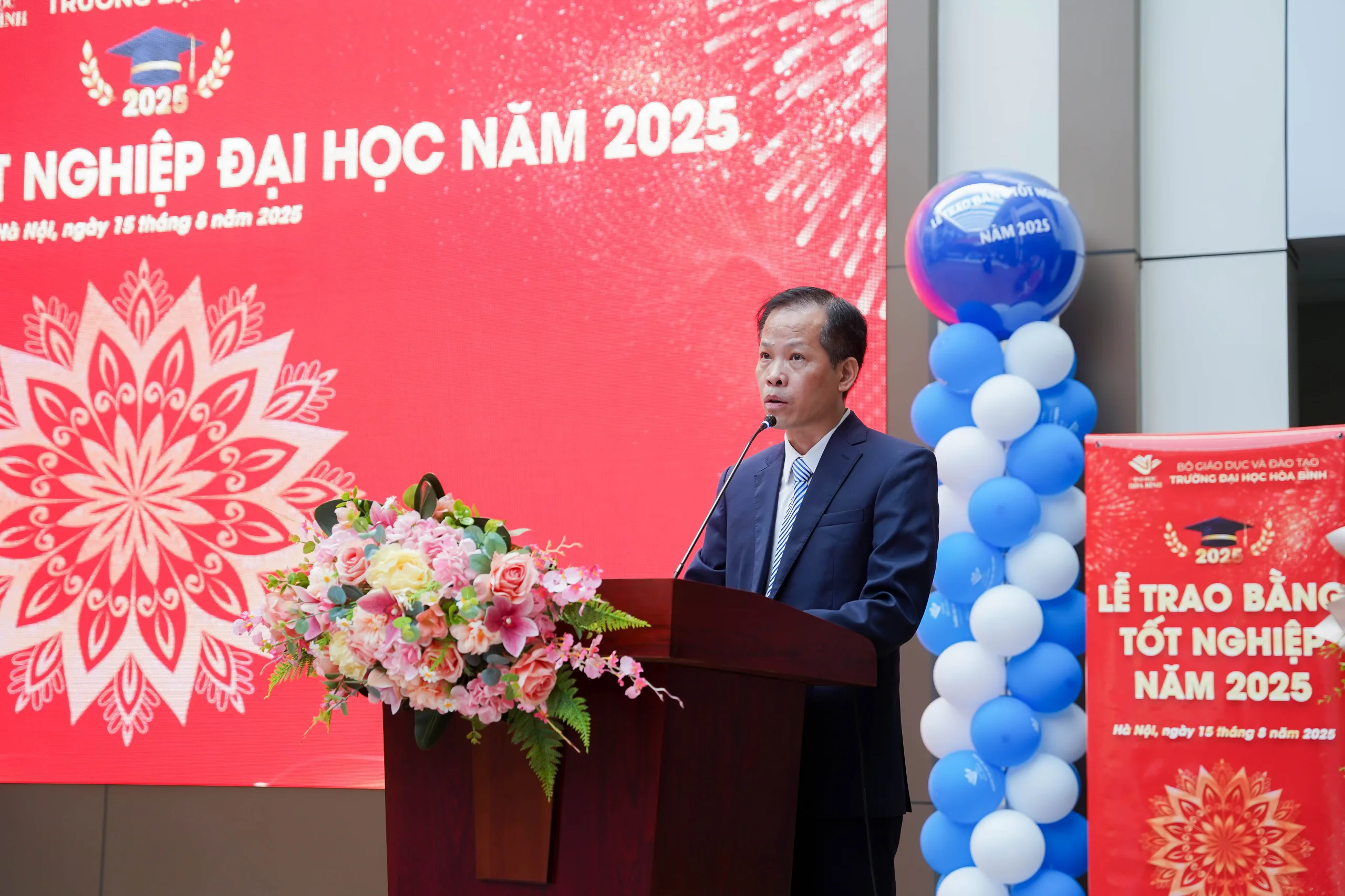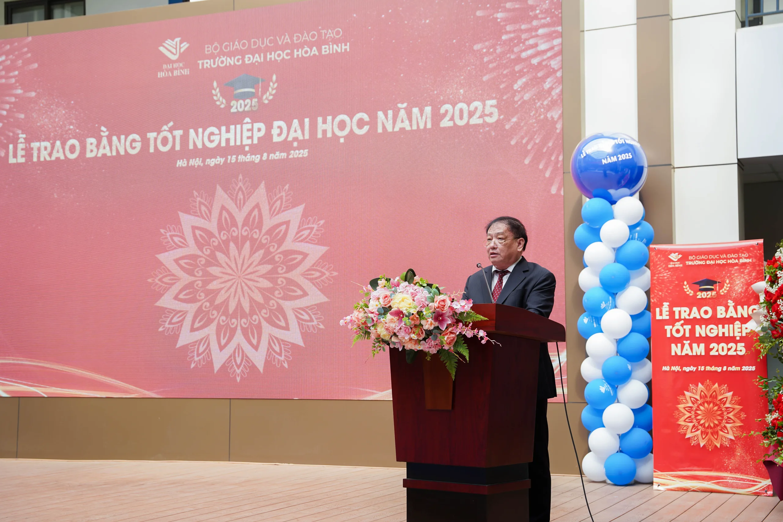 Trong không khí trang trọng và đầy cảm xúc, NGND.PGS.TS. Tô Ngọc Hưng – Phó Bí thư Đảng ủy, Hiệu trưởng nhà trường chia sẻ: “Buổi lễ tốt nghiệp hôm nay là dịp để tôn vinh những thành quả đáng tự hào trong chặng đường học tập quan trọng của các tân bác sĩ, dược sĩ, cử nhân Trường Đại học Hòa Bình. Đây là khoảnh khắc ý nghĩa, đánh dấu sự trưởng thành và thành công sau những năm tháng học tập miệt mài dưới mái trường.