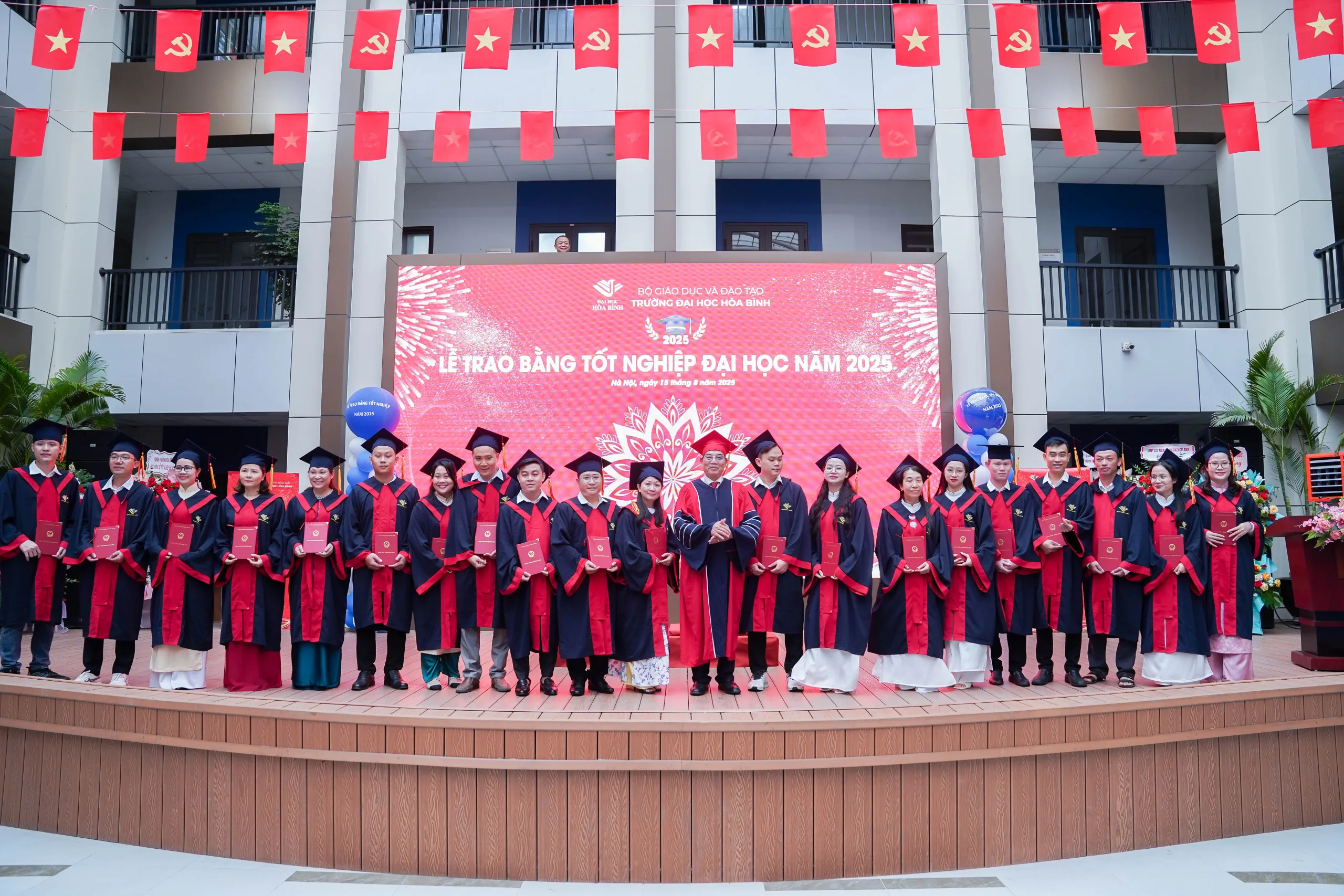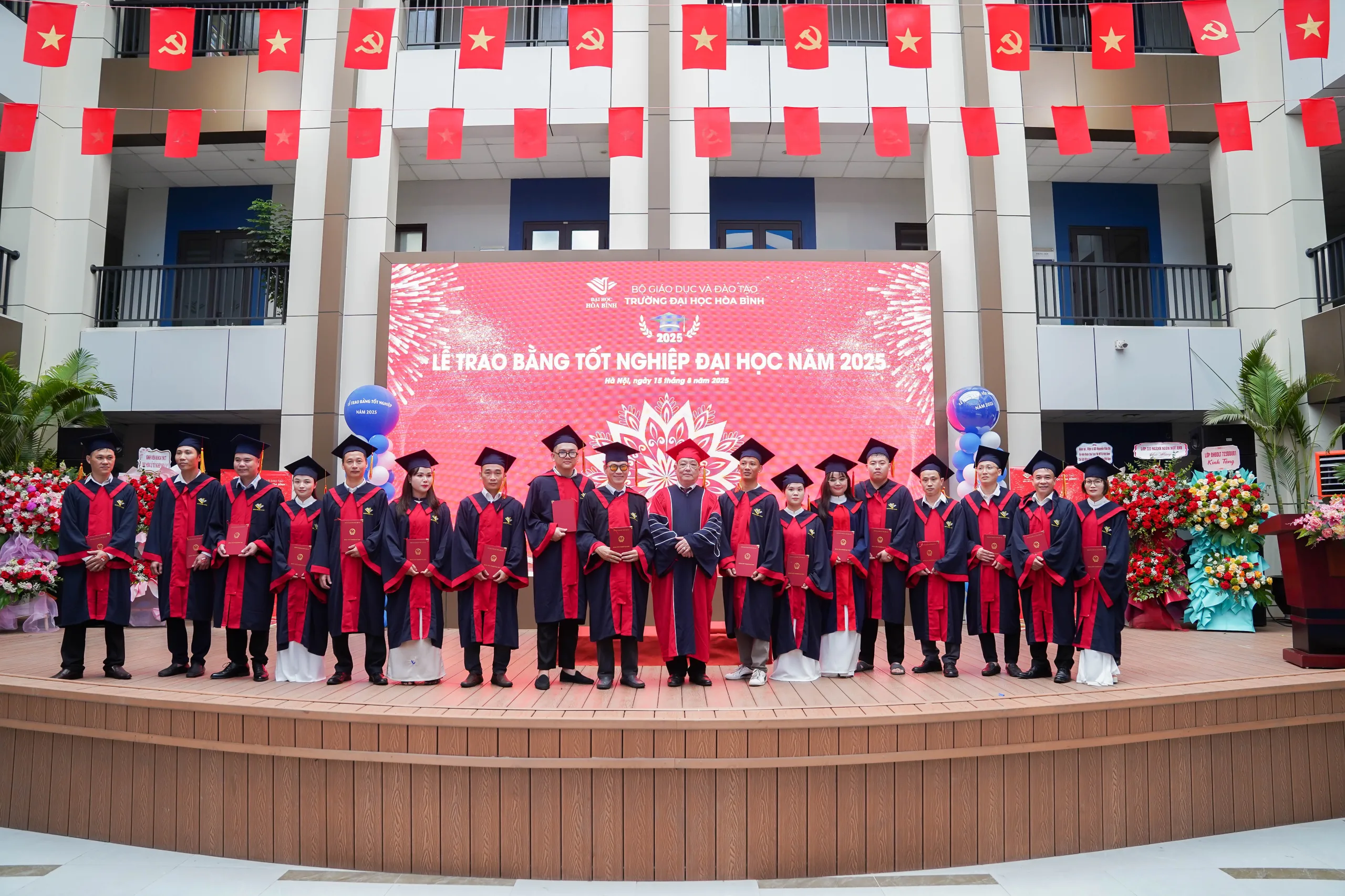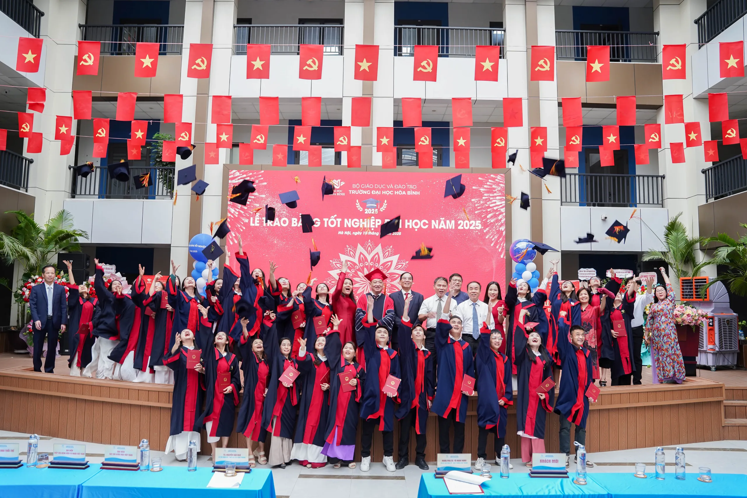 Sáng ngày 15/8/2025, Trường Đại học Hòa Bình đã long trọng tổ chức Lễ trao bằng tốt nghiệp năm 2025 cho 396 sinh viên thuộc 14 ngành đào tạo. Đây là lần đầu tiên Nhà trường trao bằng cho các bác sĩ tốt nghiệp, đánh dấu một mốc lịch sử quan trọng trong quá trình xây dựng và phát triển, góp phần cung cấp nguồn nhân lực y tế chất lượng cao phục vụ sự nghiệp chăm sóc và bảo vệ sức khỏe nhân dân.