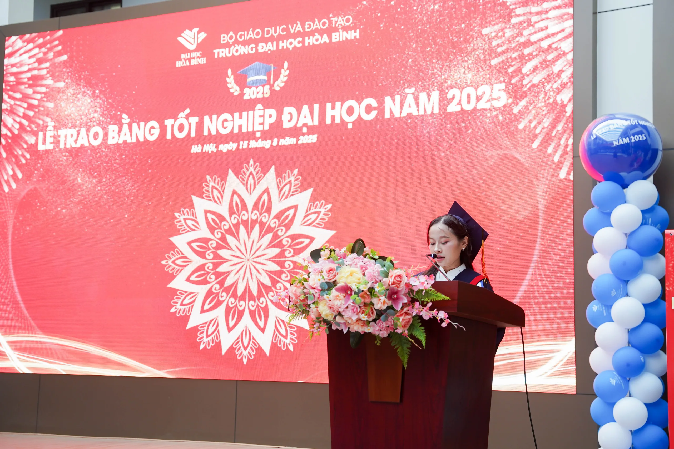 Đại diện cho 396 tân bác sĩ, dược sĩ, cử nhân, phát biểu tại buổi lễ, tân cử nhân Nguyễn Thị Trang, ngành Thiết kế Đồ họa, Trường Đại học Hòa Bình cũng gửi lời cảm ơn chân thành và sâu sắc nhất đến Đảng ủy, Hội đồng trường, Ban Giám hiệu, quý thầy cô và các cán bộ, nhân viên của nhà trường, những người đã không chỉ truyền đạt kiến thức và kỹ năng, mà còn truyền cảm hứng, nuôi dưỡng tinh thần trách nhiệm, đạo đức nghề nghiệp, và tình yêu với con đường mình đã chọn.“Trong suốt quá trình học tập tại Trường Đại học Hòa Bình, chúng em không chỉ tiếp thu kiến thức trong một môi trường hiện đại, mà còn được trải nghiệm thực tế, được rèn luyện bản lĩnh, và thấu hiểu giá trị của sự kiên trì, trách nhiệm, cũng như tình yêu với ngành nghề mà mình đã chọn.
