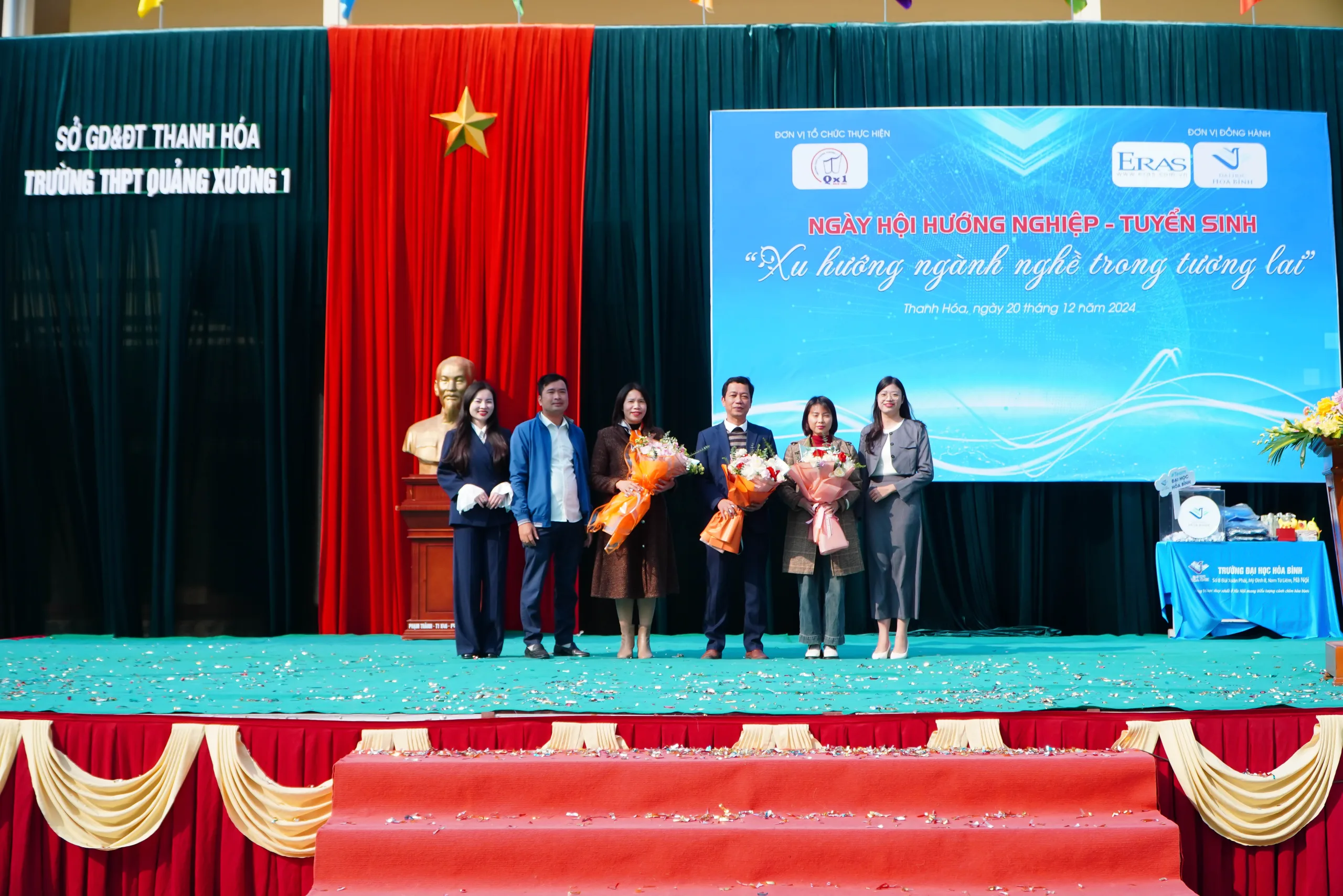 ThS. Lê Thị Trúc – Phó Trưởng phòng Tuyển sinh và truyền thông và Ths. Phan Thị Ninh – Trưởng Văn phòng đại diện Thanh Hóa, Chánh Văn phòng Hội đồng Trường cùng Ông Lê Bá Chinh – Quản lý khu vực ERAS Việt Nam tại Thanh Hóa tặng hoa cảm ơn Ban Giám hiệu Trường THPT Quảng Xương 1