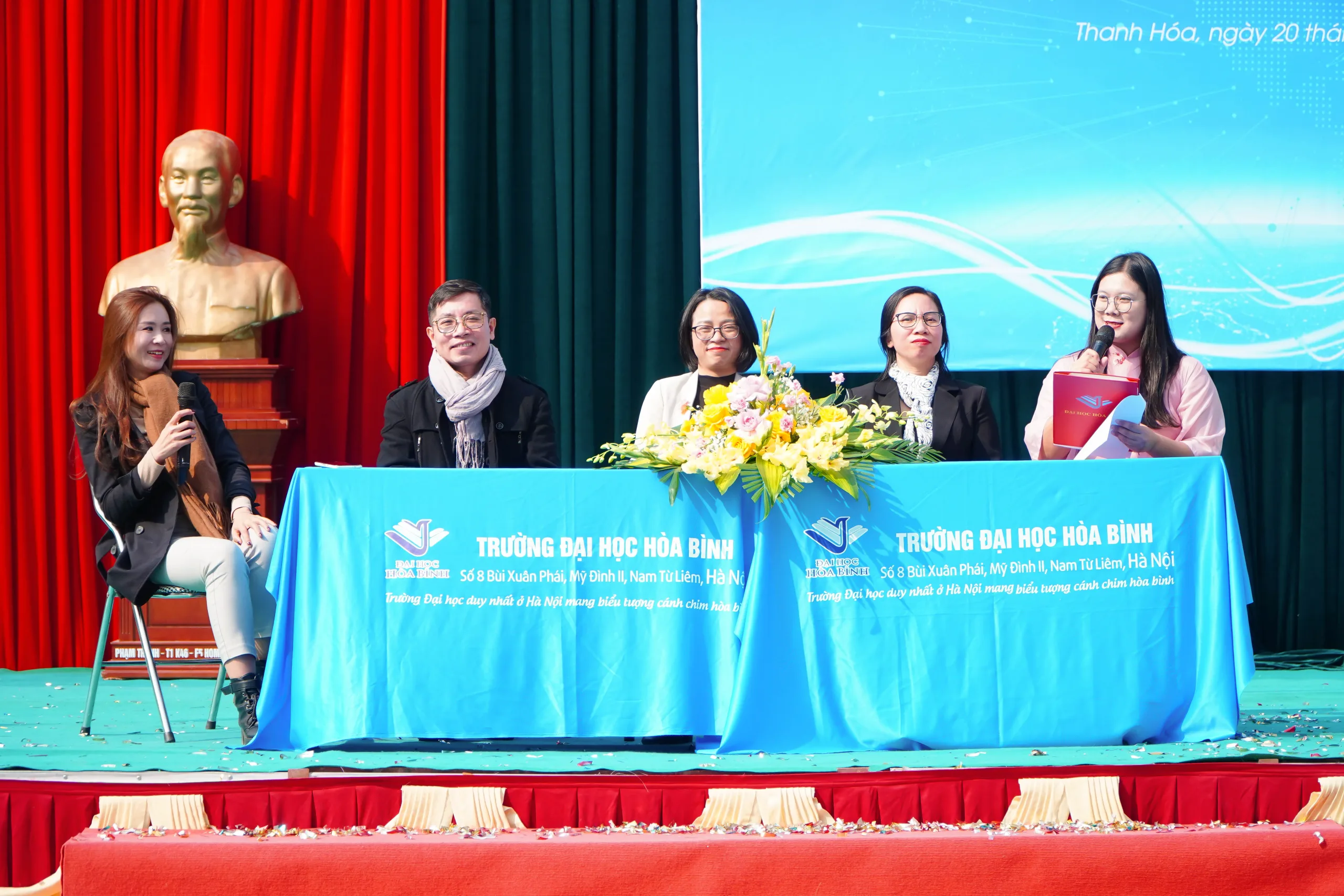 Trong khuôn khổ diễn ra sự kiện, các thầy cô là lãnh đạo các Khoa, ngành đào tạo, giảng viên của Trường Đại học Hòa Bình, gồm có ThS. Nguyễn Thị Lý – Phó Trưởng Khoa Quản trị Kinh doanh; ThS. Lê Văn Hùng – Phó Trưởng Khoa Mỹ thuật công nghiệp; TS. Trần Thị Hải Anh – Phó Trưởng Khoa phụ trách Tiếng Trung Quốc, ThS. Lưu Thị Tình – Giảng viên Khoa Tài chính ngân hàng – Kế toán đã chia sẻ những thông tin bổ ích, cơ hội chọn ngành, chọn trường phù hợp cho các em học sinh THPT năm học 2025 này.