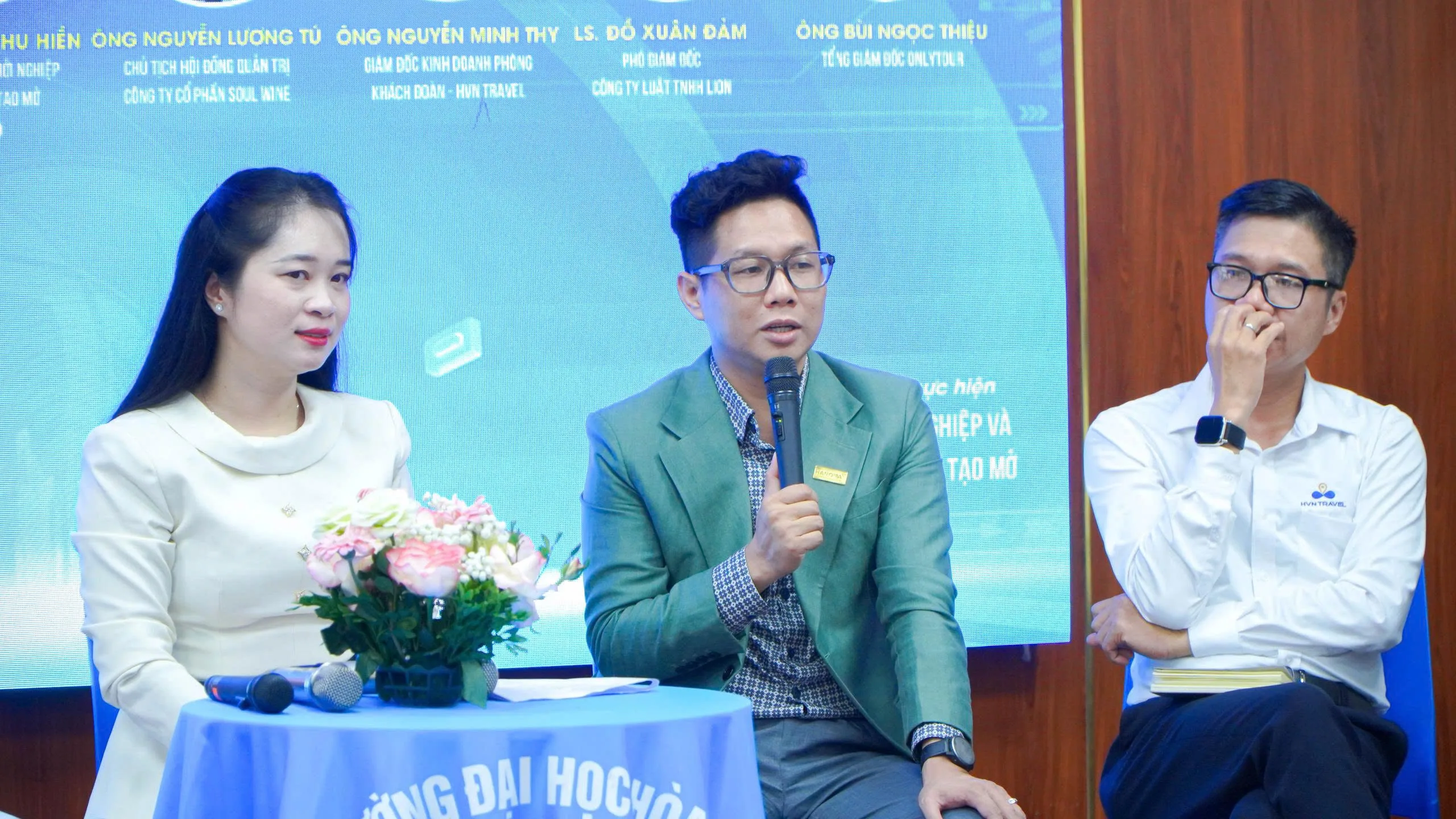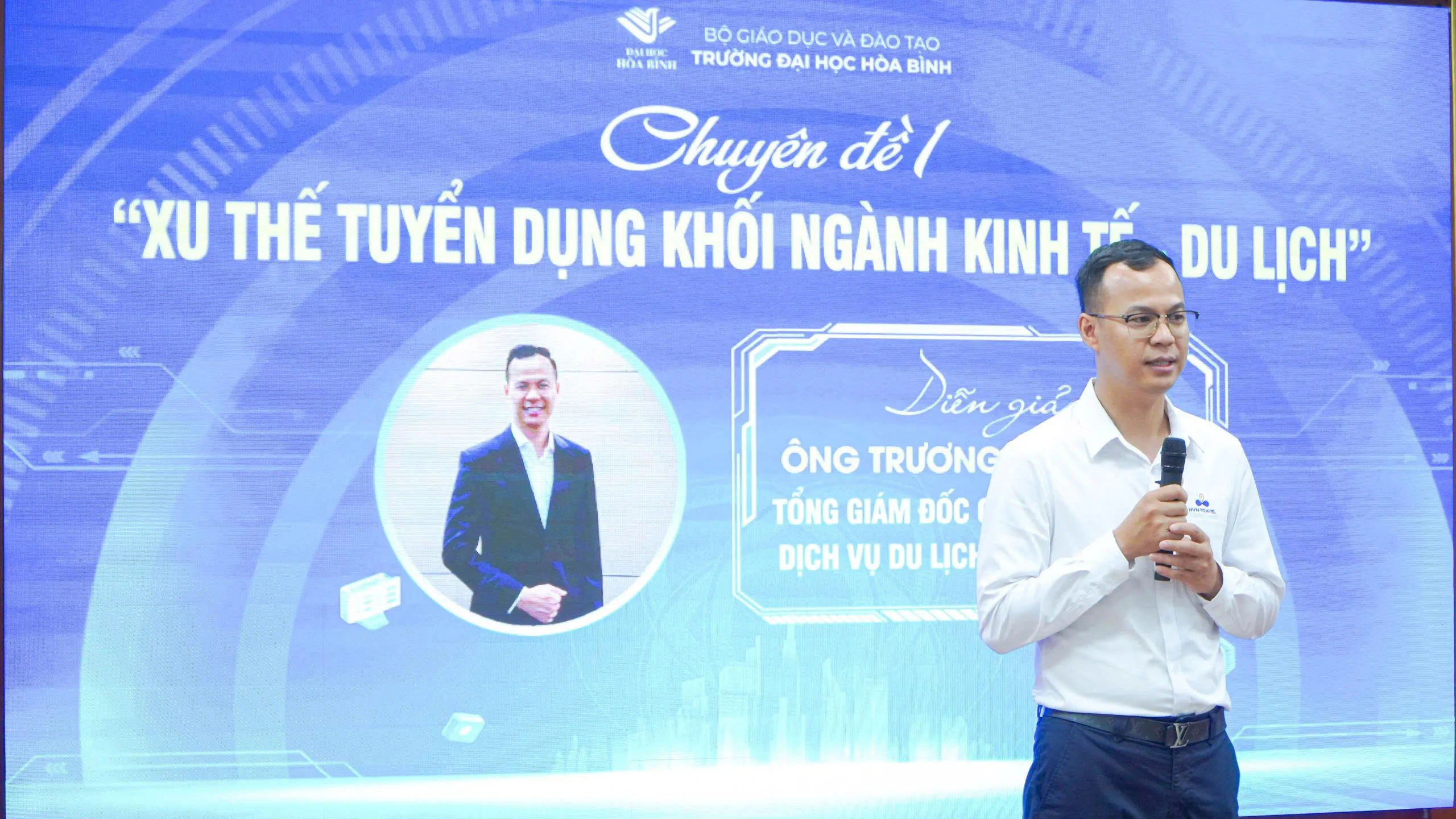 Trong chương trình, ông Trương Minh Tuấn – Tổng Giám đốc HVN Travel đã chia sẻ về “Xu thế tuyển dụng khối ngành Kinh tế – Du lịch” và những kỹ năng, tư duy cần thiết để sinh viên đáp ứng được nhu cầu của doanh nghiệp hiện nay.