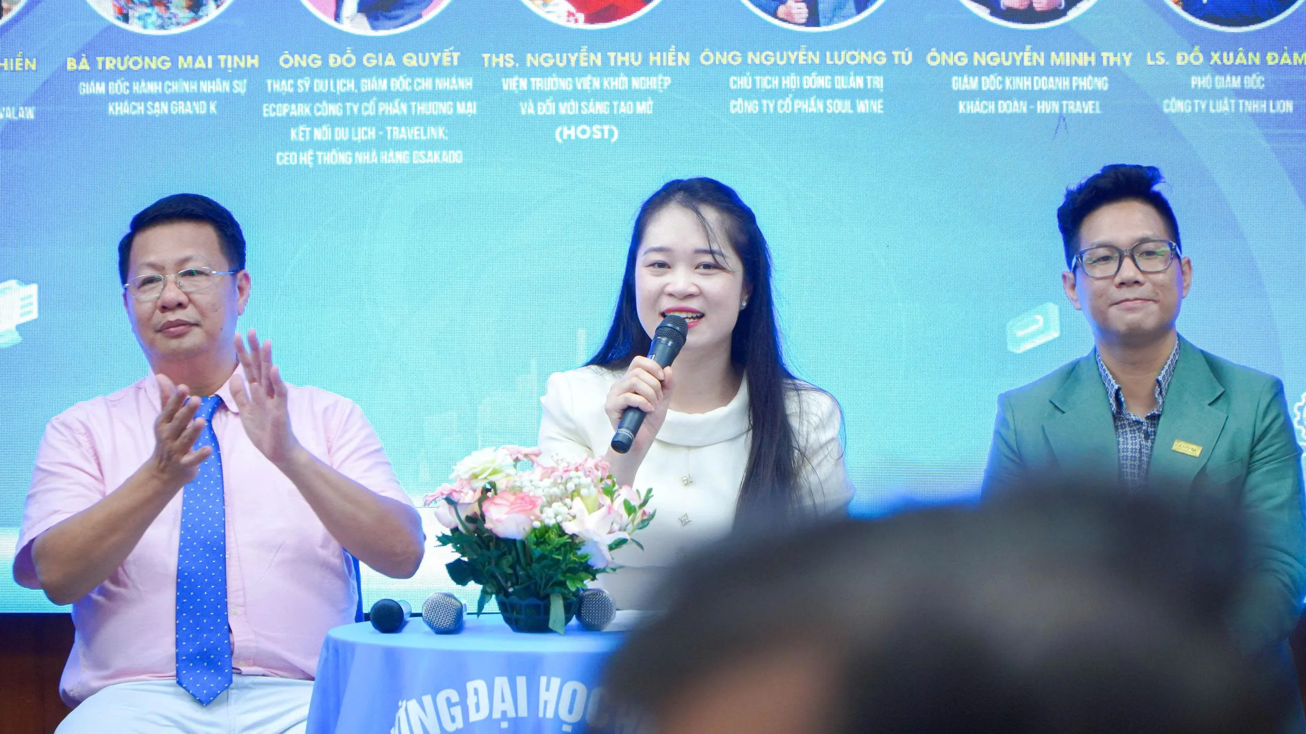 Điểm nhấn của chương trình là phần tọa đàm nghề nghiệp với sự tham gia của 8 diễn giả là các nhà tuyển dụng, chuyên gia giàu kinh nghiệm, được dẫn dắt bởi Thạc sĩ Nguyễn Thị Thu Hiền – Viện trưởng Viện Khởi nghiệp và Đổi mới sáng tạo Mở. Tọa đàm đã mang đến những thông tin thiết thực về cơ hội việc làm, các kỹ năng nghề nghiệp quan trọng và xu hướng phát triển của ngành Kinh tế – Du lịch trong tương lai.